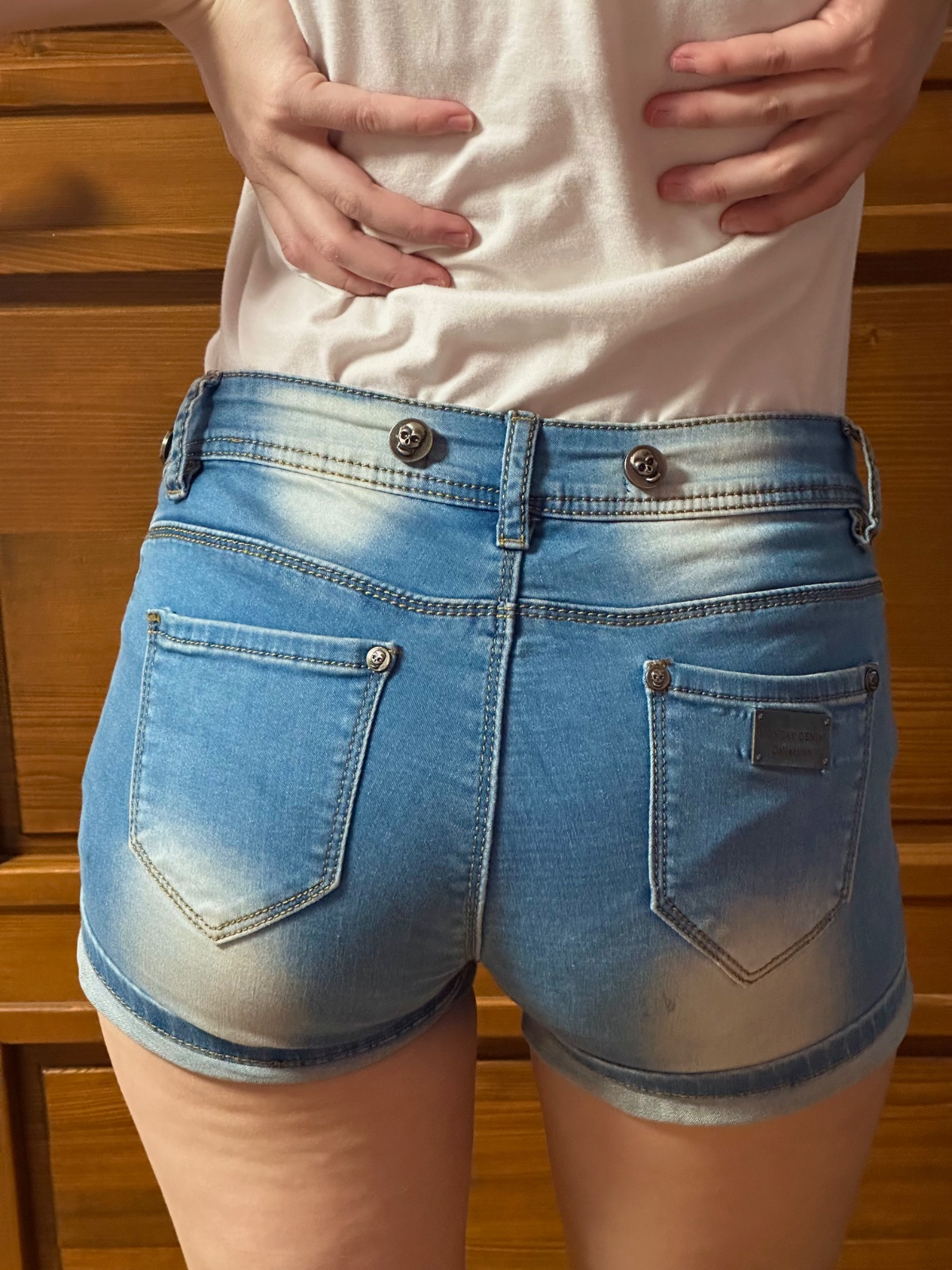 Výrazným prvkom sú kovové gombíky a nity s motívom lebiek, ktoré dodávajú šortkám originálny a rebelský vzhľad. Na prednej strane sú ozdobné zipsy, zadné vrecko je doplnené kovovou platničkou. Zapínanie je klasické na zips a gombík.