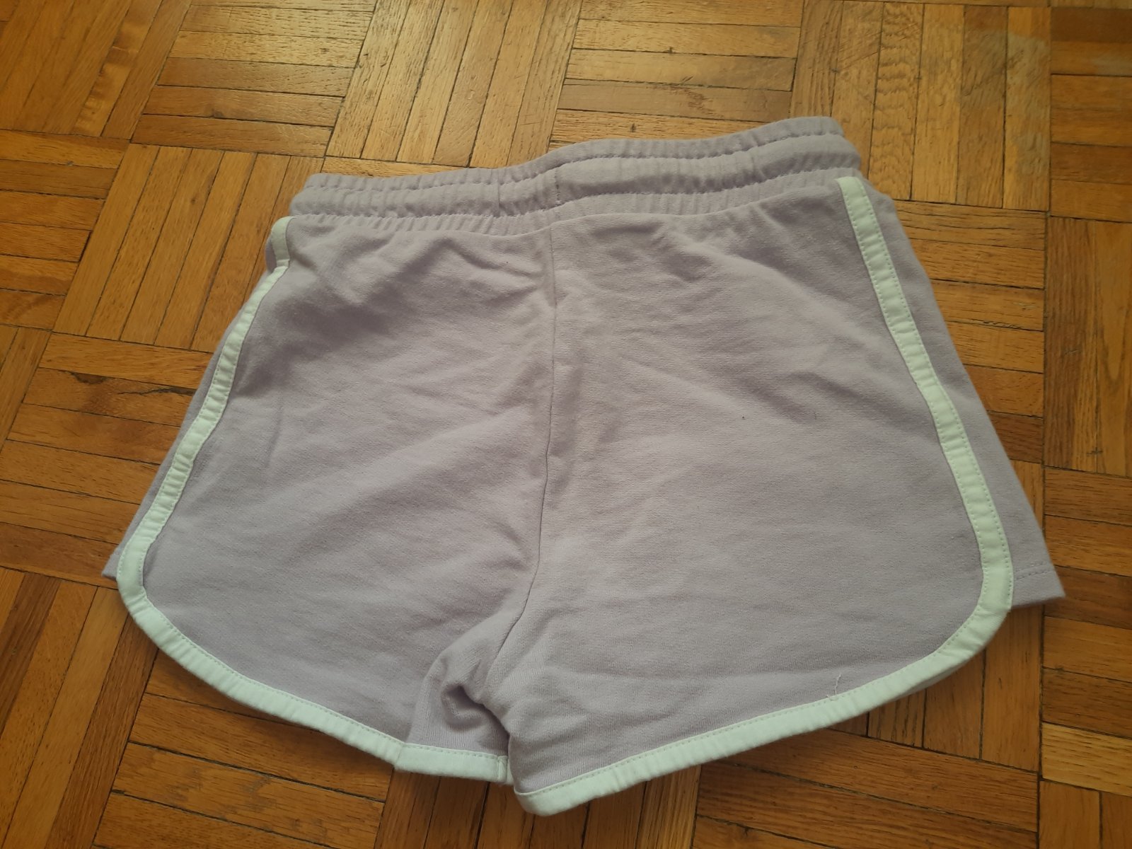 Pekné bavlnené šortky jemne fialovej farby. Sú olemované bielym pásikom. Pás na gumu a šnúrku.