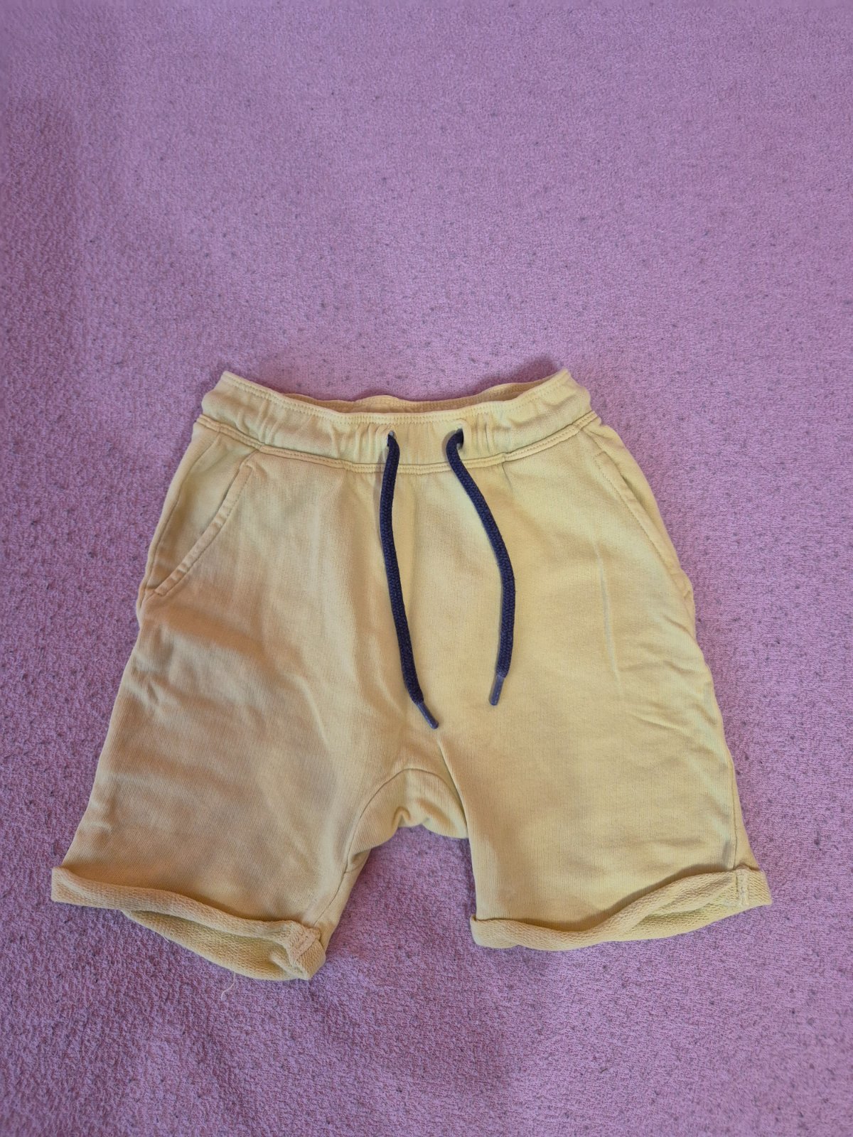 Predam krasne zlte kratasky velkost 104, material podobny riflovine, na vek 3-4 roky, malinko nosene oblecene asi 2 krat, Top stav. Pas je variabilny da sa stiahnut