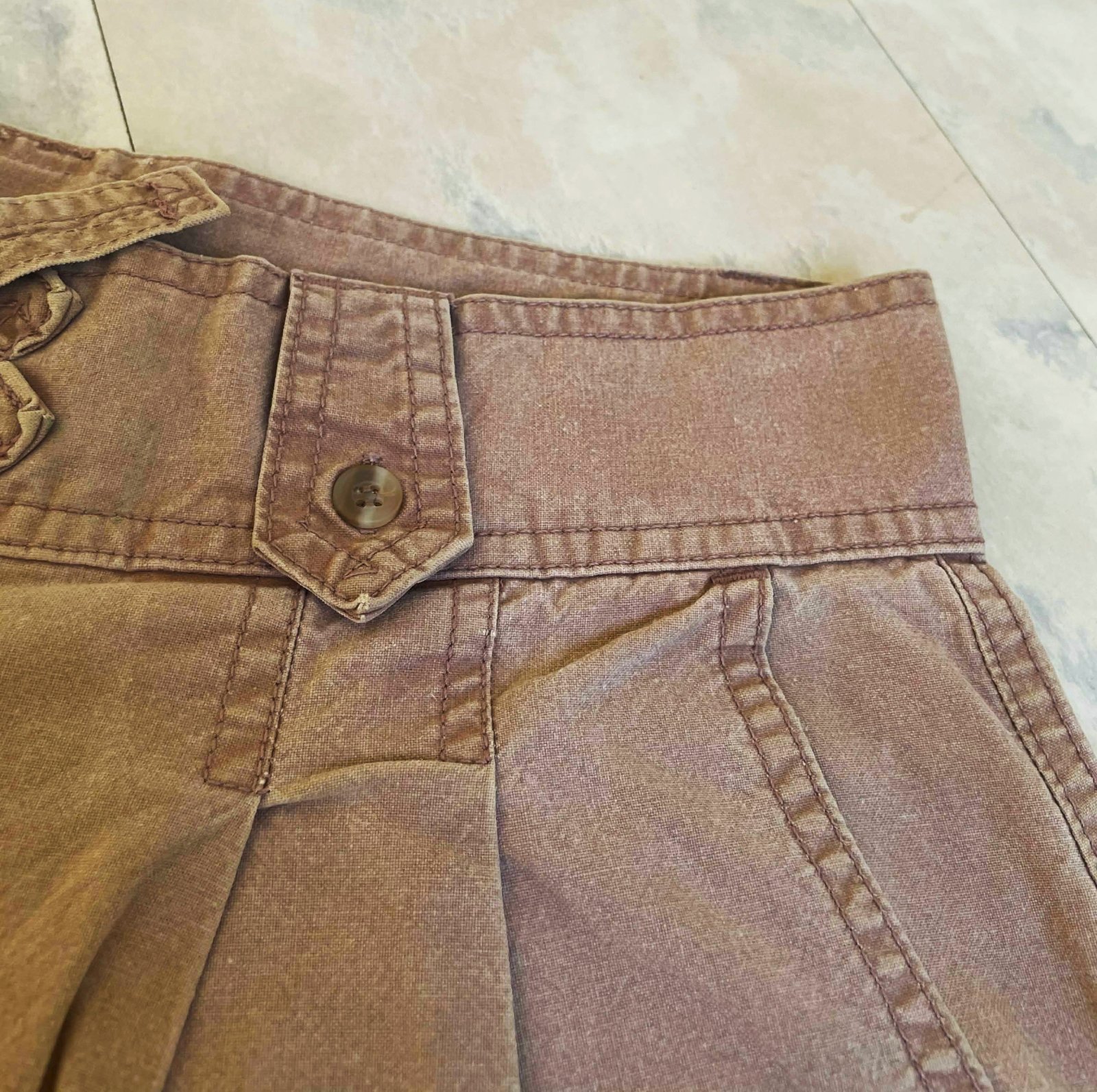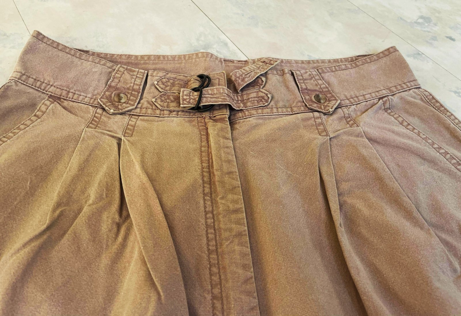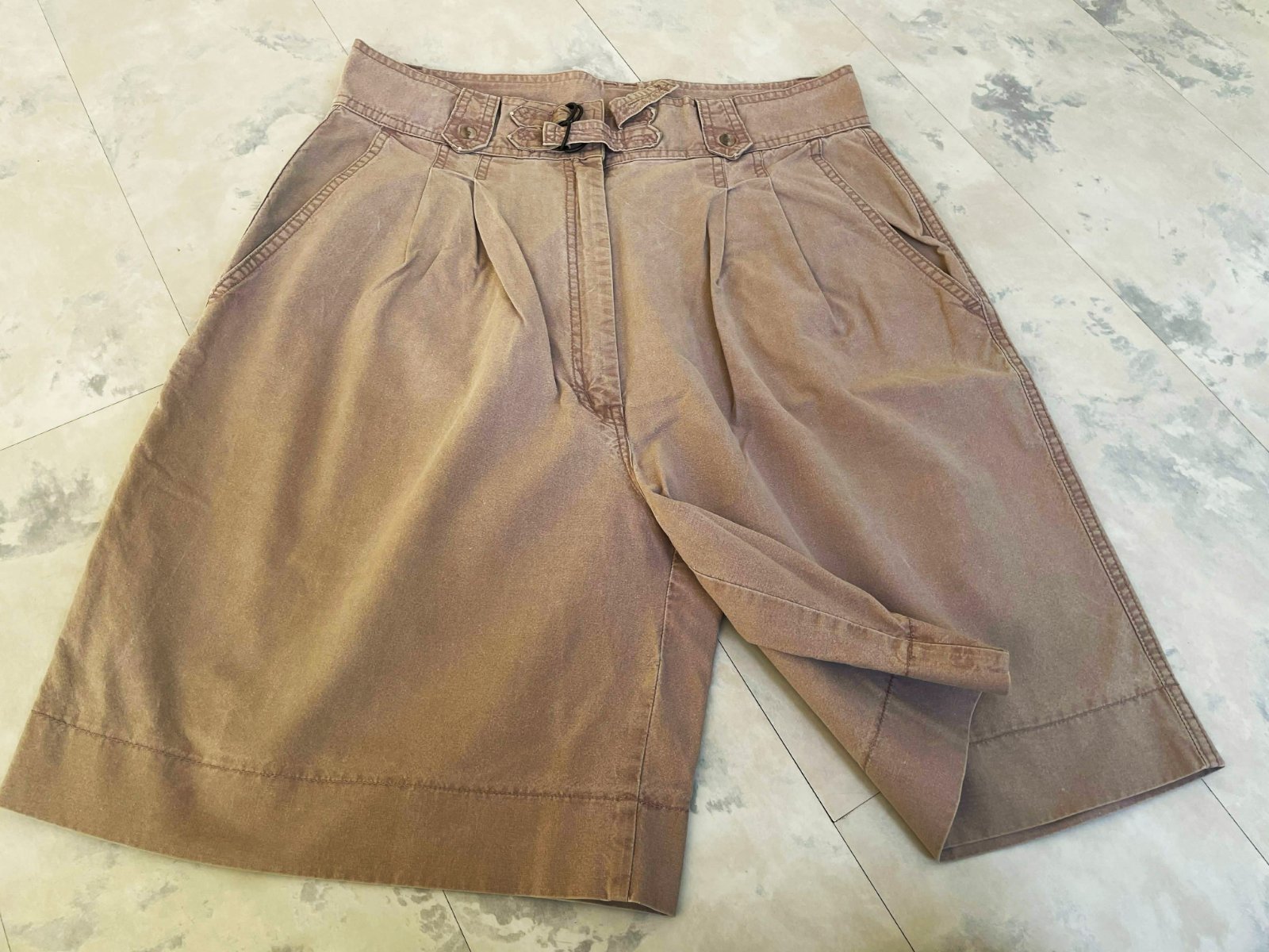 bavlnené plátenné bermudy po kolená s vysokým pásom,dvojitým zapínaním na pracky a prednými záhybmi,materiál jemne spraného vzhľadu - vintage,super sedia na postave,veľmi moderné a zaujímavé,vyzerajú podobne ako nohavicová sukňa,super na leto - vzdušné a nie je v nich horúco,značka Woolrich - vyfotená