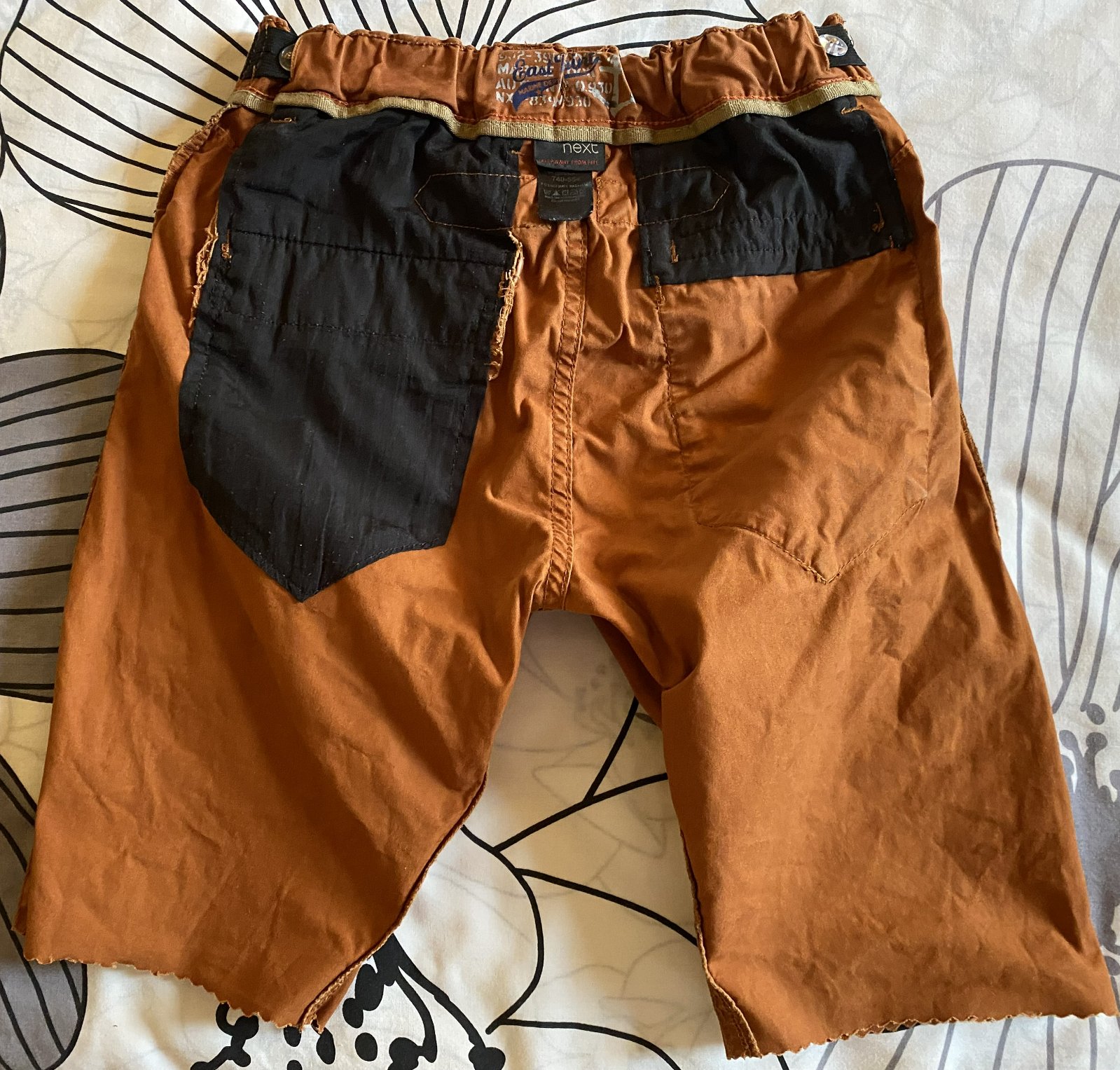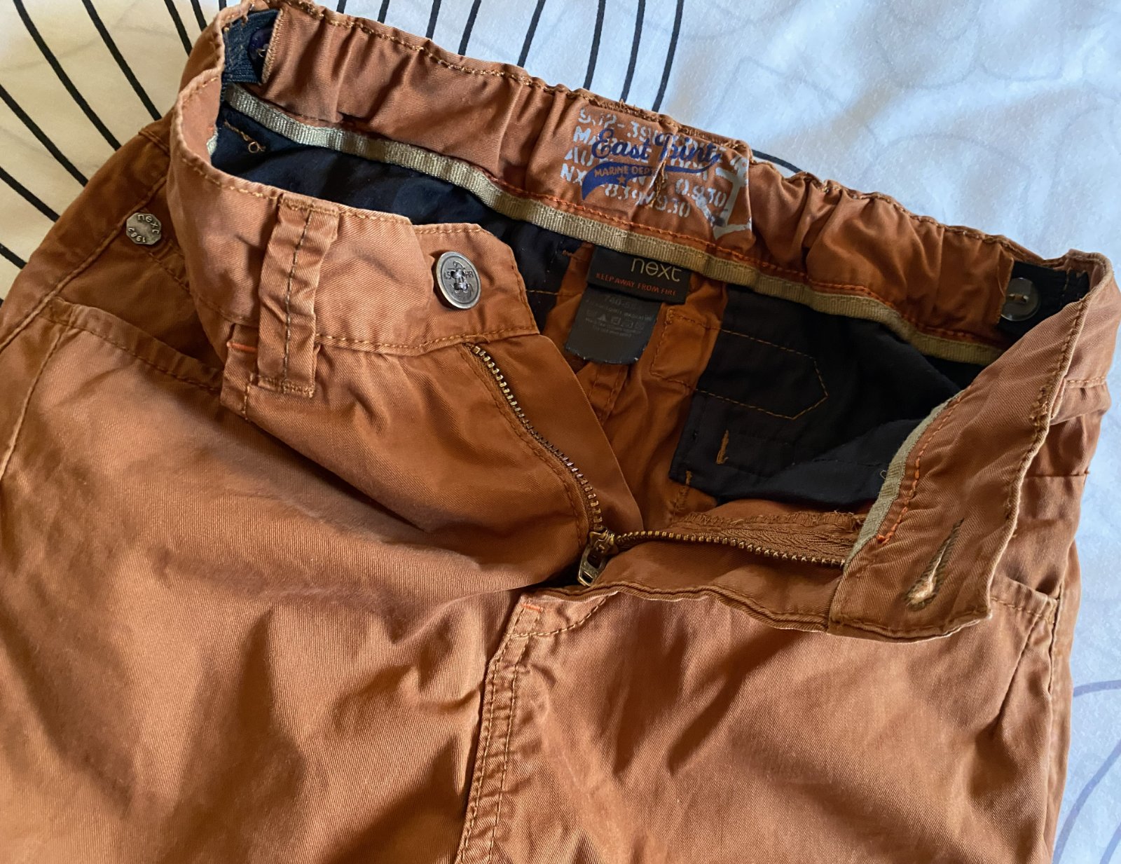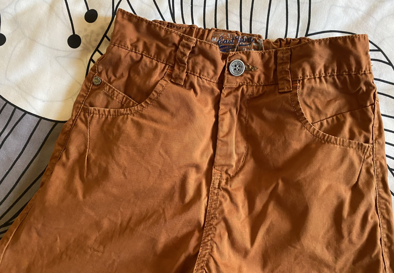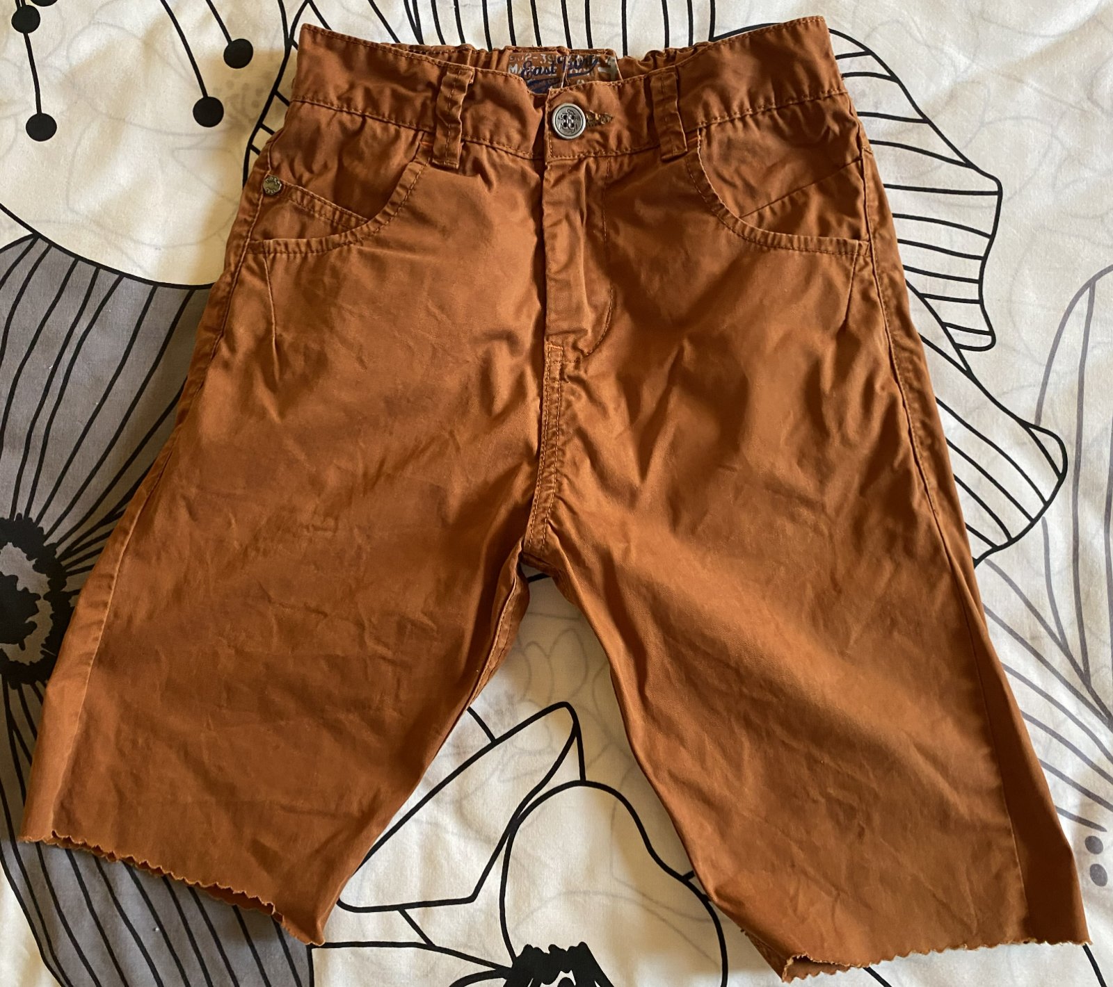 Krátke bavlnené nohavice Next v. 128, kvalitne prepracované, kopa pekných funkčných detailov, v páse regulovanie, pekná nevypratá farba, málo nosené na striedačku s inými. Pôvodne boli dlhé, podarila sa diera na kolene - odstrihnuté a upravené "cik-cak krajčírskymi nožnicami.