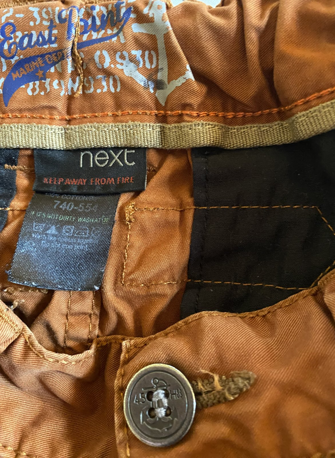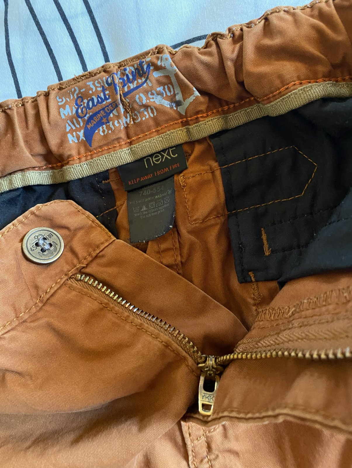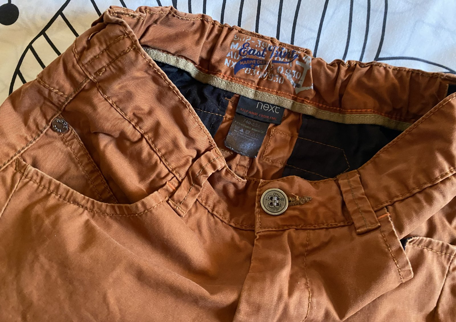 Krátke bavlnené nohavice Next v. 128, kvalitne prepracované, kopa pekných funkčných detailov, v páse regulovanie, pekná nevypratá farba, málo nosené na striedačku s inými. Pôvodne boli dlhé, podarila sa diera na kolene - odstrihnuté a upravené "cik-cak krajčírskymi nožnicami.