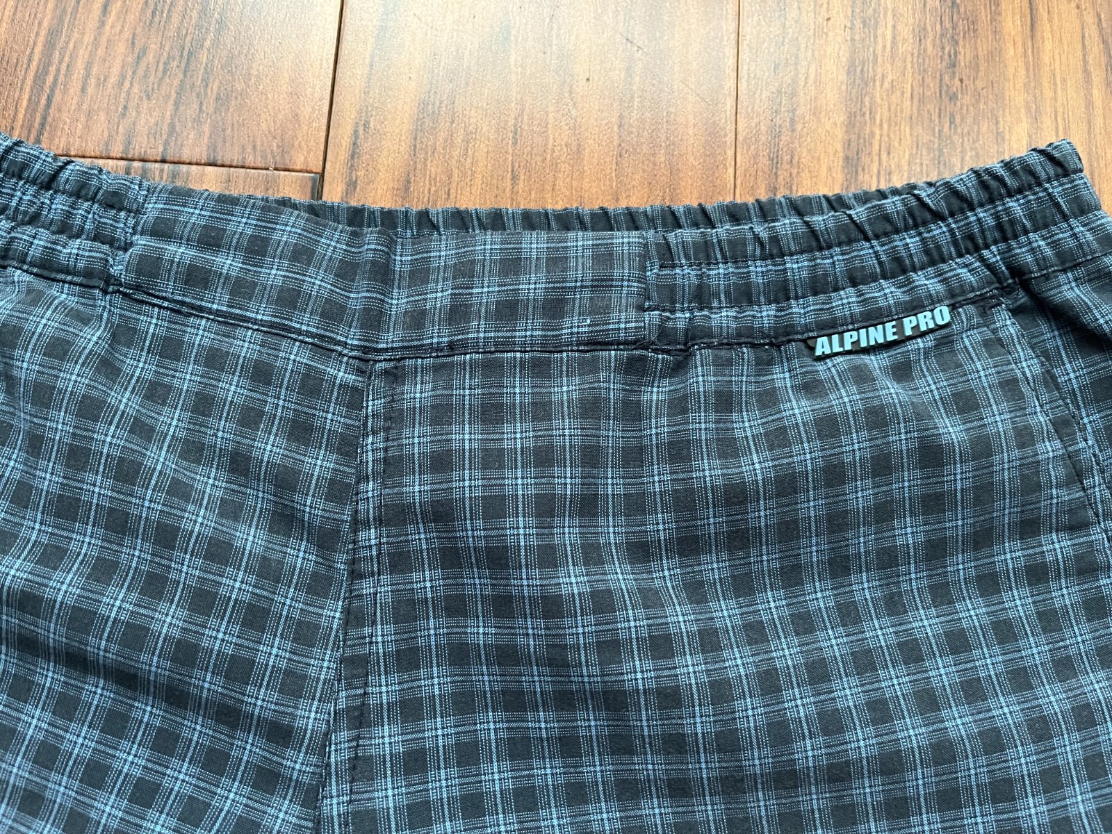 Športové kraťasy, kockované modrá/čierna, značka Alpine Pro. Veľkosť S. V páse guma, dve bočné vrecká. Pás 38cm, dĺžka nohavice 30cm. Šírka nohavice 30cm. Zloženie 68% bavlna, 32% polyester