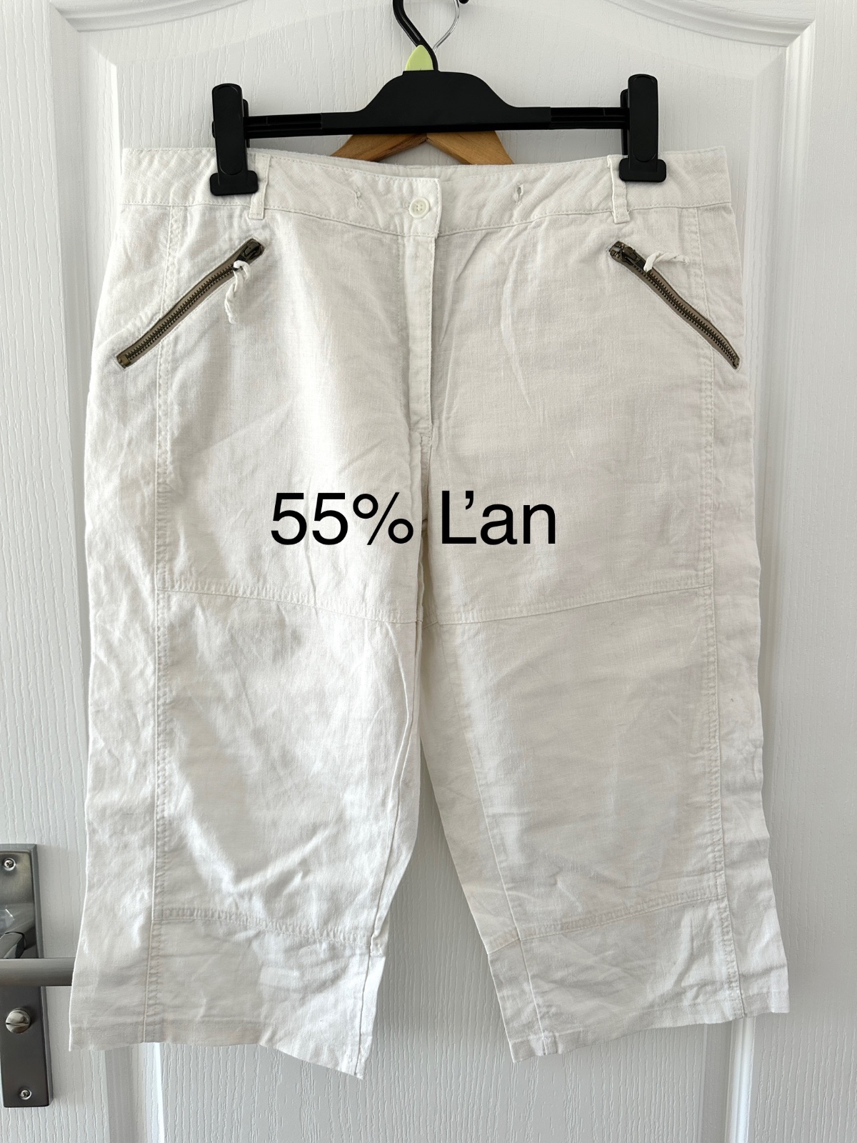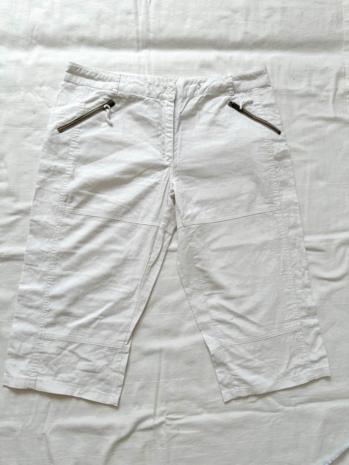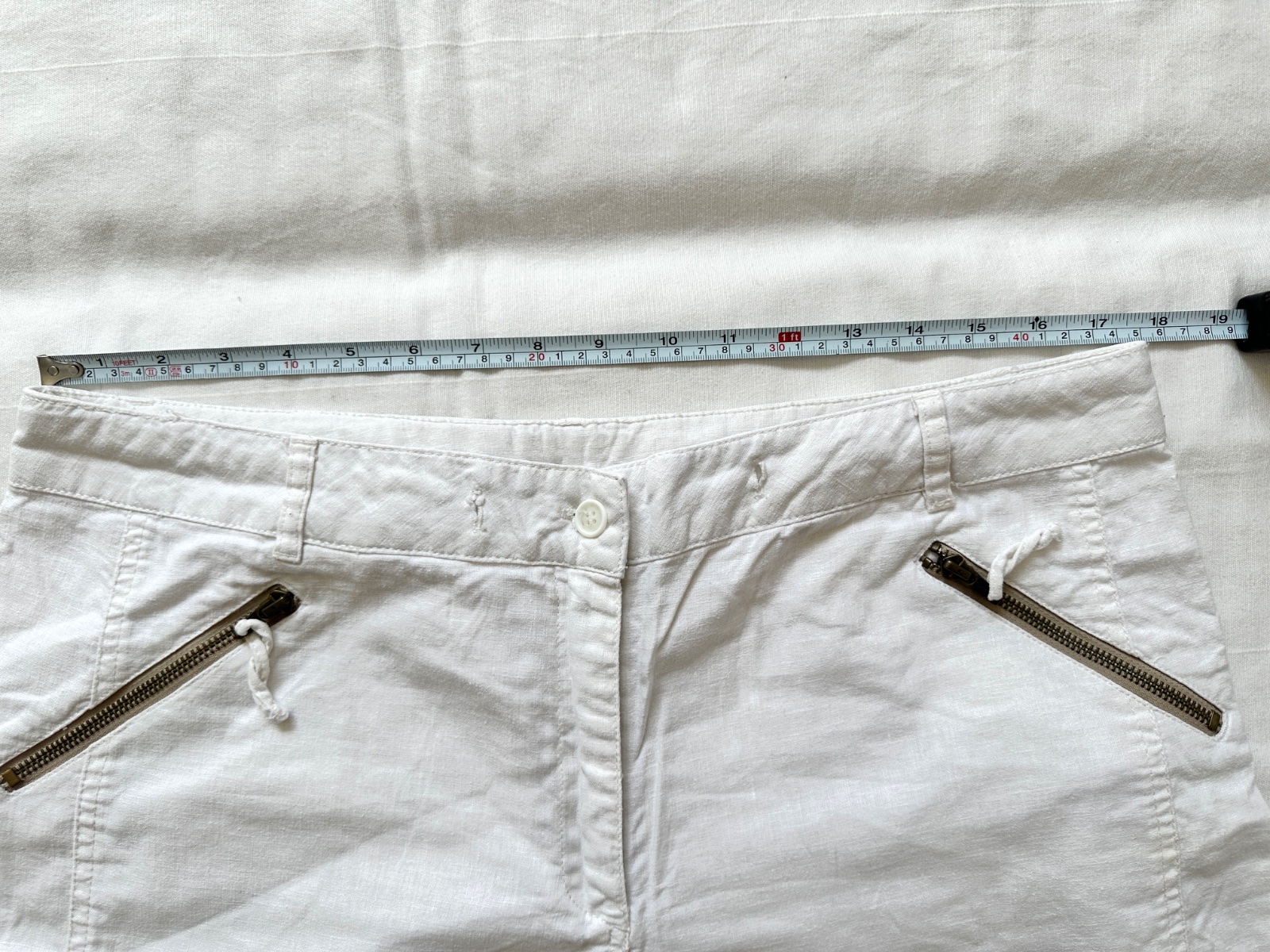 Ľanové nohavice v 3/4 dĺžke v bielej farbe. Majú vrecká na zips, stredne vysoký pás a ozdobné prešívanie. Sú vyrobené z 55 % ľanu a 45 % bavlny. Veľkosť na etikete je 42/44; všetky miery sú na fotografiách.