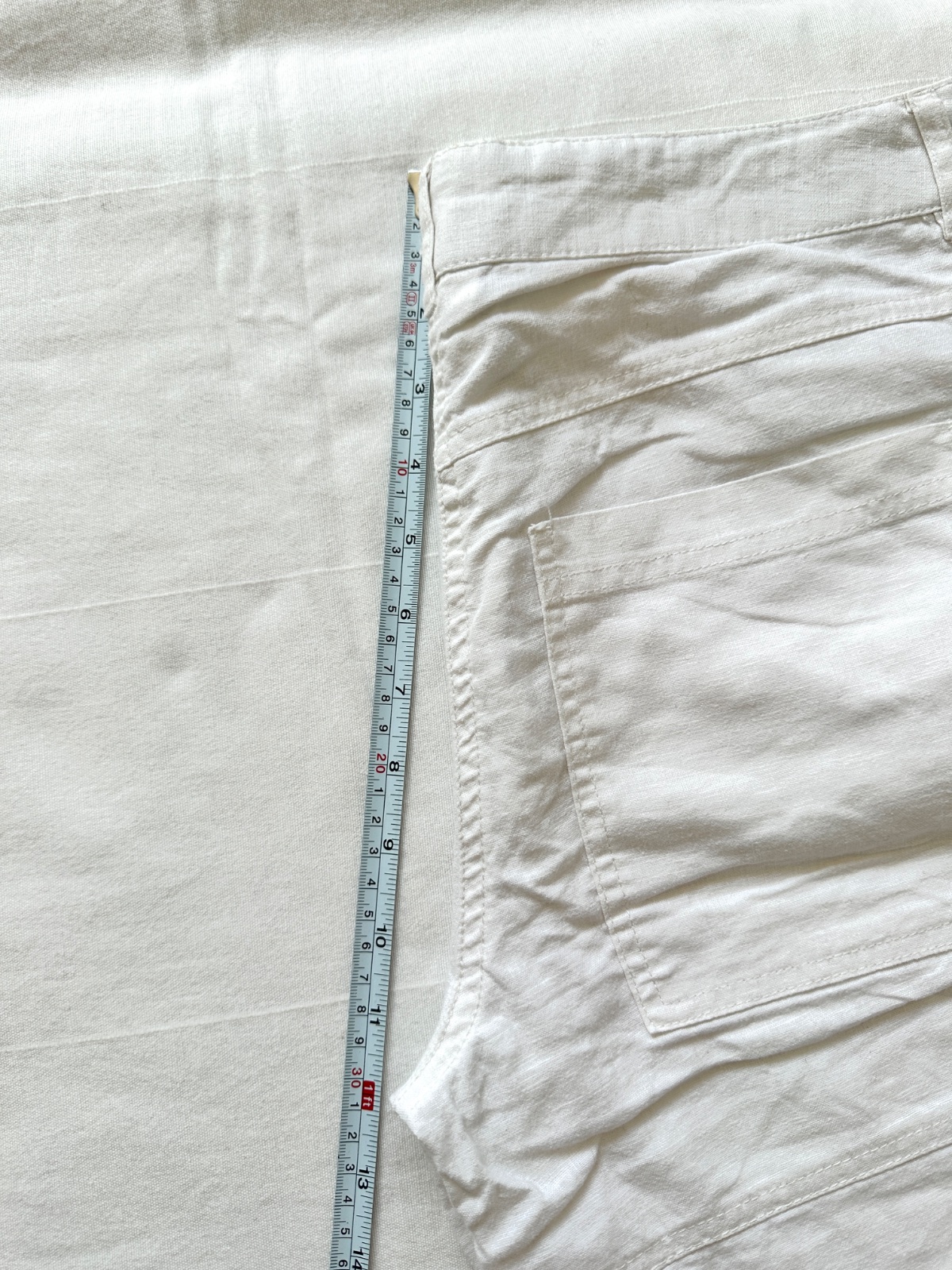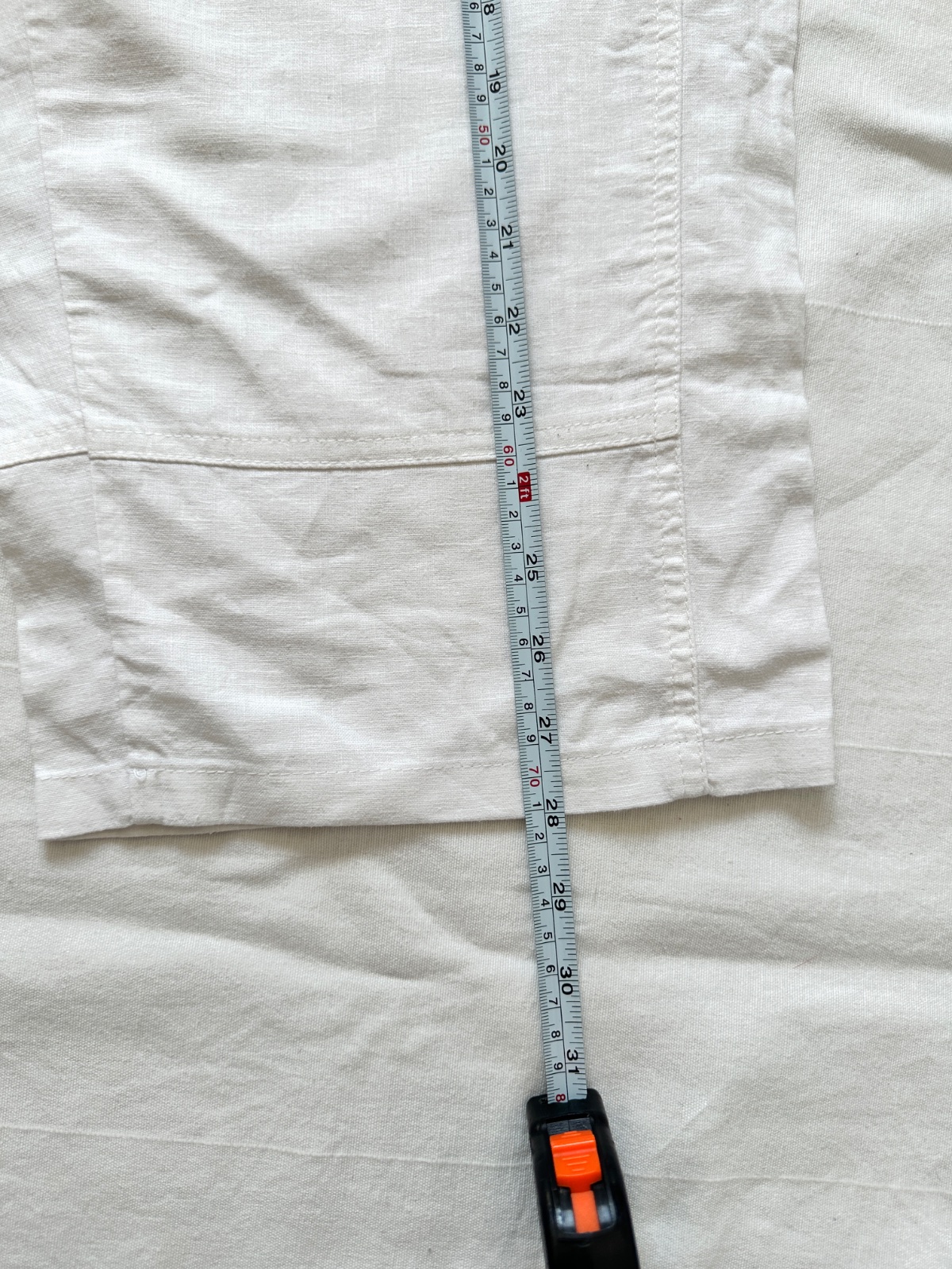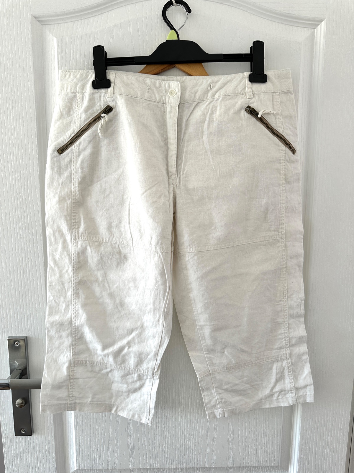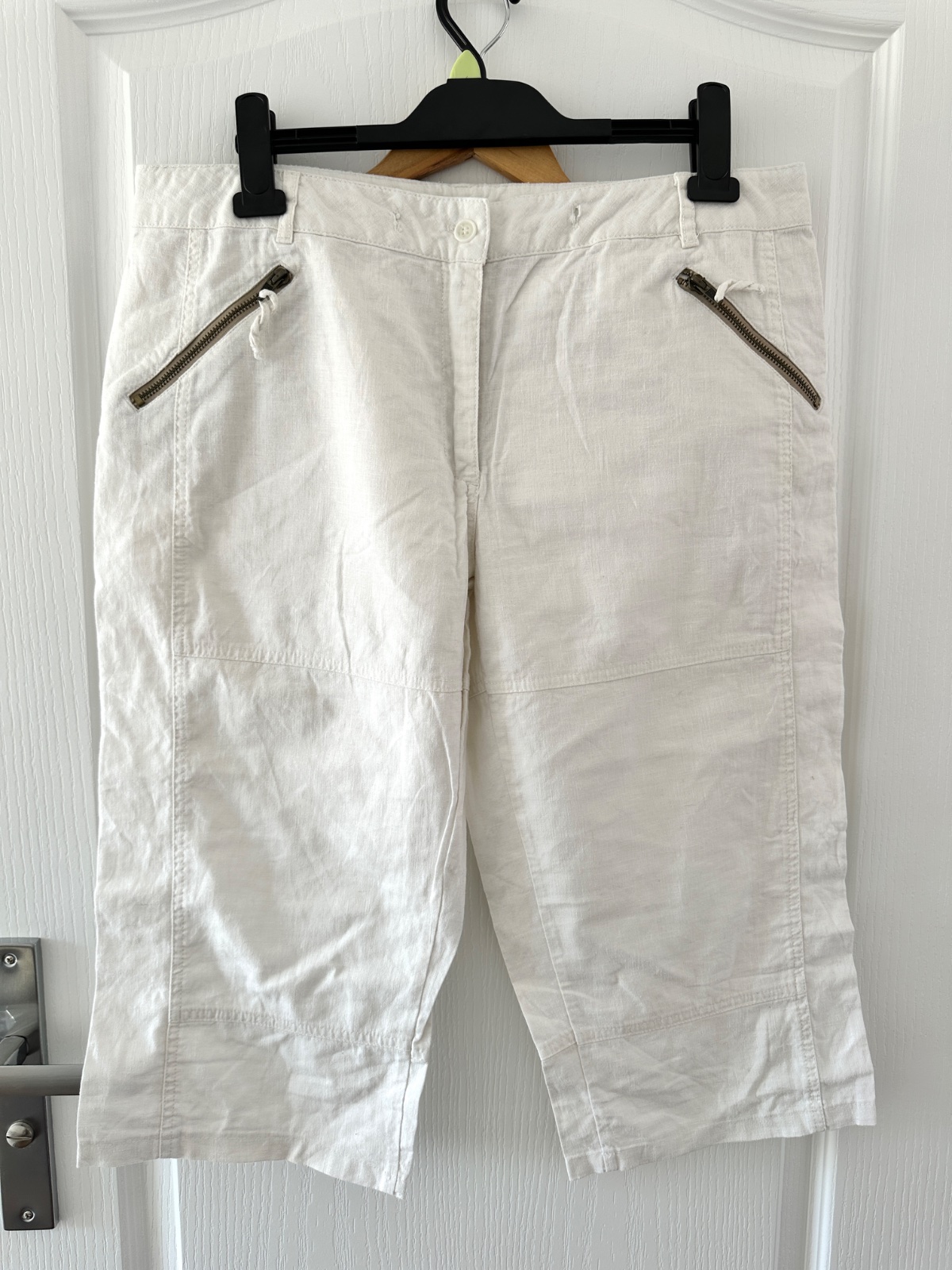 Ľanové nohavice v 3/4 dĺžke v bielej farbe. Majú vrecká na zips, stredne vysoký pás a ozdobné prešívanie. Sú vyrobené z 55 % ľanu a 45 % bavlny. Veľkosť na etikete je 42/44; všetky miery sú na fotografiách.