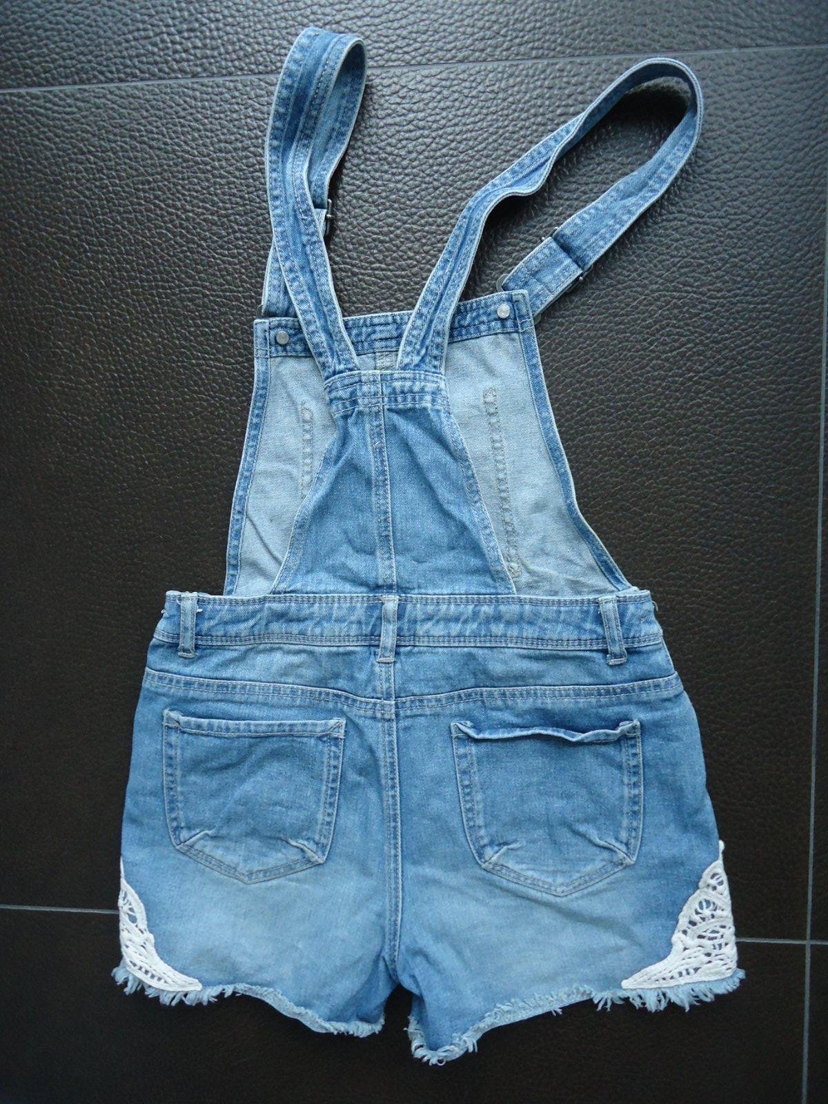 Riflove sortky s naprsenou a trakmi, na boku nohavice aplikacia z bielej krajky. stredne hruba pevnejsia riflovina...super stav, bez chyby...pas s regulacnou gumou cca 35, bocna dlzka nohavice 28cm