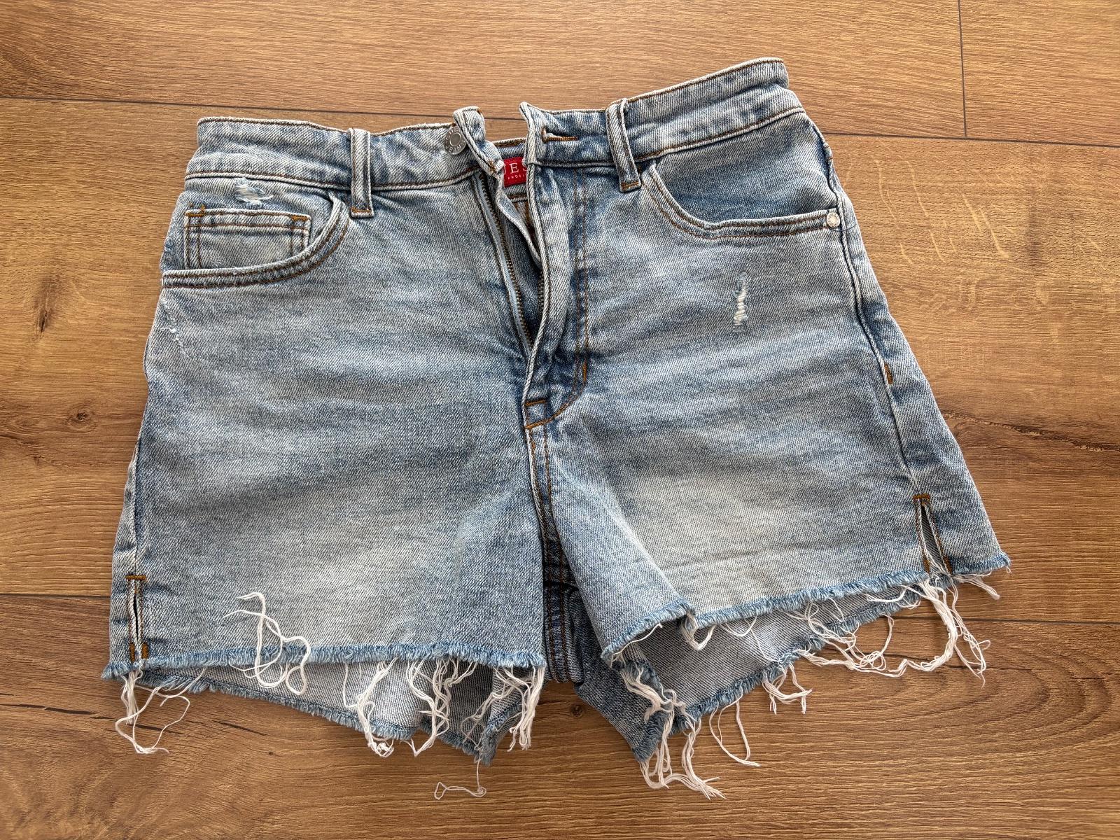 Bez známok nosenia, nepruzny denim, veľkosť 28,sedia na XS /S, pás 36 cm, predný sed 22 cm, bočná dĺžka 22 cm
