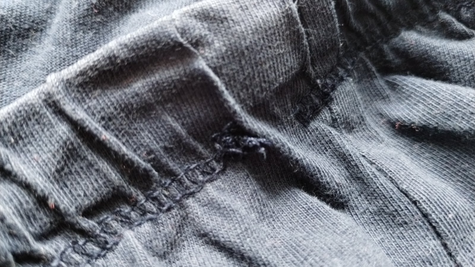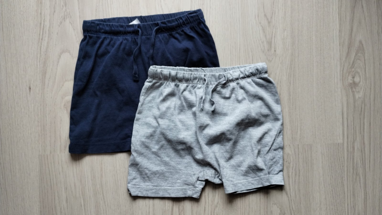 Bavlnené, funkčná šnúrka. Majú známky nosenia - tmavomodré majú kúsok vypáranej nitky a šedé majú na zadku zašitú dierku.