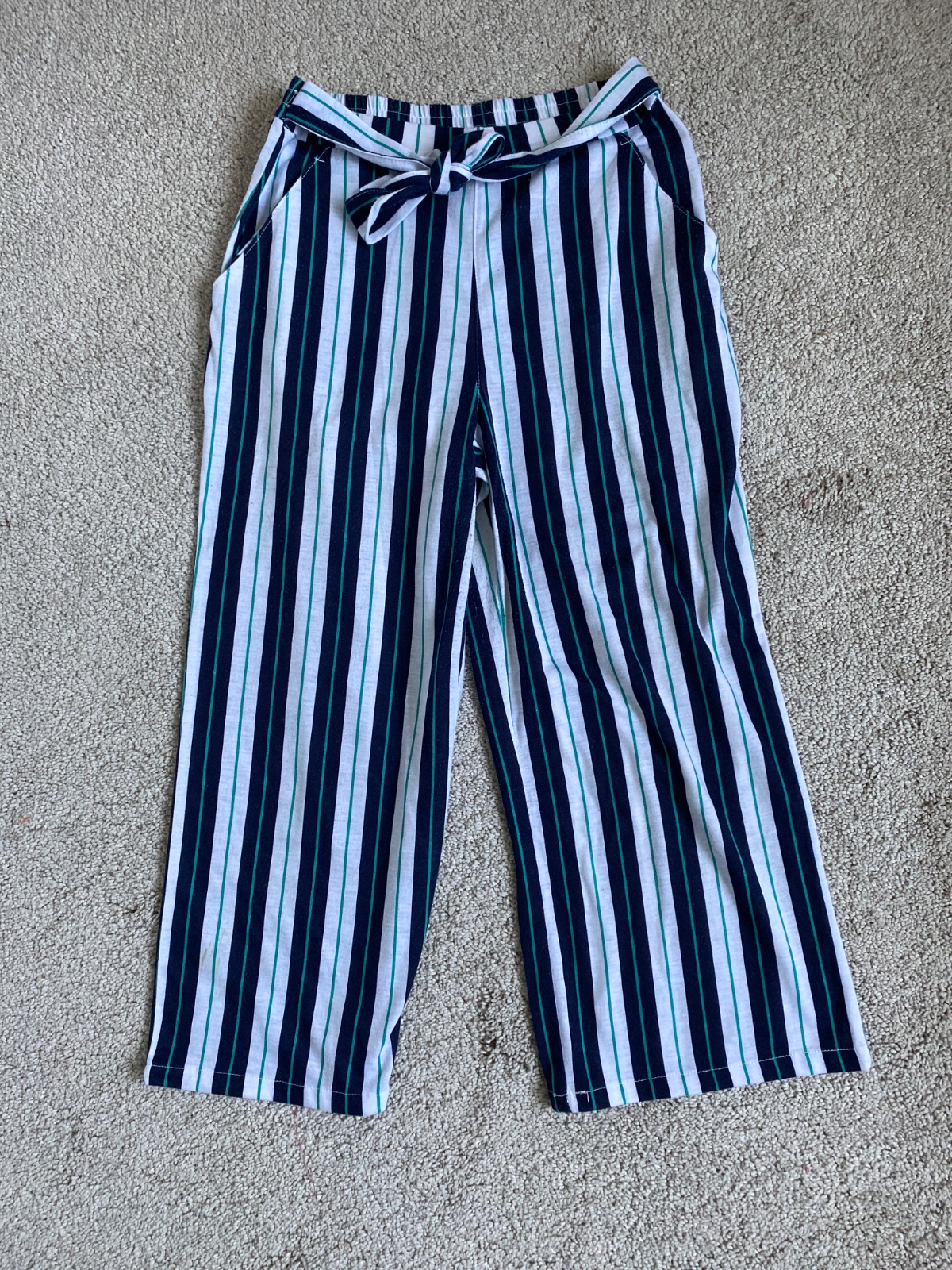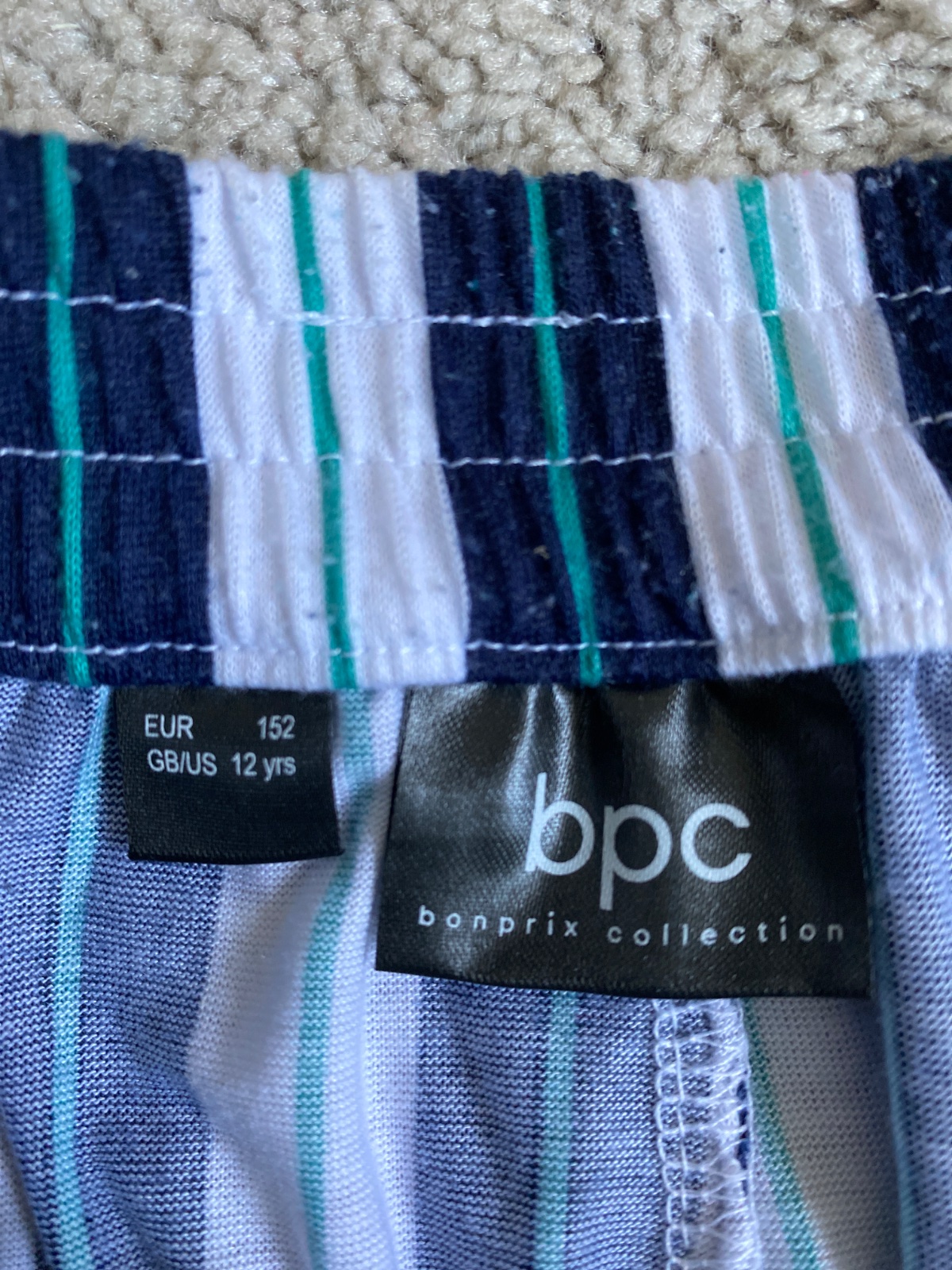 3/4 nohavice alebo členkové, veľkosť písaná 152 ale za mňa kľudne aj od 146. Pásiky sú bielo tmavomodré s tenkými zelenými. Známky používania.