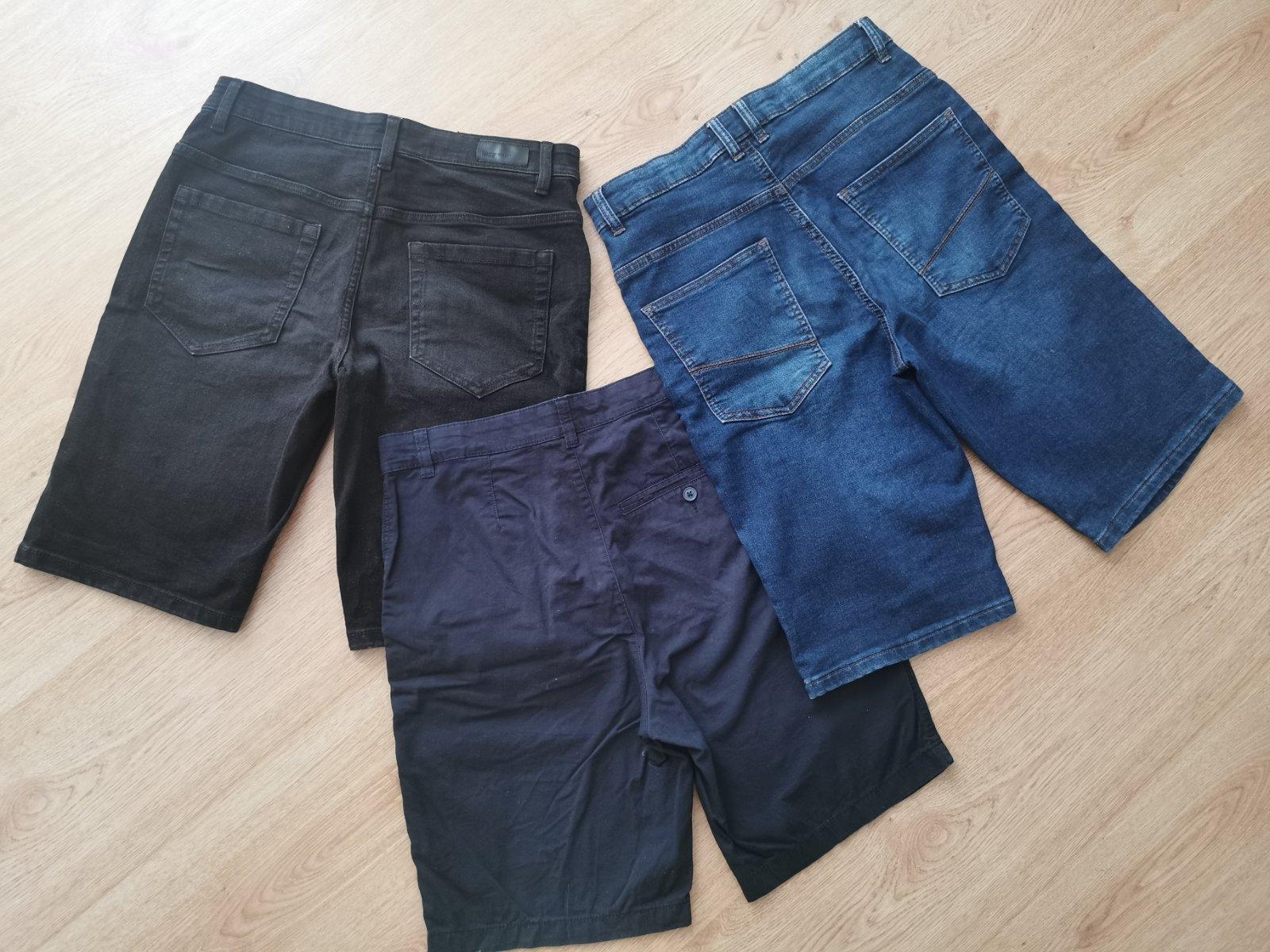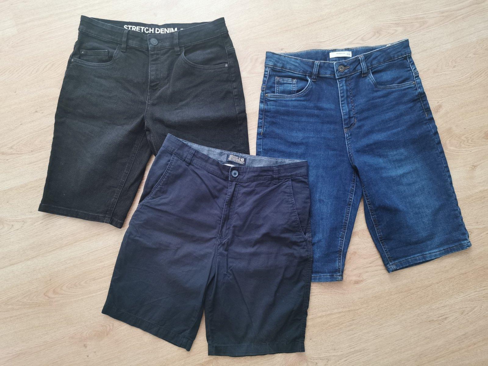 Trojica krátkych nohavíc vo výbornom stave. Bavlna. Značky: Reserved, H&M, C&A. Veľkosť 170 cm. Všetky majú nastaviteľný pás s gumou na gombíkoch. Čierne sú riflové (klasika), modré riflovina s elastanom (veľmi pohodlné), tmavomodré aj ako slušné oblečenie 😊.