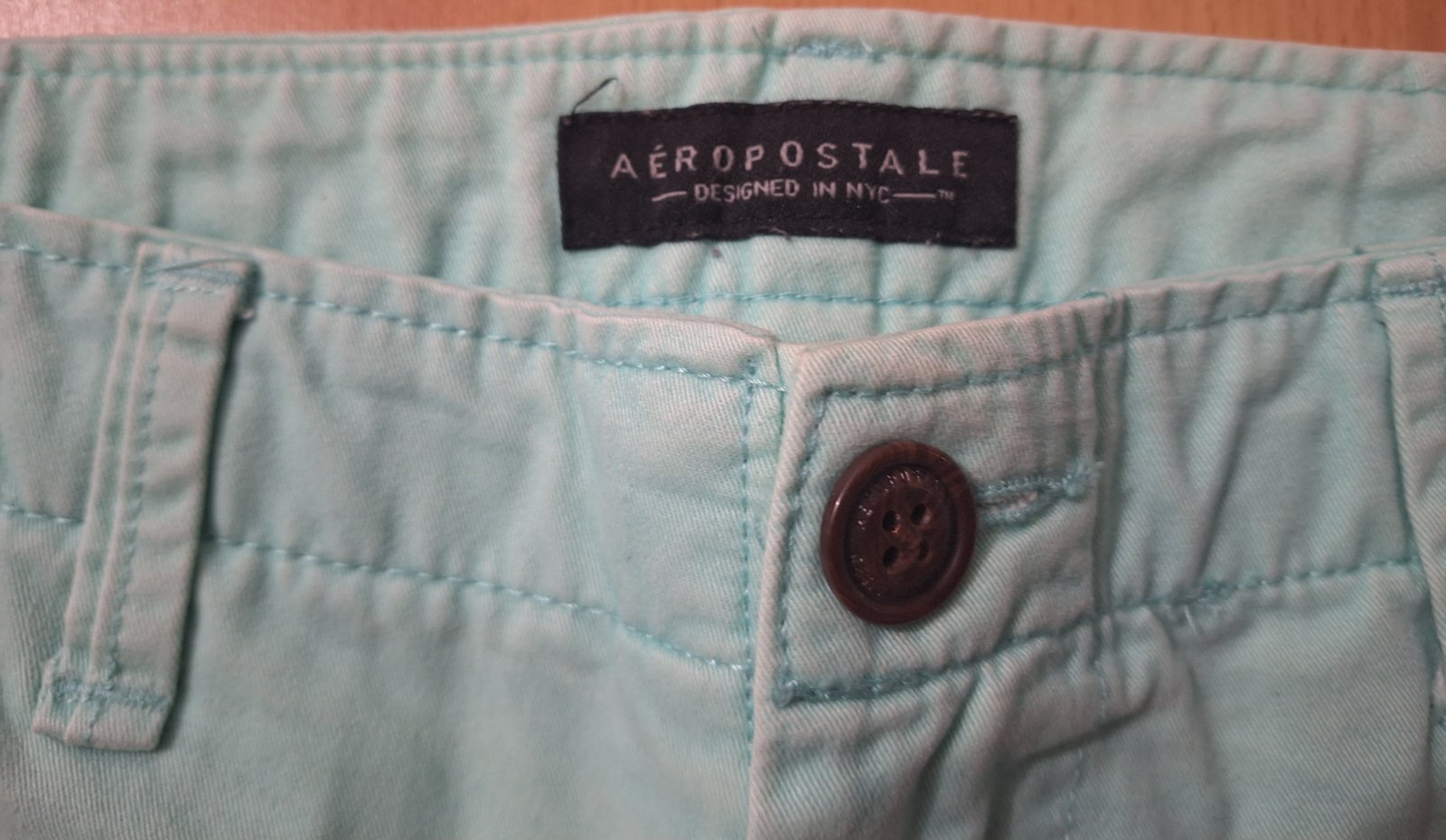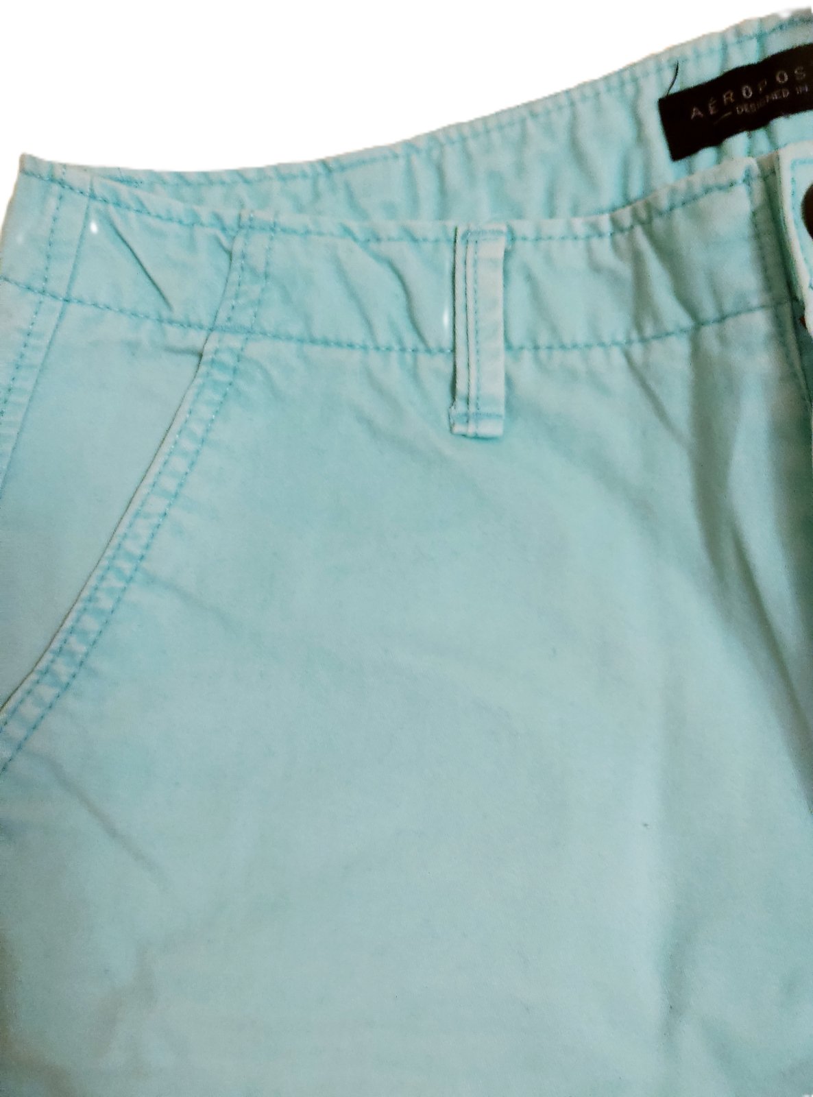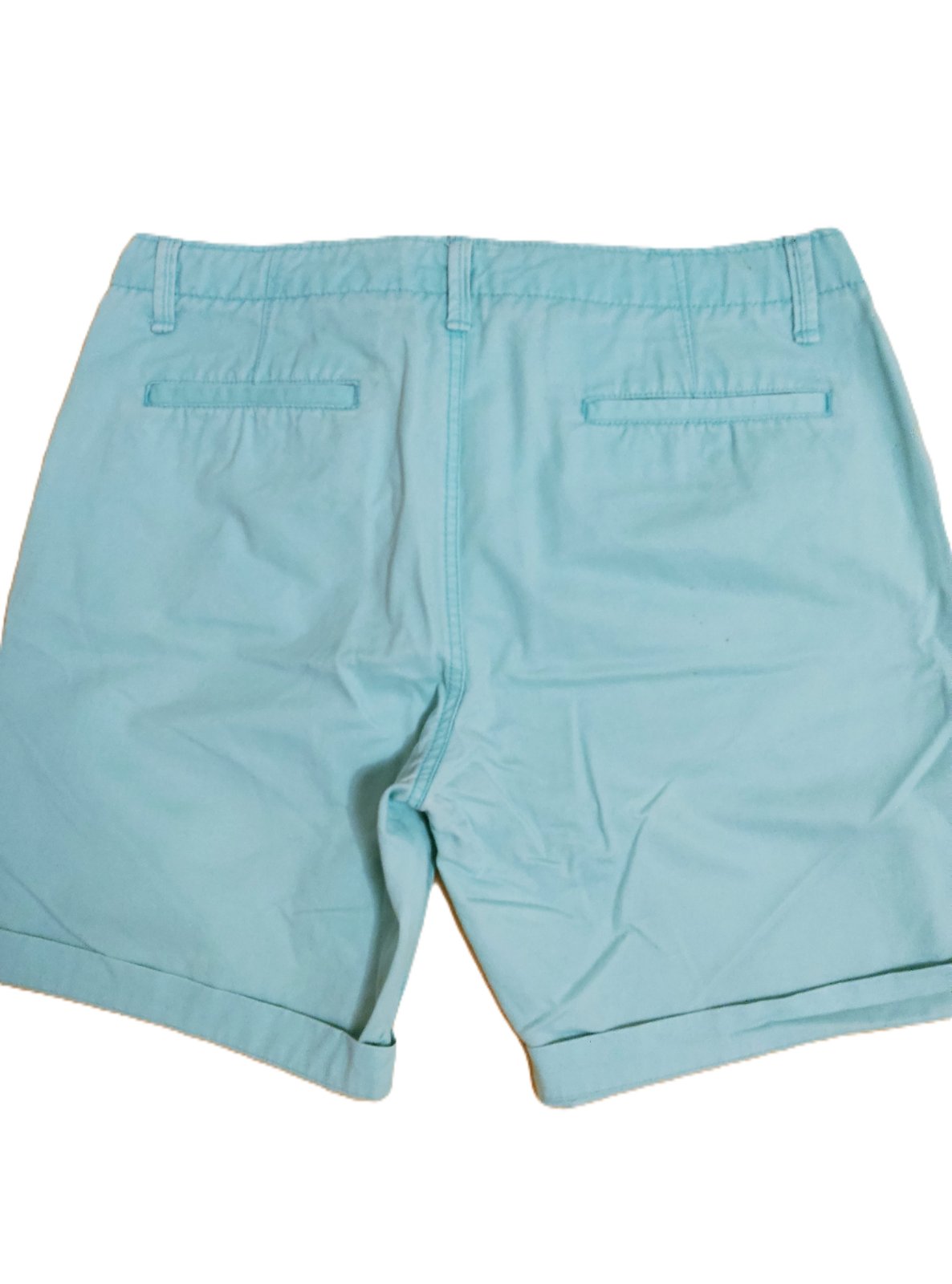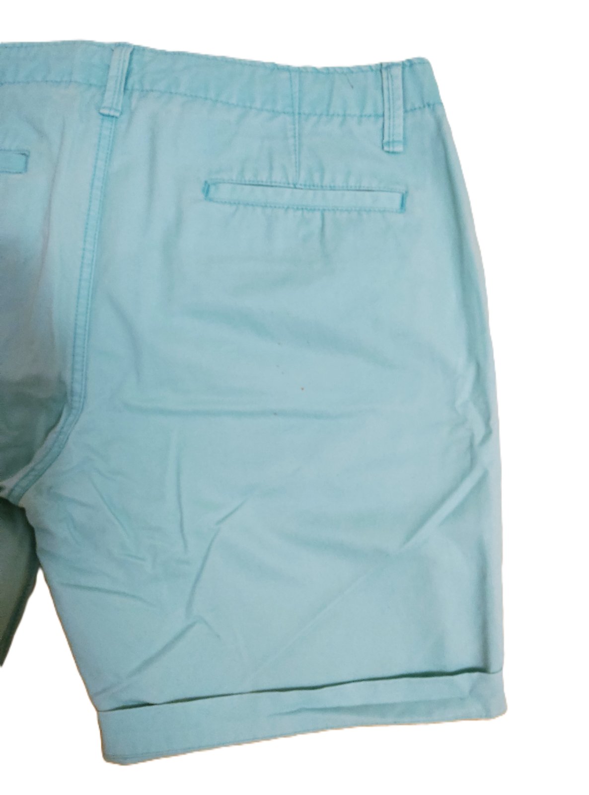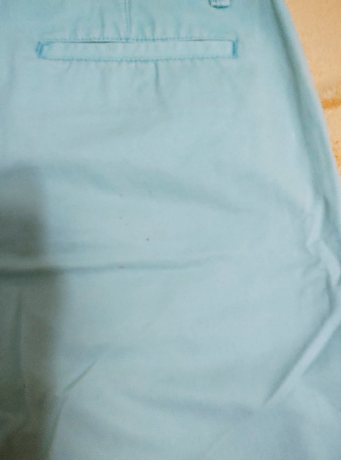 Šortky sú v dobrom stave, nádherná farba, ale nepodarilo sa mi zachytiť správny odtieň. Materiál je bavlna bez elastanu. Povrchová úprava má obnosený, ošúchaný alebo vydretý efekt. Pod pravým vreckom na zadnom diele sú malé bodky – viac na detailnej fotke.