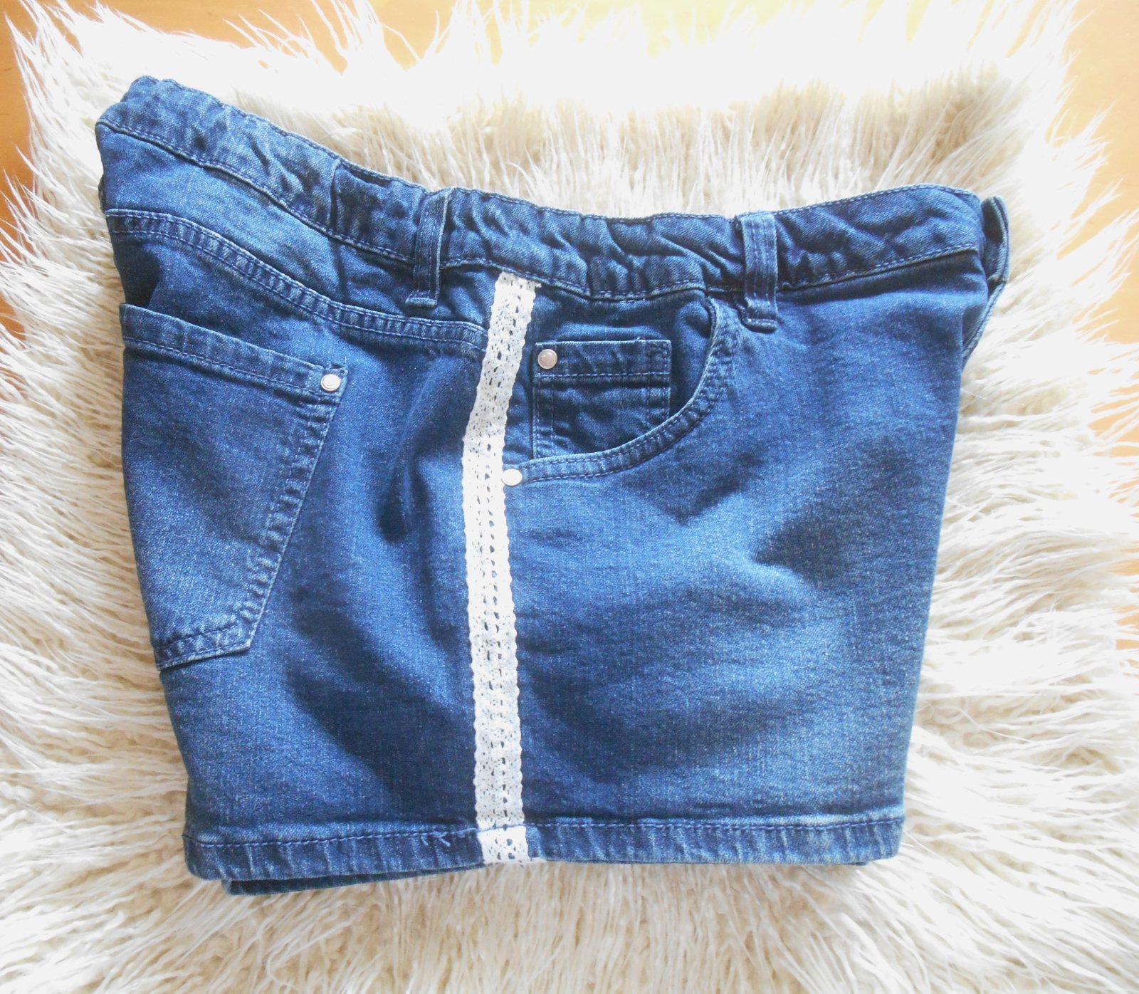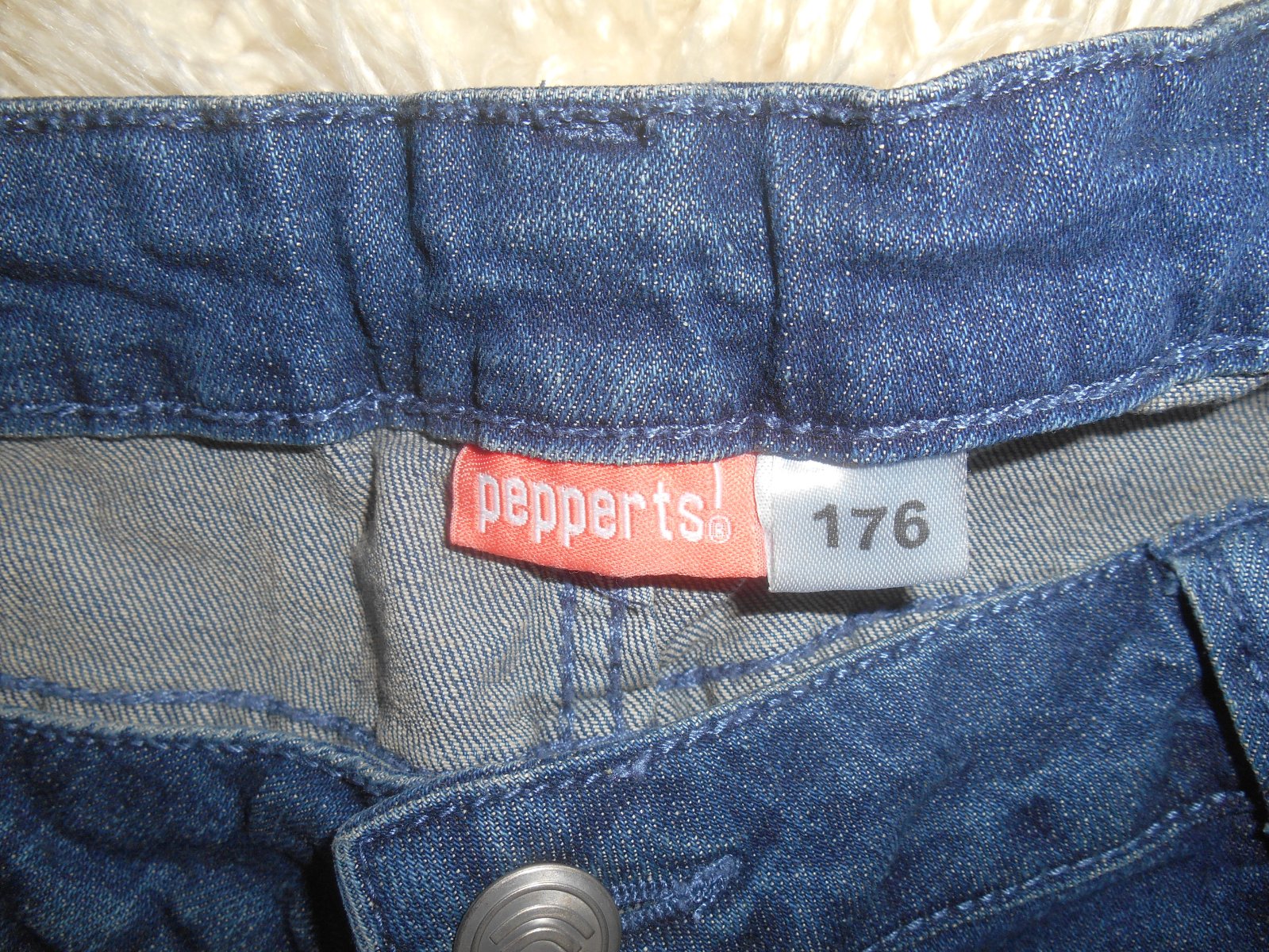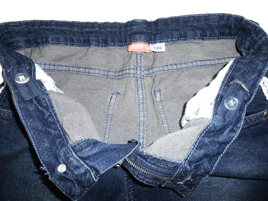 predám dievčenské riflové kraťasy v dobrom nosenom stave, píšu veľkosť 176, značka Pepperts, materiál: 98% bavlna, 2% elastan, zapínanie na zips a gombík, regulovateľný pás