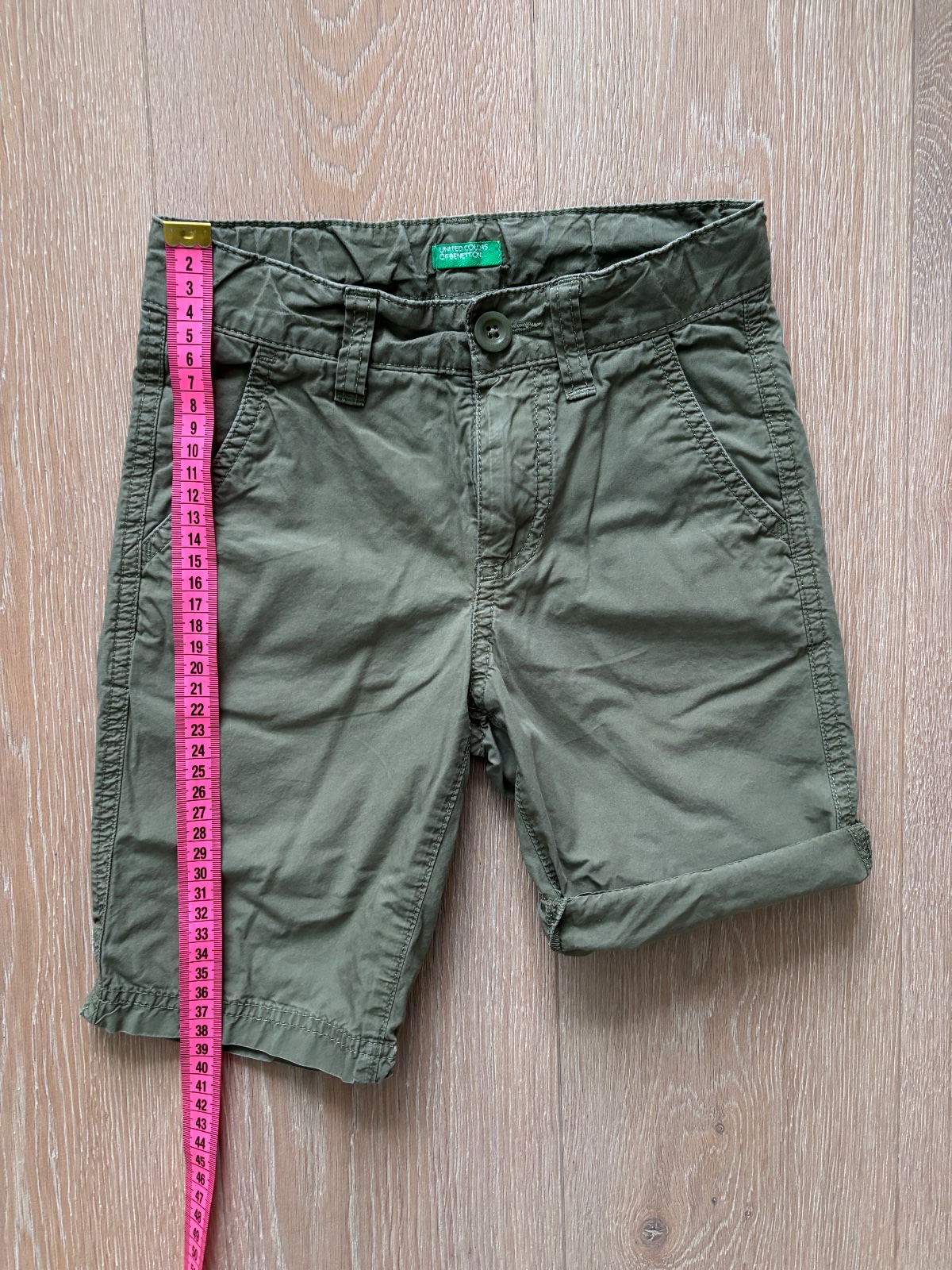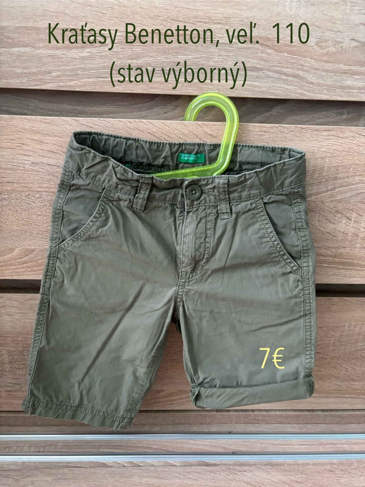 Výborné kraťasy, pekná khaki/olivová farba, možnosť stiahnúť v páse, 2 bočné predné vrecká, 2 zadné vrecká, možnosť ohnúť dľžku.