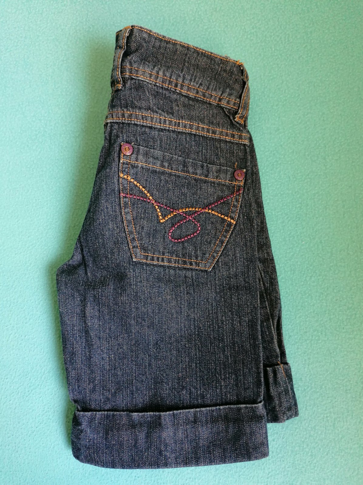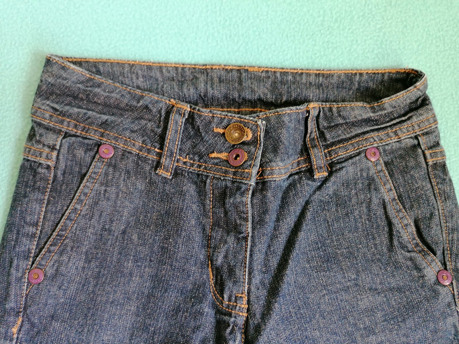 Pekné ozdobné fialové nity na vreckách, super sedia.