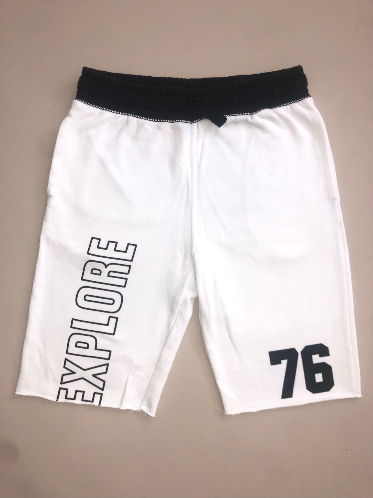 Kraťasy H&M, po mojom synovi, bez poskodeni. Hore na čiernom pase sú trichu zmolky- ale ja myslím, že nevadí, stejné nieje vidieť pri nosení. Pas je na gumu + dá sa regulovať aj snurkami. 2x vrecko vpredu, 1x vzadu. Veľkosť udaná 152, rozmery: pas 2x 35 cm v klude, dĺžka od rozkroku dolu 25 cm, celková dĺžka 50 cm. Odporúčame