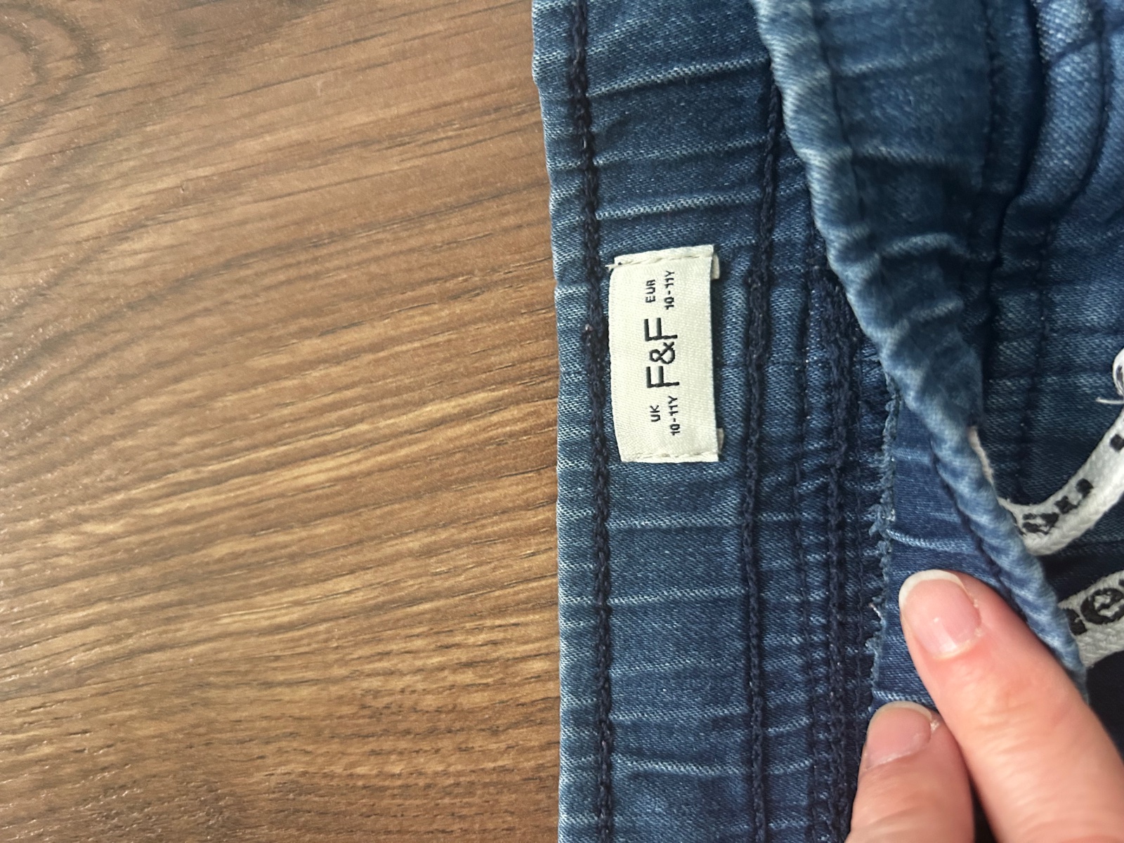 značka: F&F predné a bočné vrecká, zadné imitácia veľkosť: 146 (10-11) pútka na opasok, šnúrka v páse, krátka guma a rozšíritelné gombíkmi 65% polyester, 35% bavlna pás 32cm, dĺžka 54cm, vnútorná d...