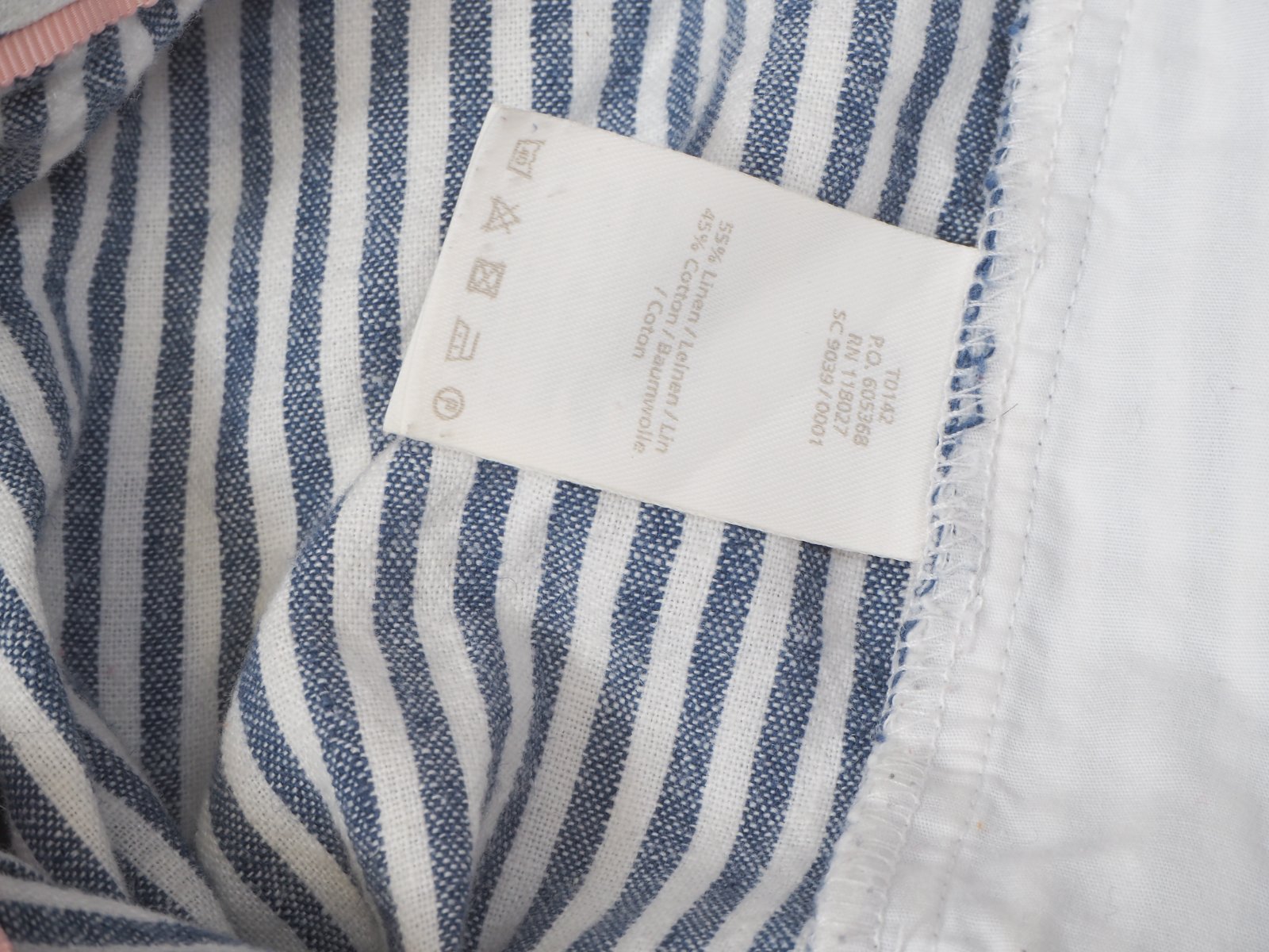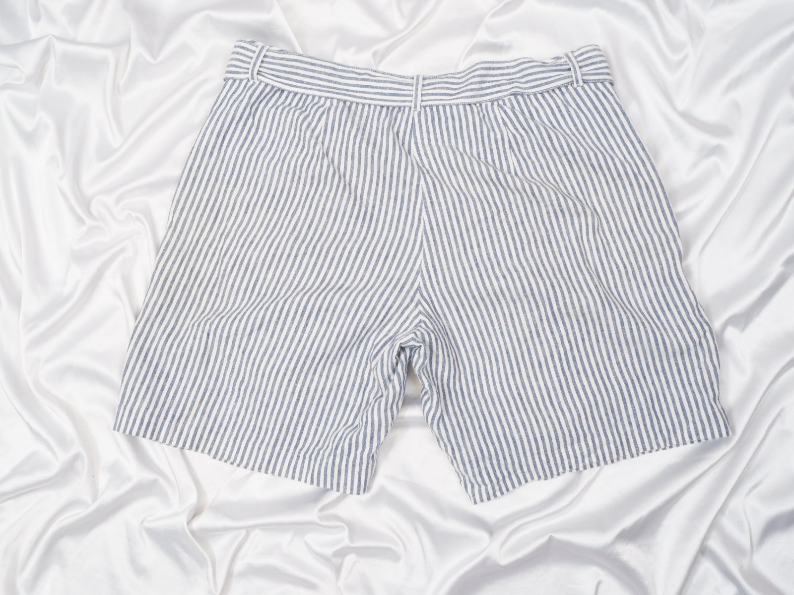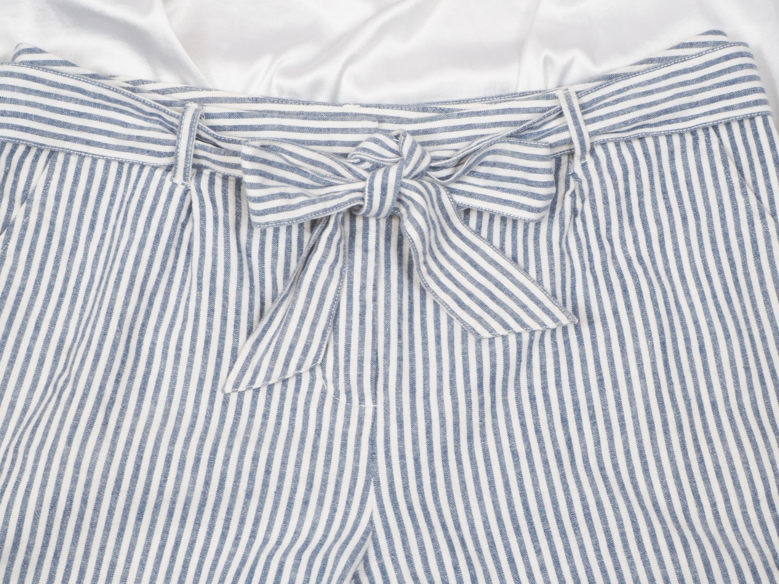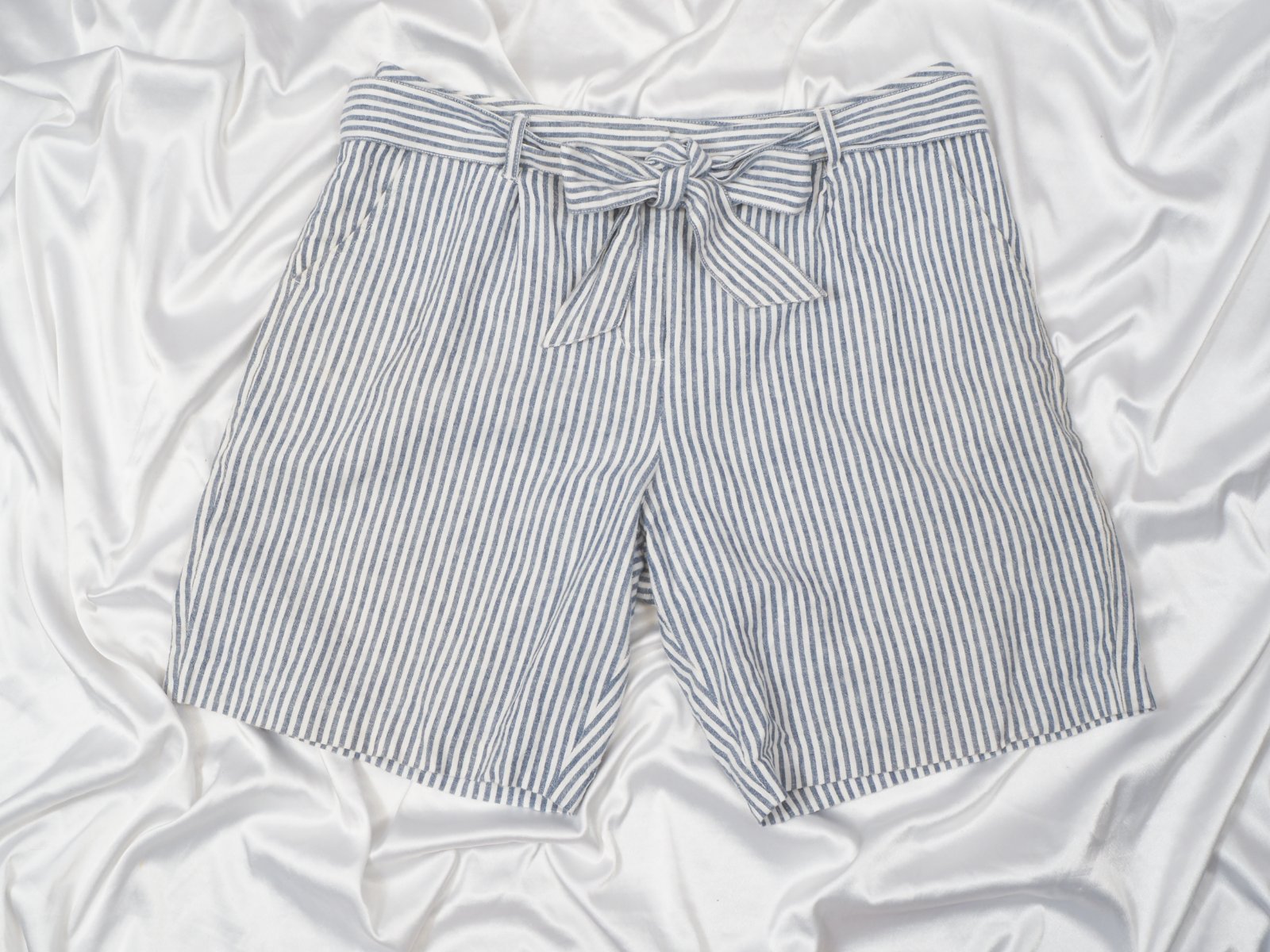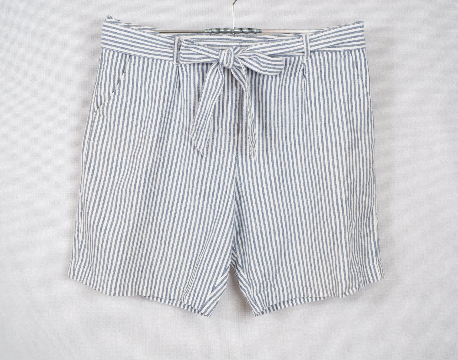 Kvalitné letné kraťasy pásikované, bielo-modré, zapínanie na zips a opasok, všité vrecká, materiál 55% ľan, 45% bavlna, super stav.