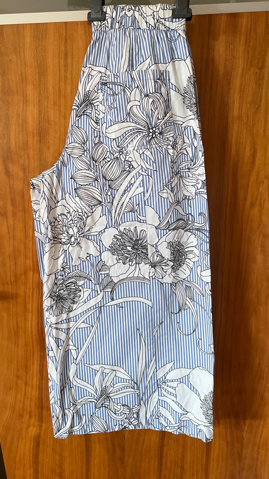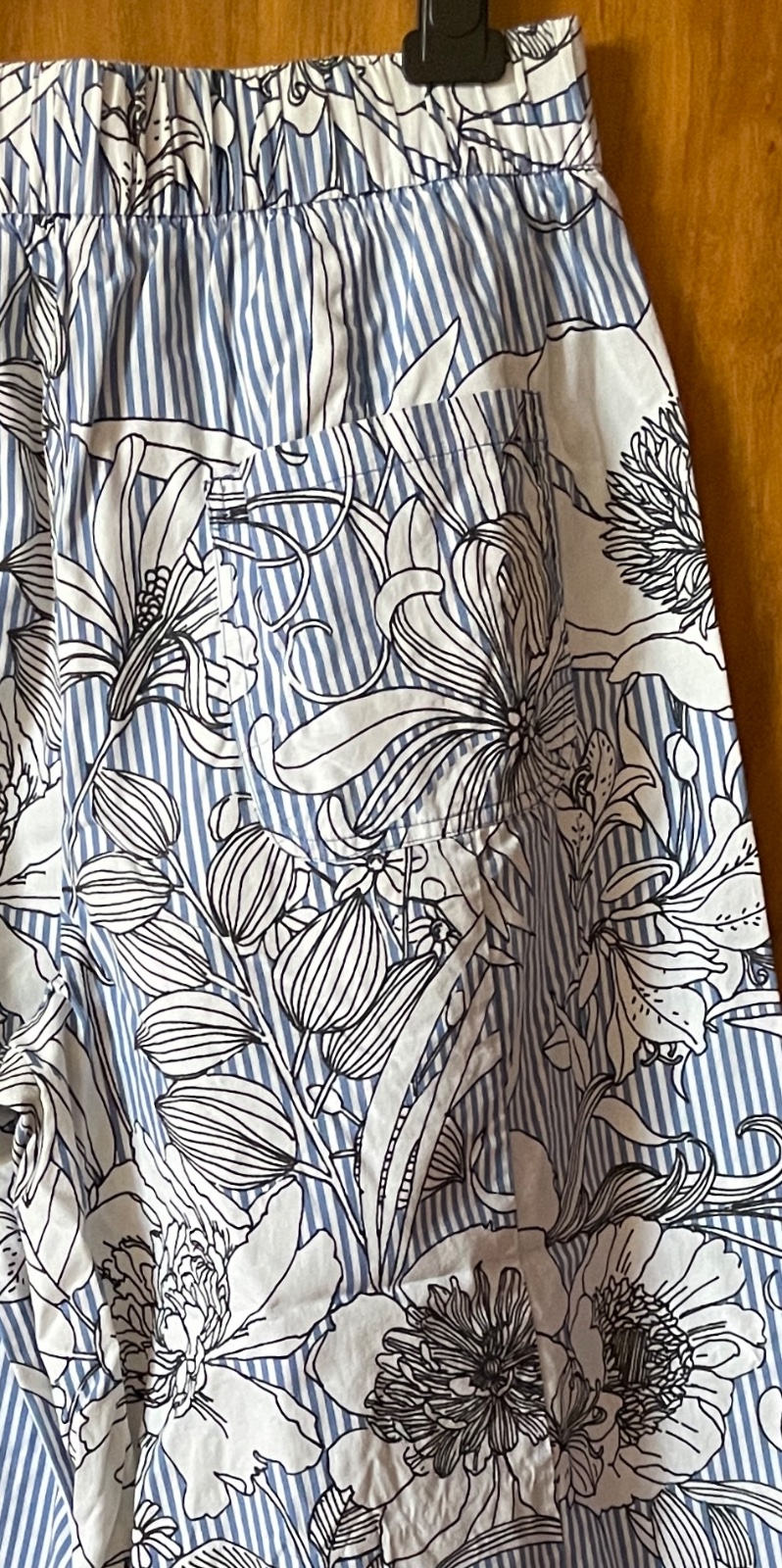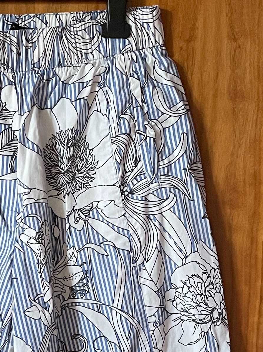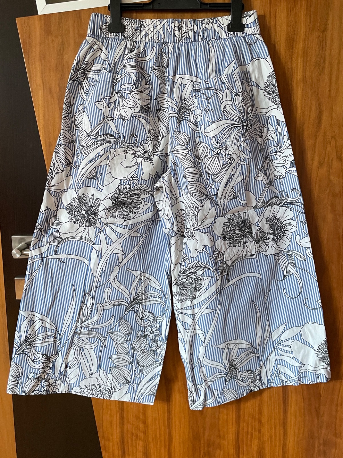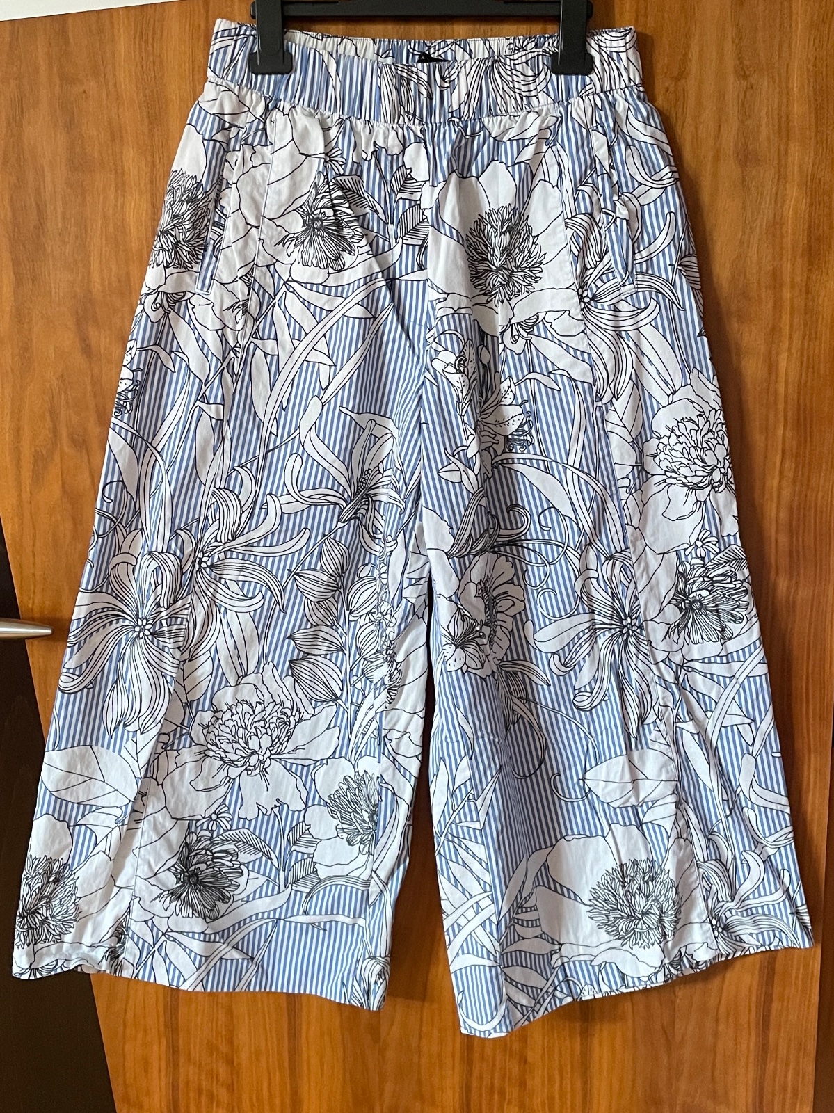 Predám zachovalé pásikavé kulóty so vzorom kvetov. Dve bočné vrecká vpredu, dve zadné vrecká, falošný poklopec, pás s gumou. Bez poškodenia.