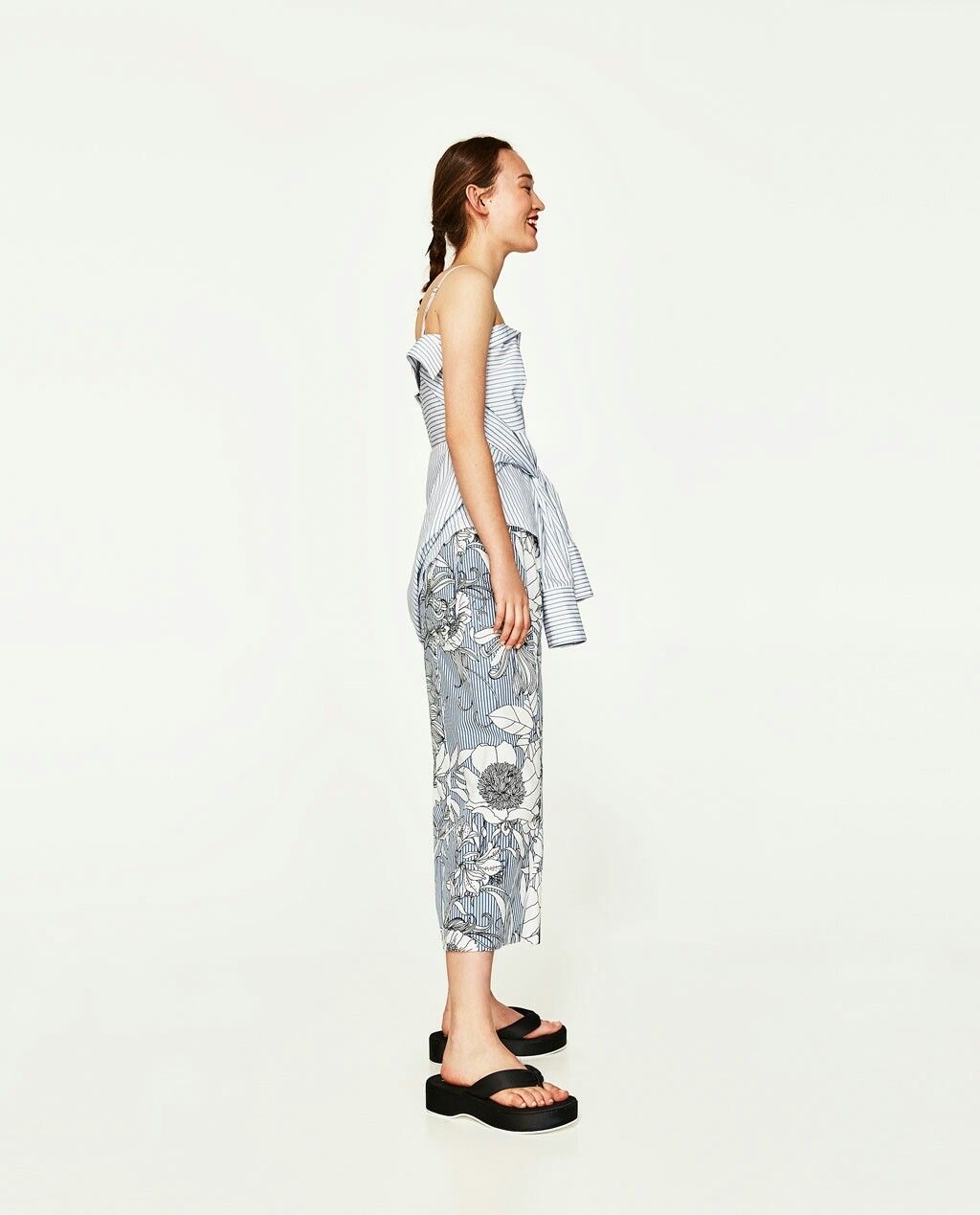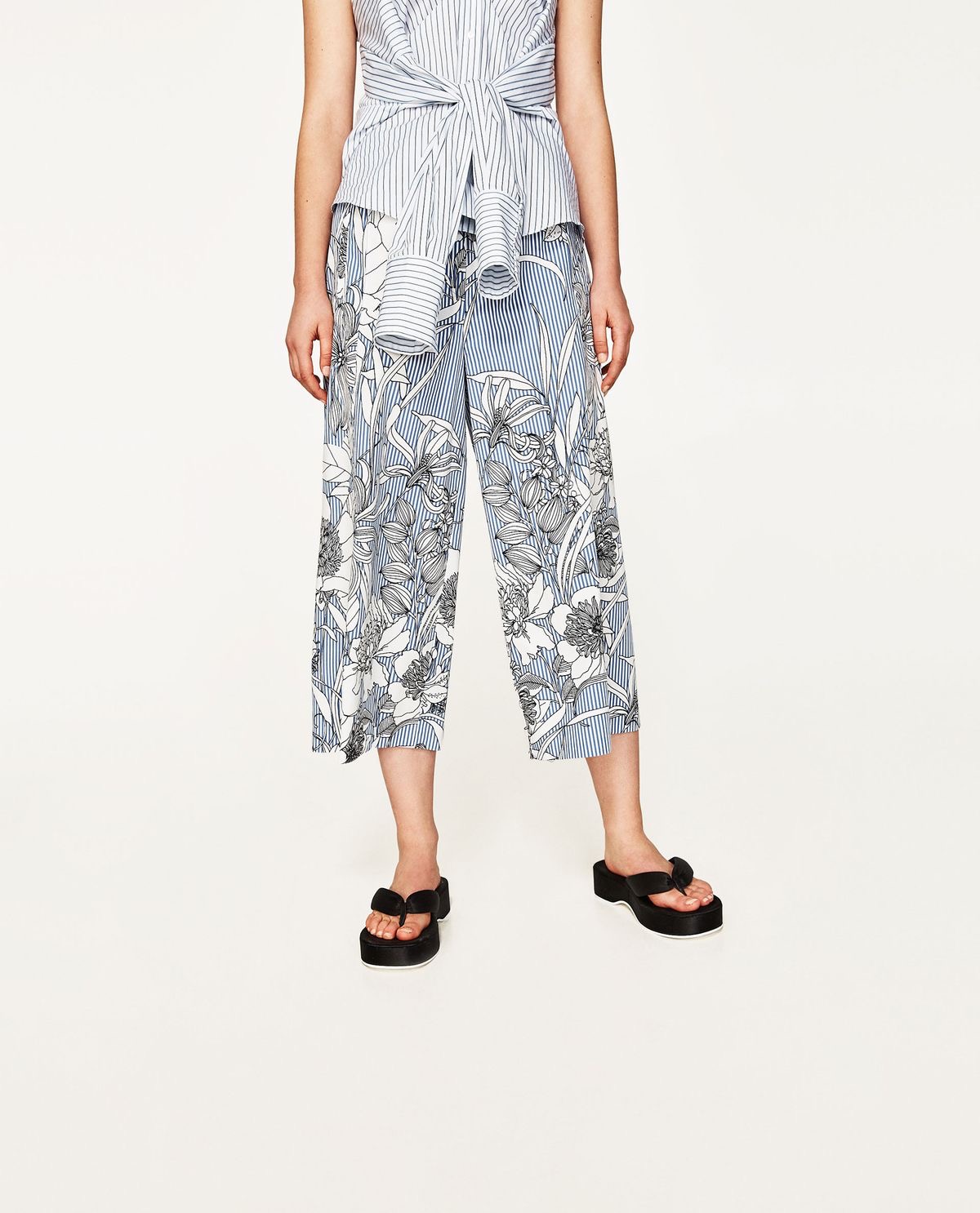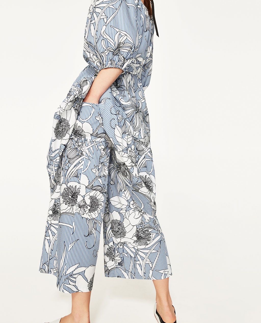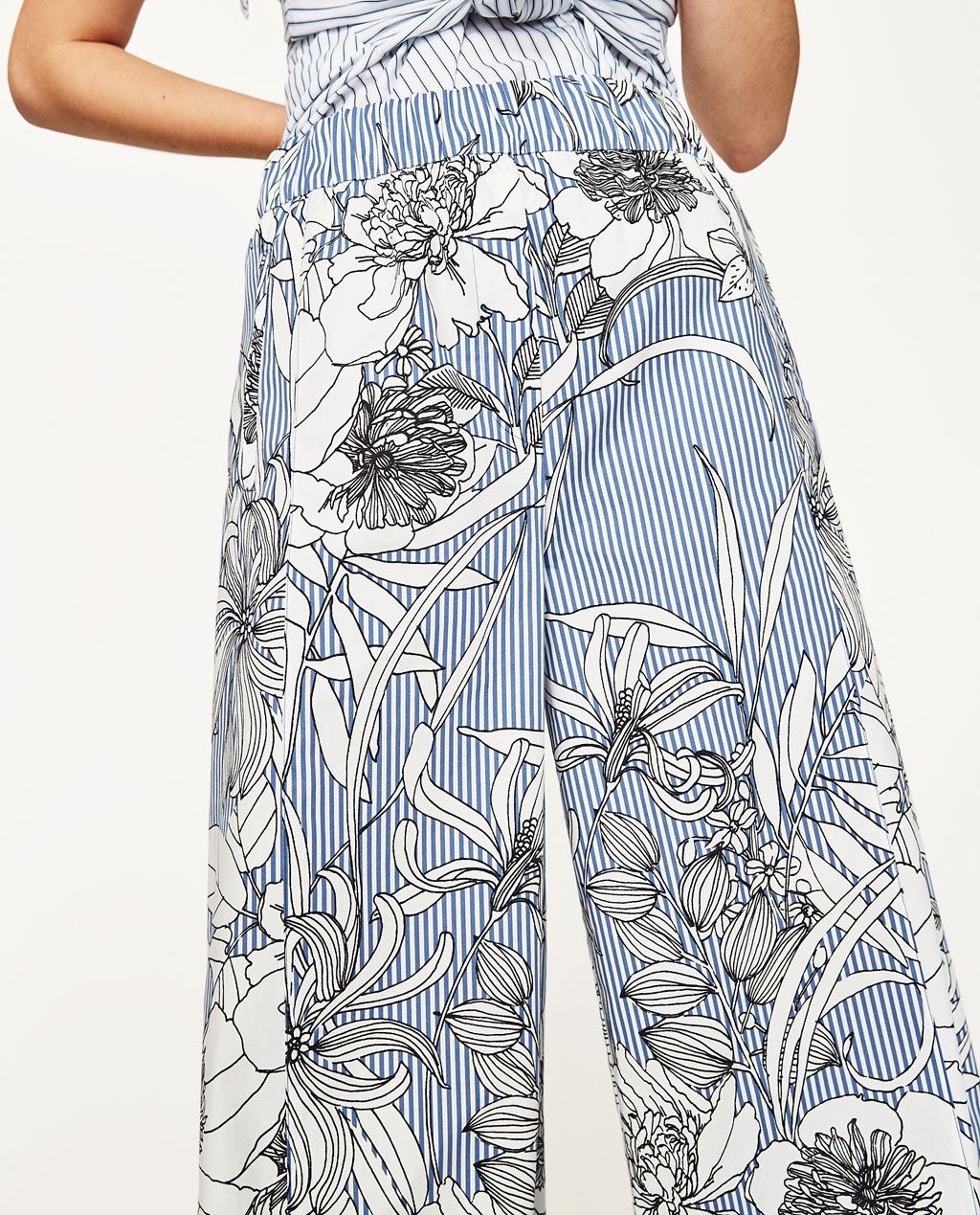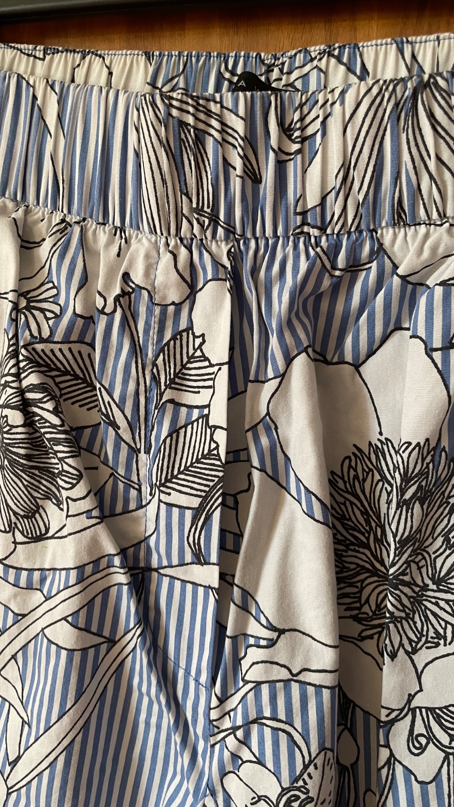 Predám zachovalé pásikavé kulóty so vzorom kvetov. Dve bočné vrecká vpredu, dve zadné vrecká, falošný poklopec, pás s gumou. Bez poškodenia.