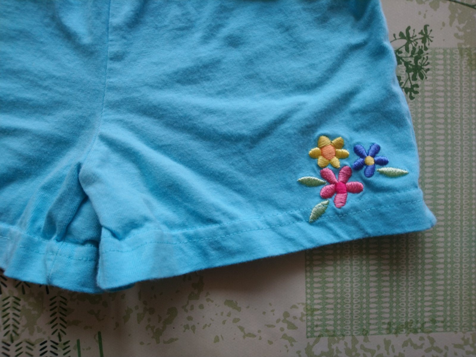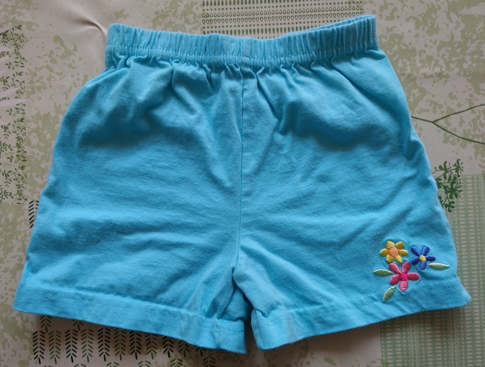 dievčenské modré kraťasky s kvetinkou, v páse na gumu,