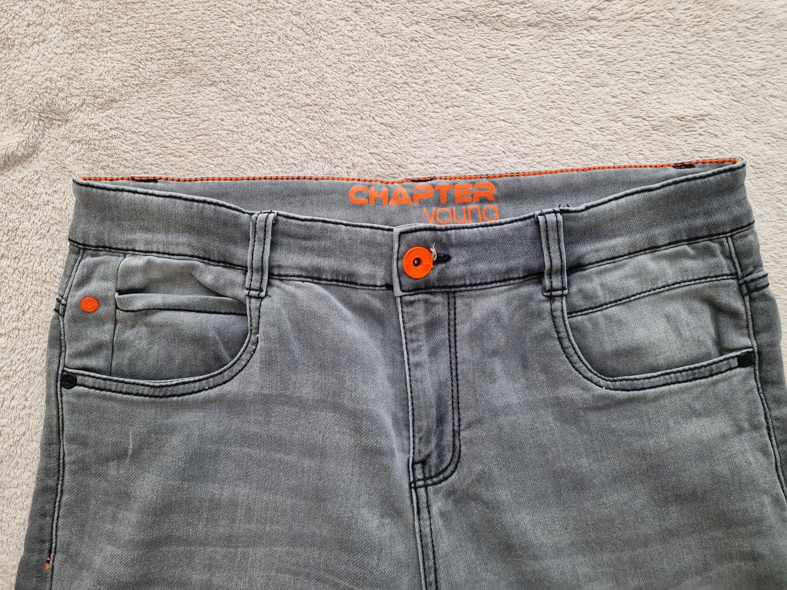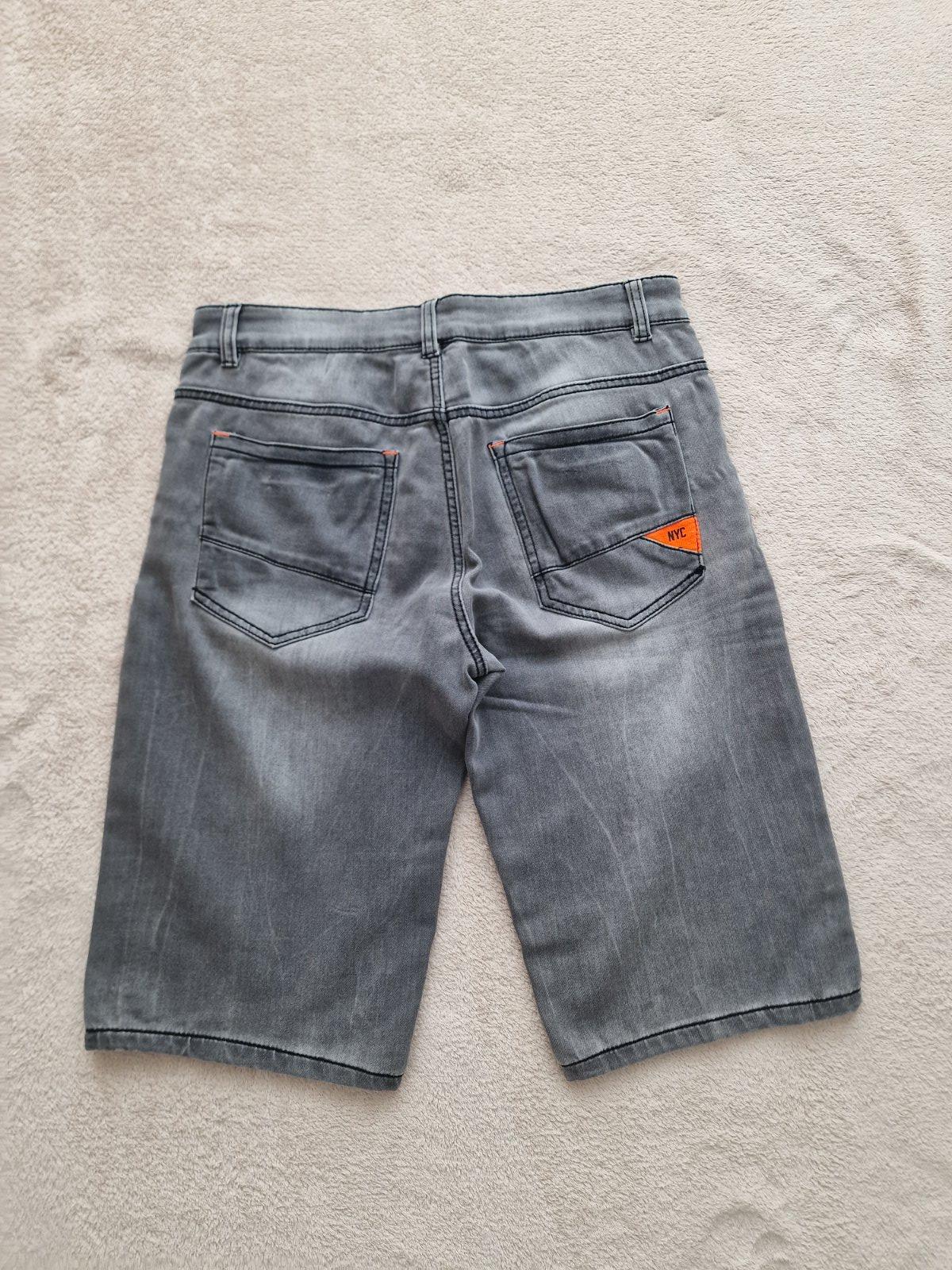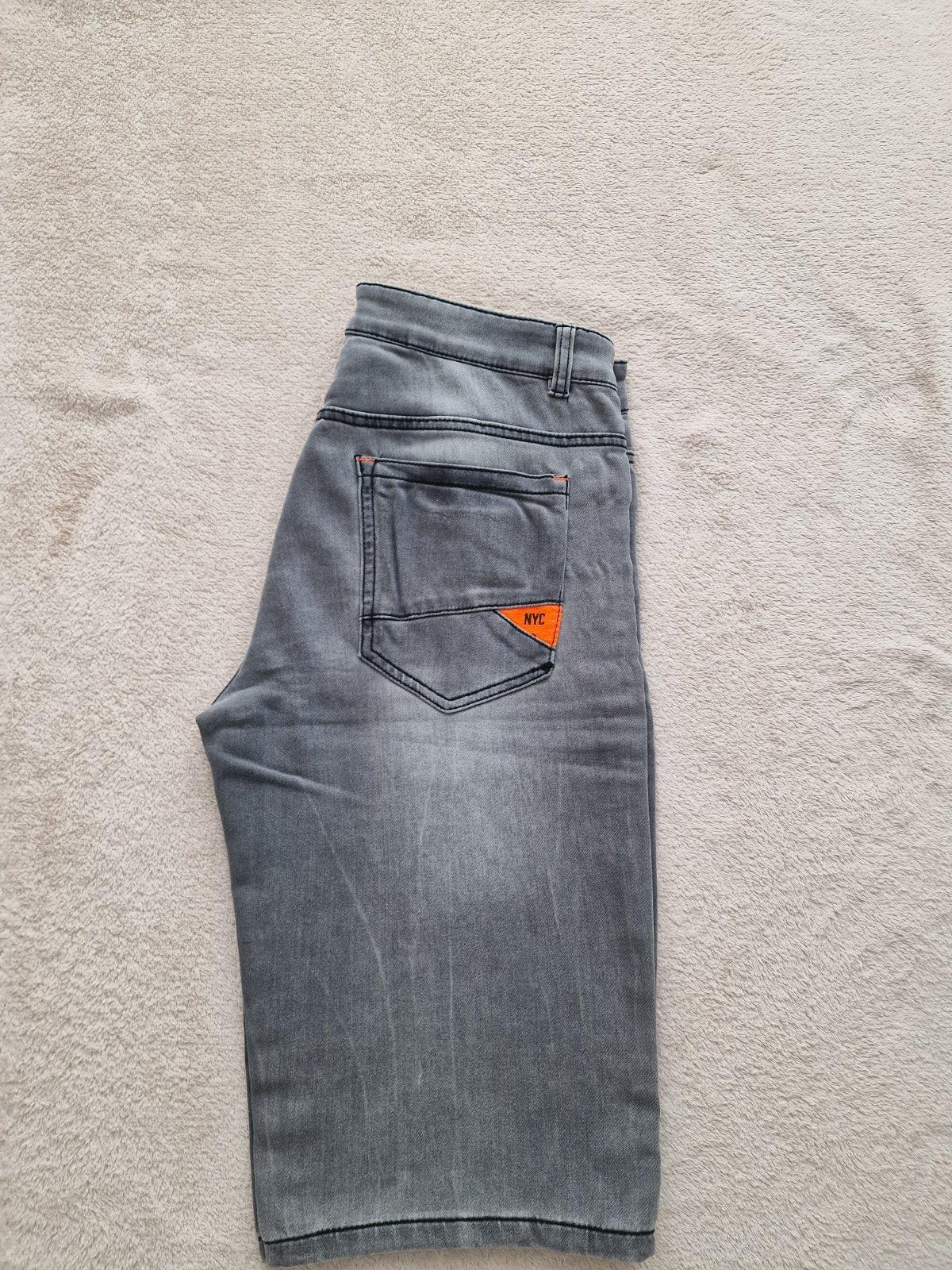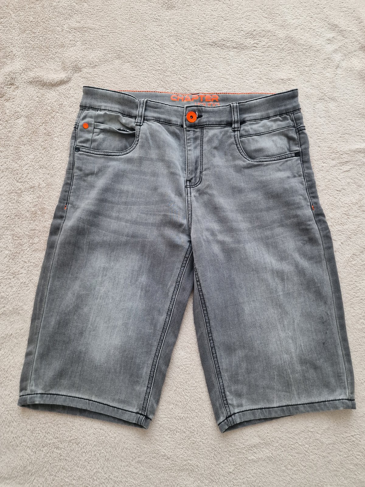 Nádherné kraťasy pre chalana. Svetlošedá strečová riflovina zvýraznená oranžovými doplnkami. Nenatiahnuté. Tak na 14-15 rokov, cca 164-170. Dĺžka 57 cm, pás 41 cm.