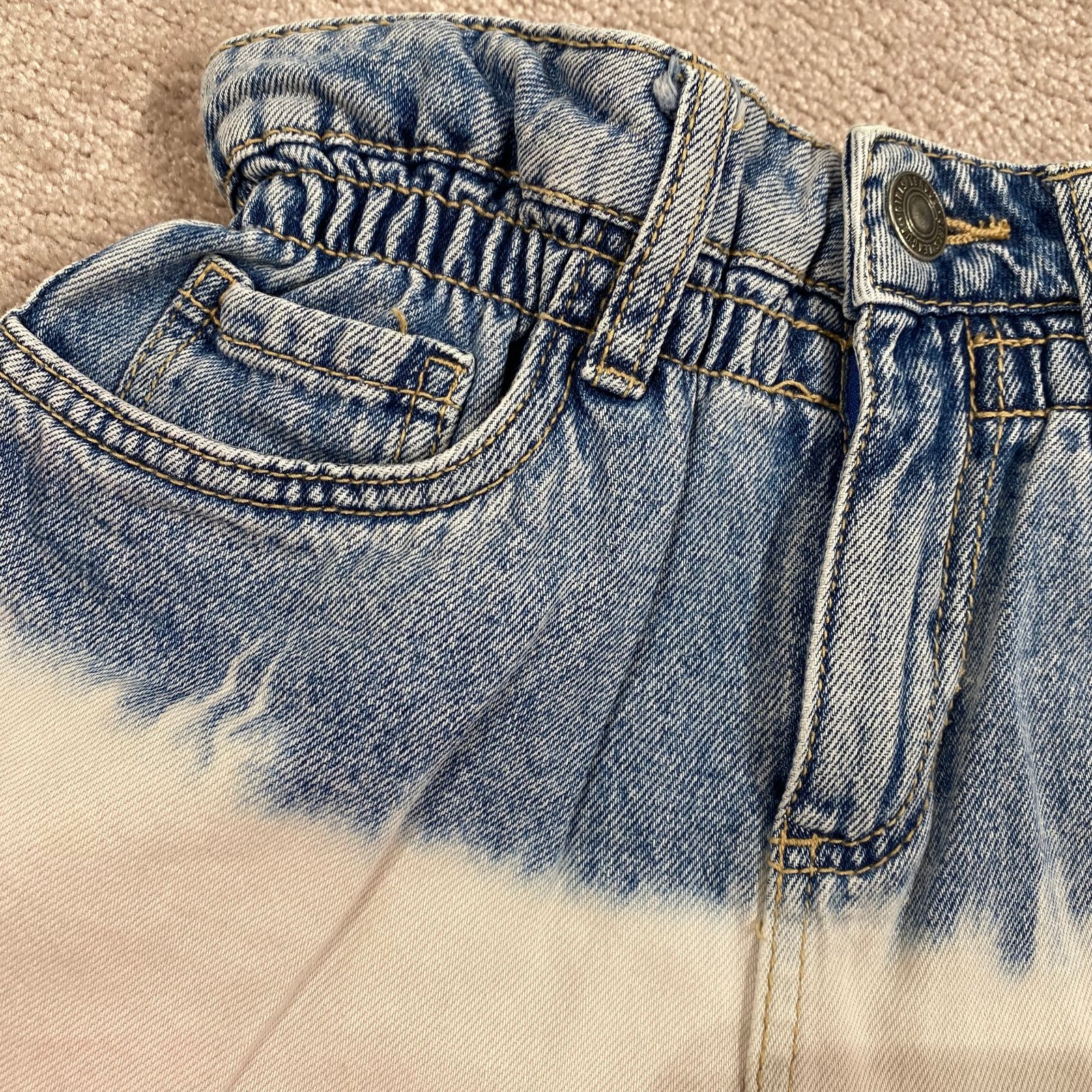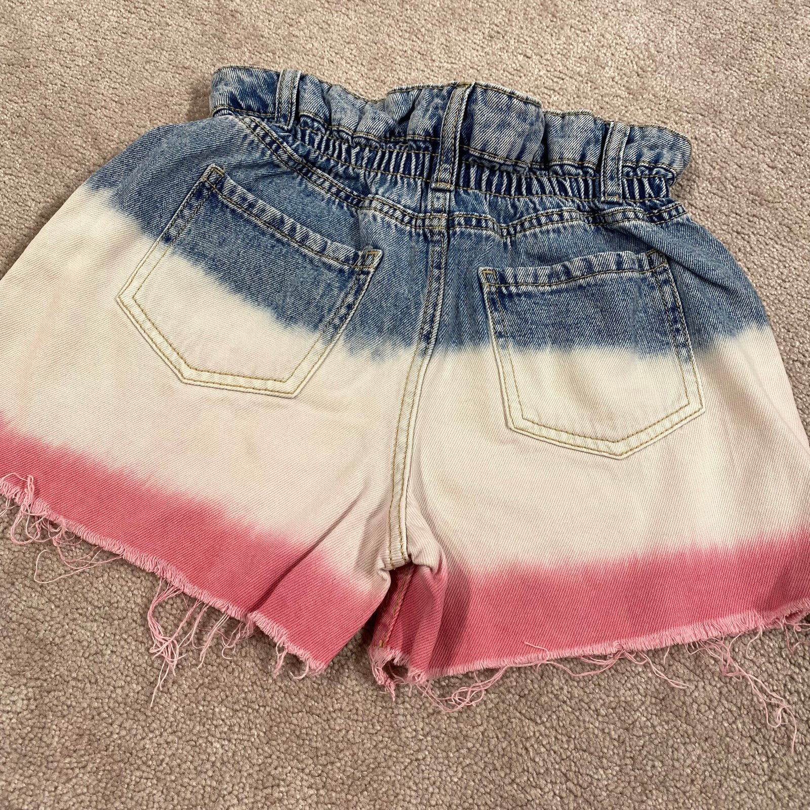 Zaujímavé trojfarebné riflové šortky, v páse na gumičku, postranné vrecká.