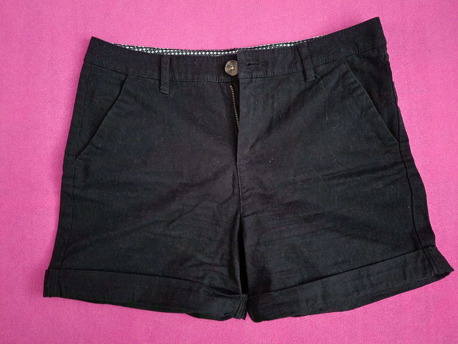 Čierne riflové šortky s vysokým pásom, s vreckami. Pás 38 cm, dĺžka 35 cm, predný sed 26 cm.