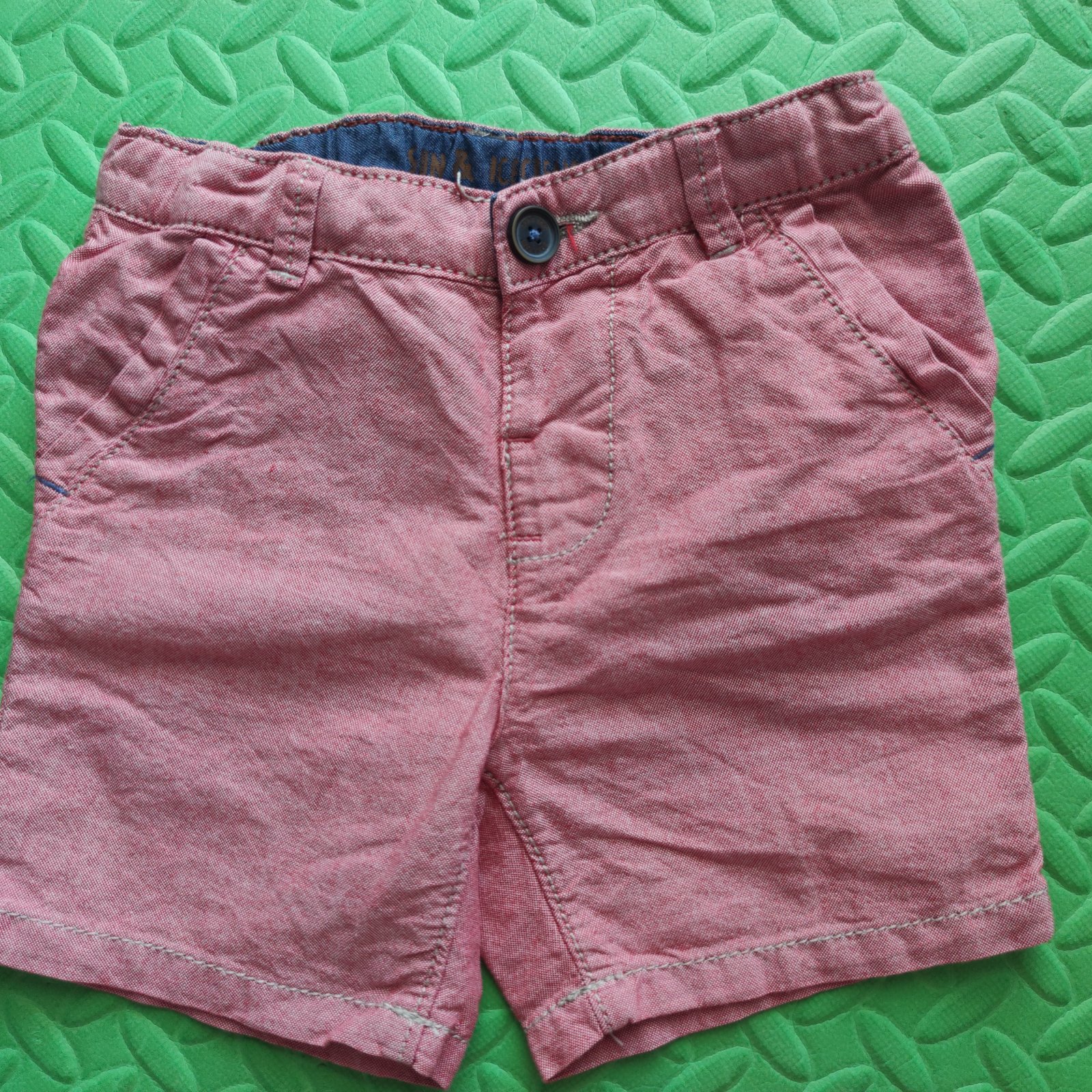 Kraťasy s prímesou ľanu. Výborný stav. Veľkost 9-12m, ale traky sú nastaviteľné, takže nositeľné aj dlhšie. Farba ako na detailnejšej foto.