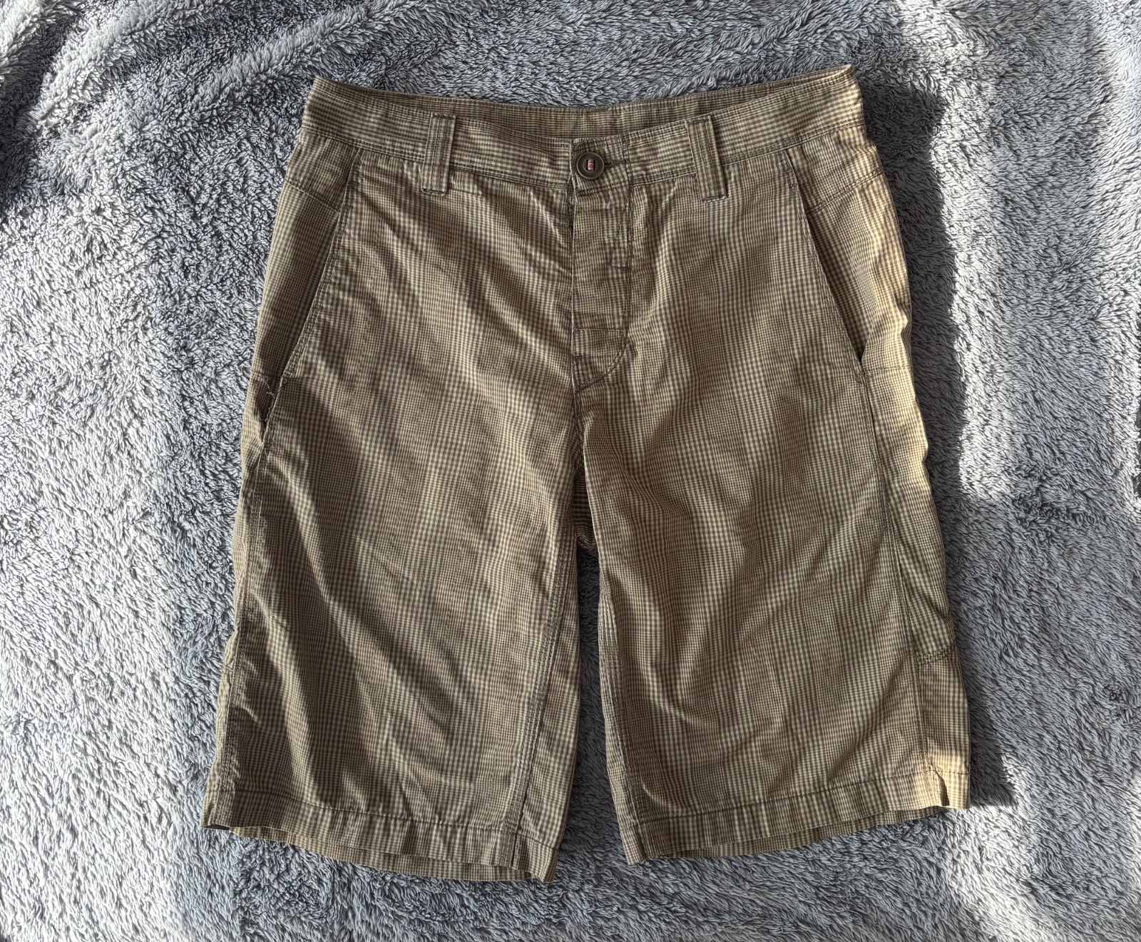 Pánske kraťasy nosené nemajú poškodenie až na malý bledý fliačik ktorý je vidno na poslednej fotke novidno ho az keď sa lepšie zapozerate. Cena zohľadnena.