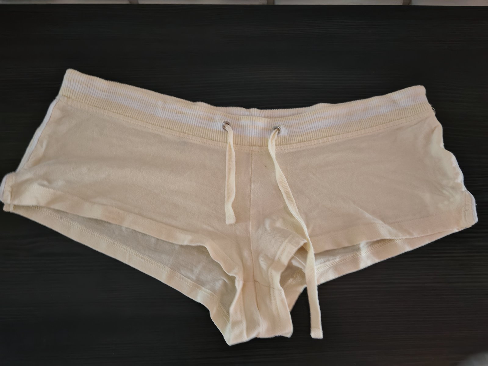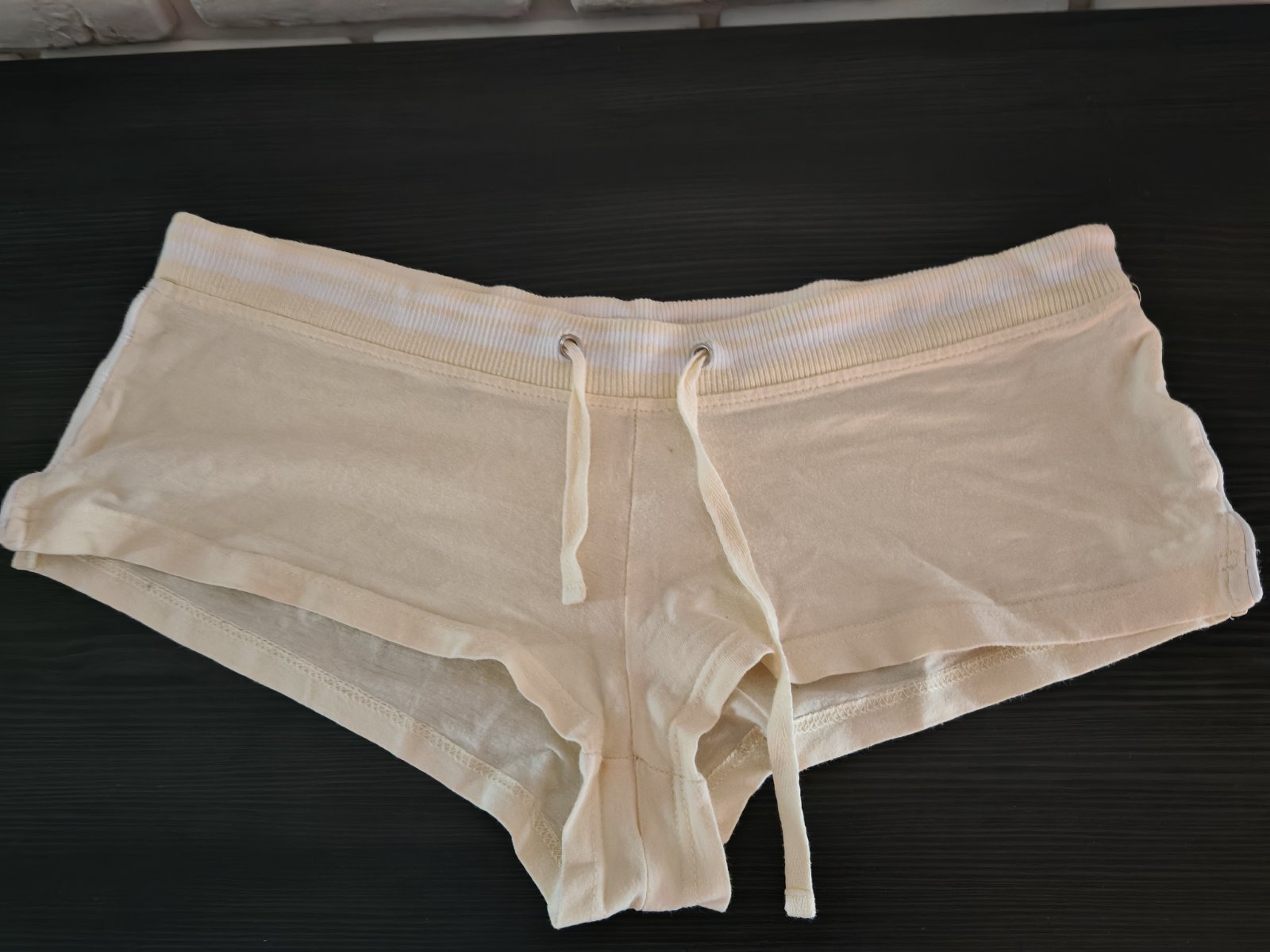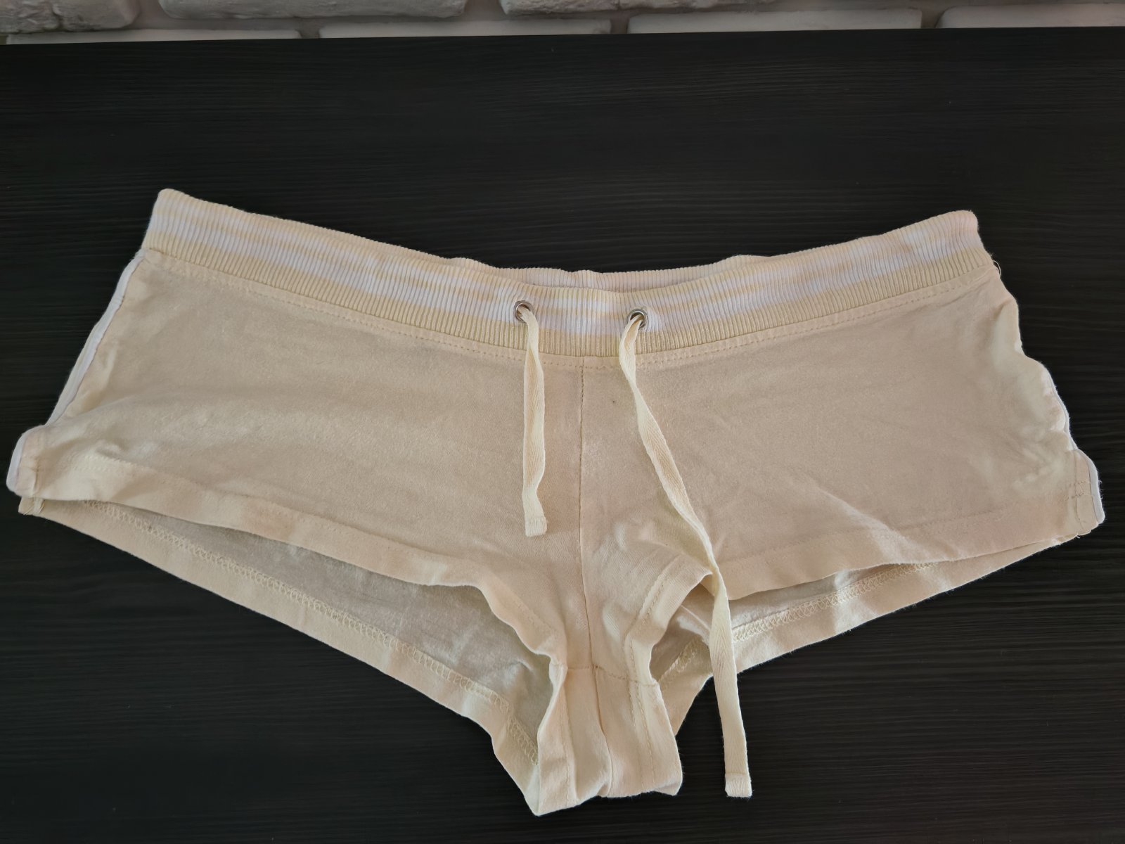 Jemne žlté bavlnené kraťasy, sú obtiahnuté ako nohavičky, krátke , prispôsobia sa na veľkosti M,L sadnu, veľmi krásne top stav