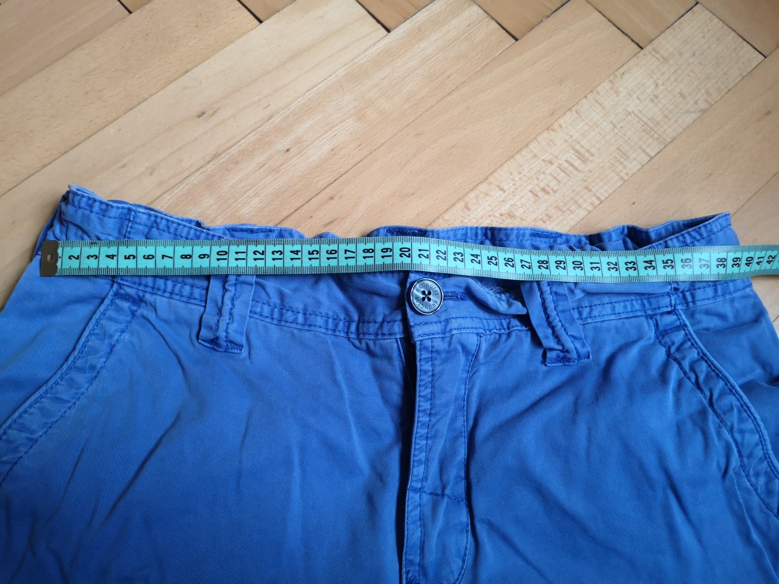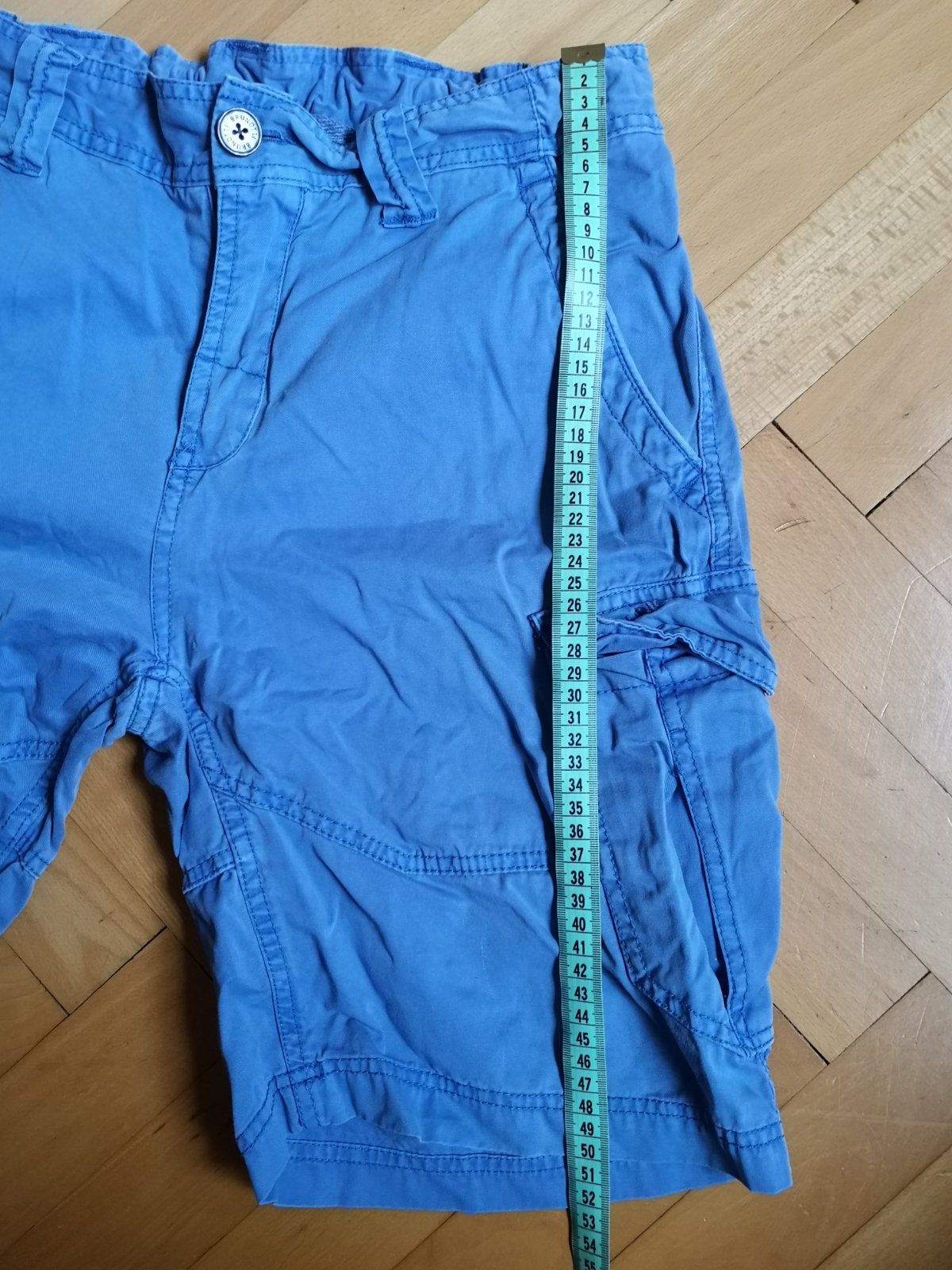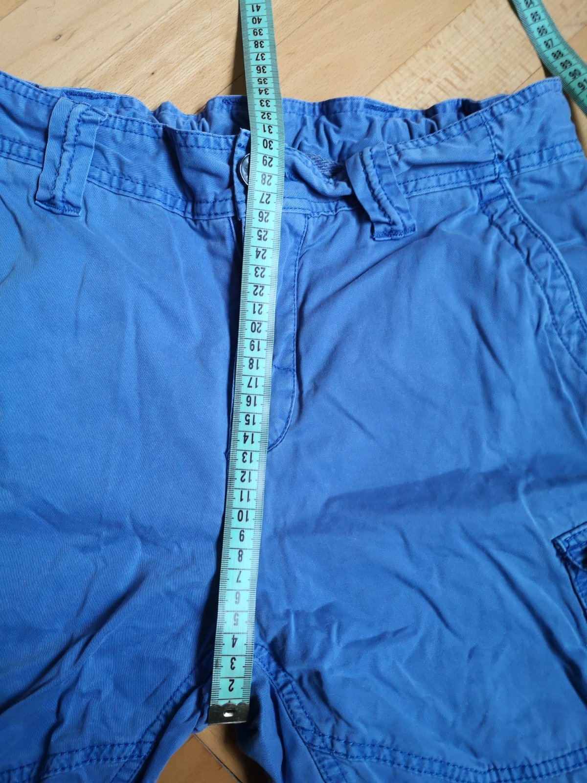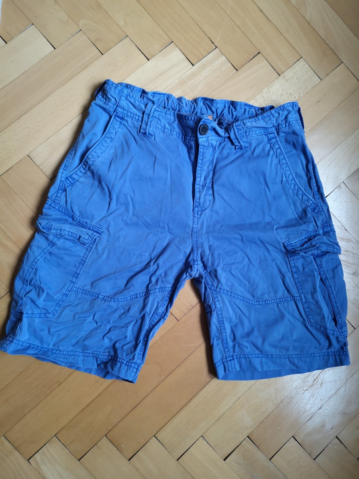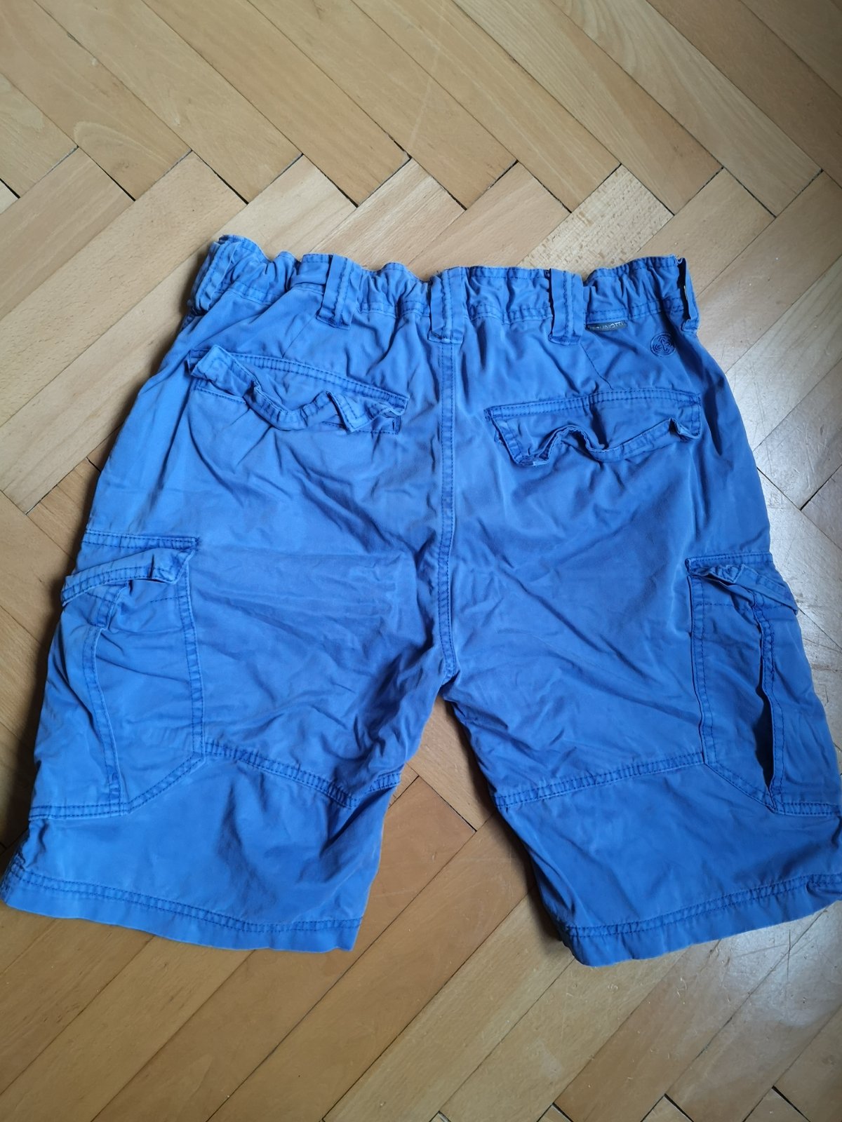 Krátke nohavice, nosené často, farba praním vyblednutá, sú však bez poškodení. Farba je taká modrofialová. V páse je posuvná guma na reguláciu pásu. Veľa vreciek. Veľmi pohodlné. 100% bavlna.