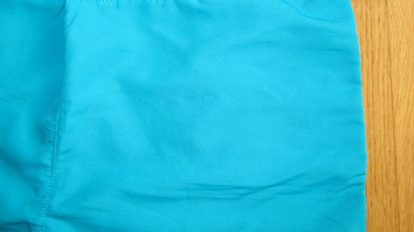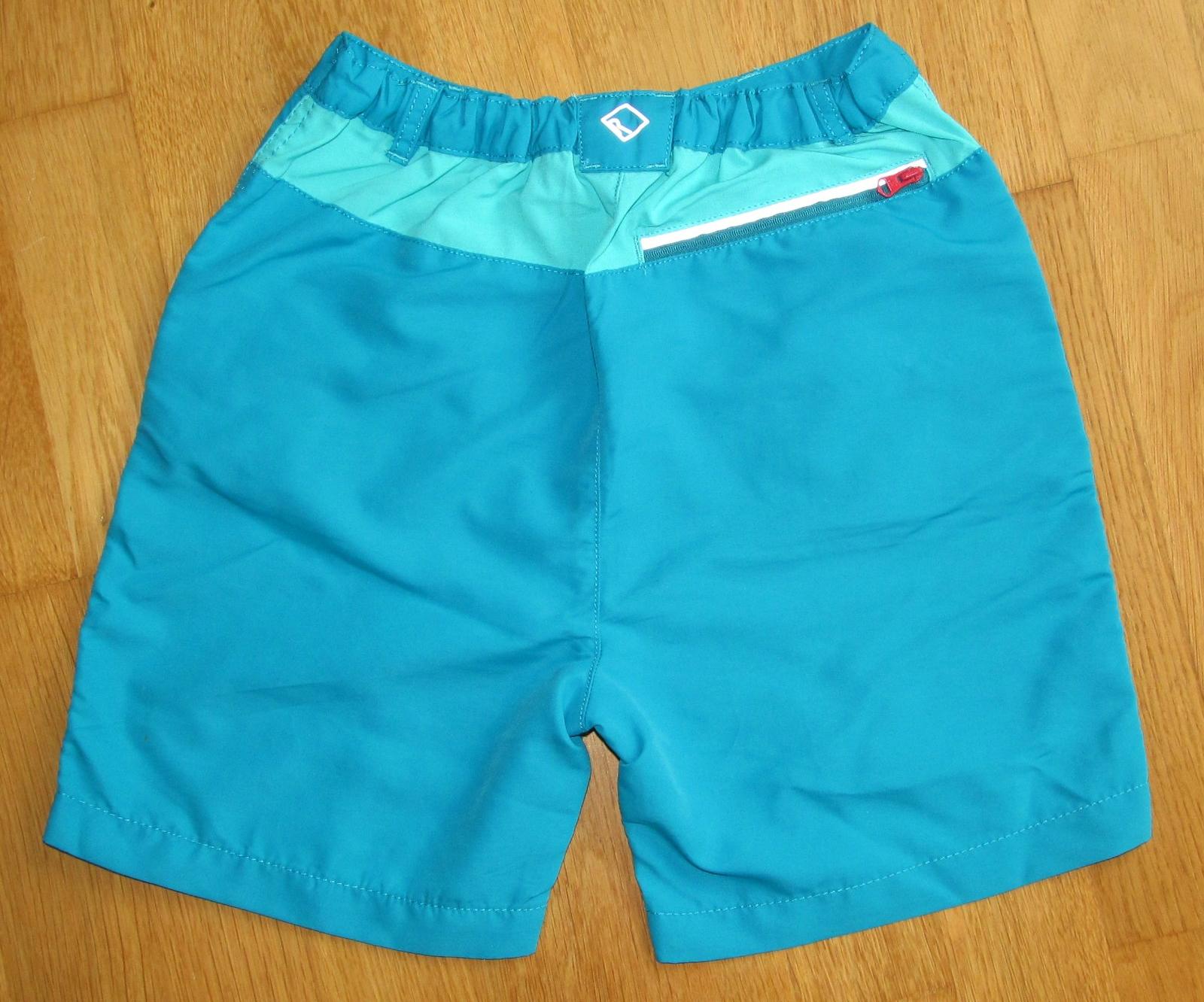 sportove sortky, oblecene len na 1 dovolenke, rychloschnuca tenka tkanina elasticka v diagonalnom smere, 3 vrecka na zips a vpredu popri zipsovych este 2 obycajne vrecka. popri vreckach reflexne pasiky. Na zadku na 1 strane zatiahnuta 1 vodorovna nitka, nie je to takmer vobec viditelne, foto v detaile. Pas maximu 2*37,5 cm, pas v klude 2*31 cm, da sa stiahnut nastavitelnou gumou v pase. Dlzka na boku cca 38 cm