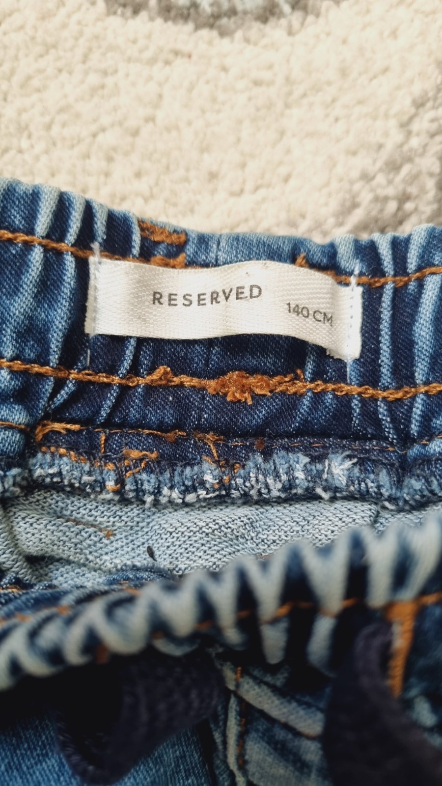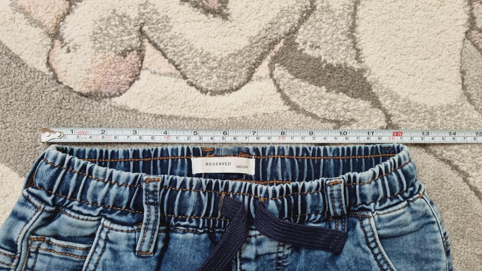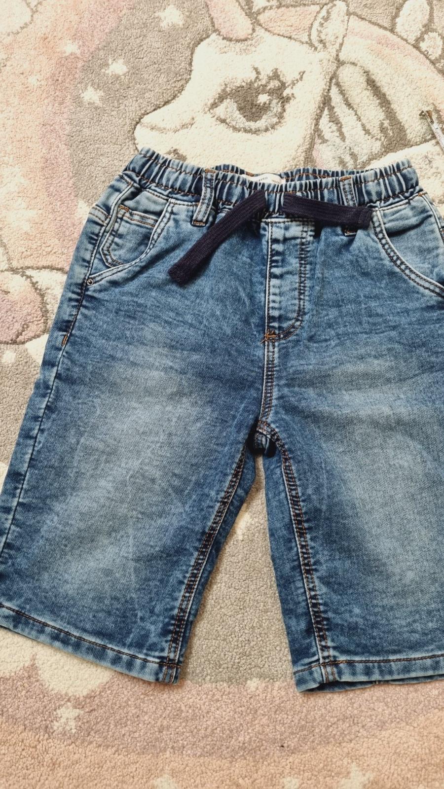 Kraťasy rifľové veľ.140 bez poškodení. Možnosť nastavenia šírky v páse pomocou gumičiek.