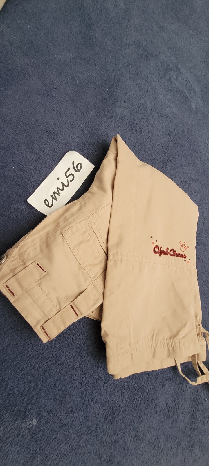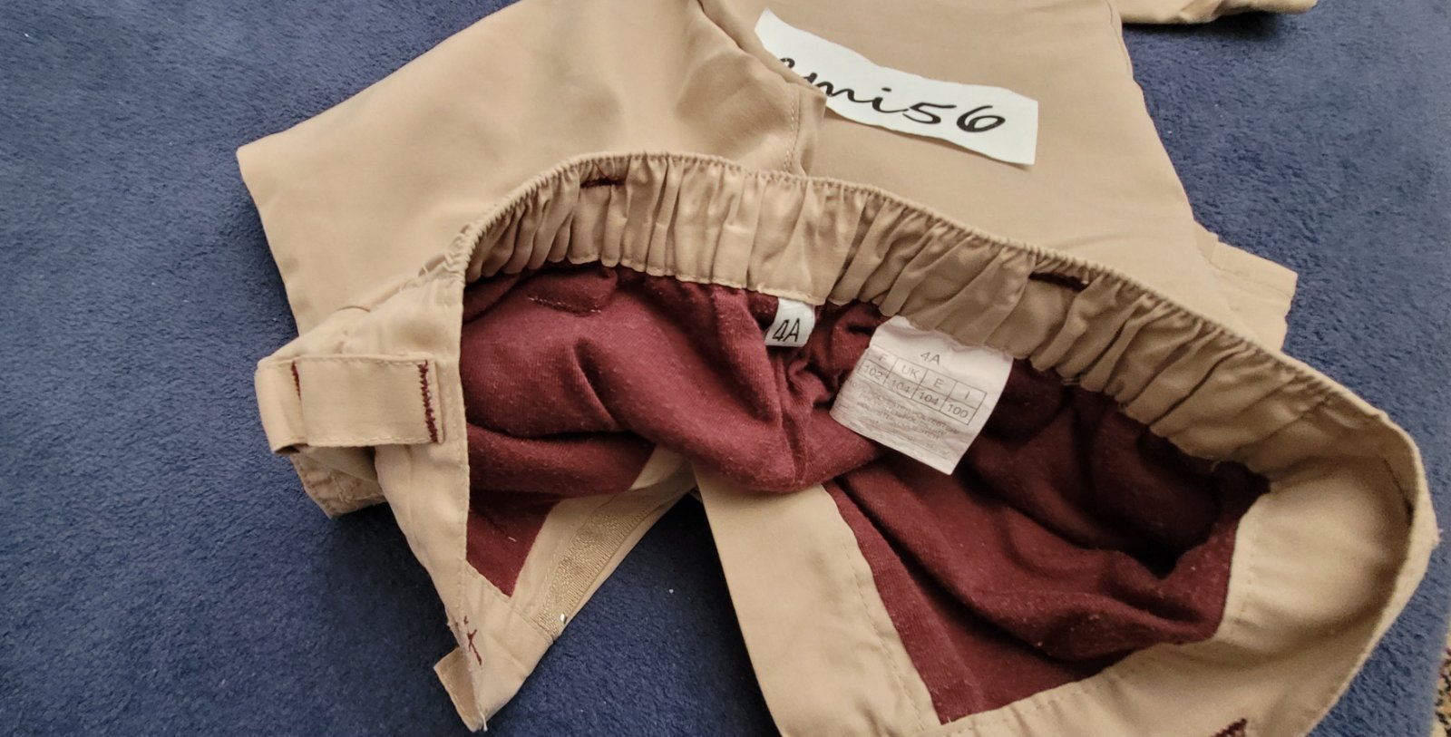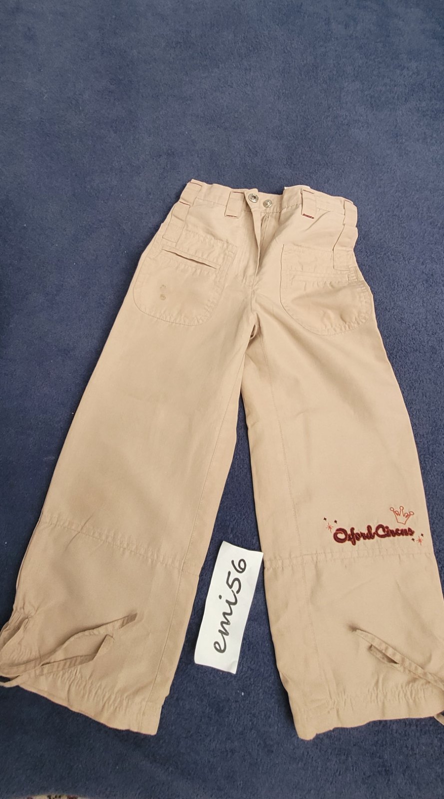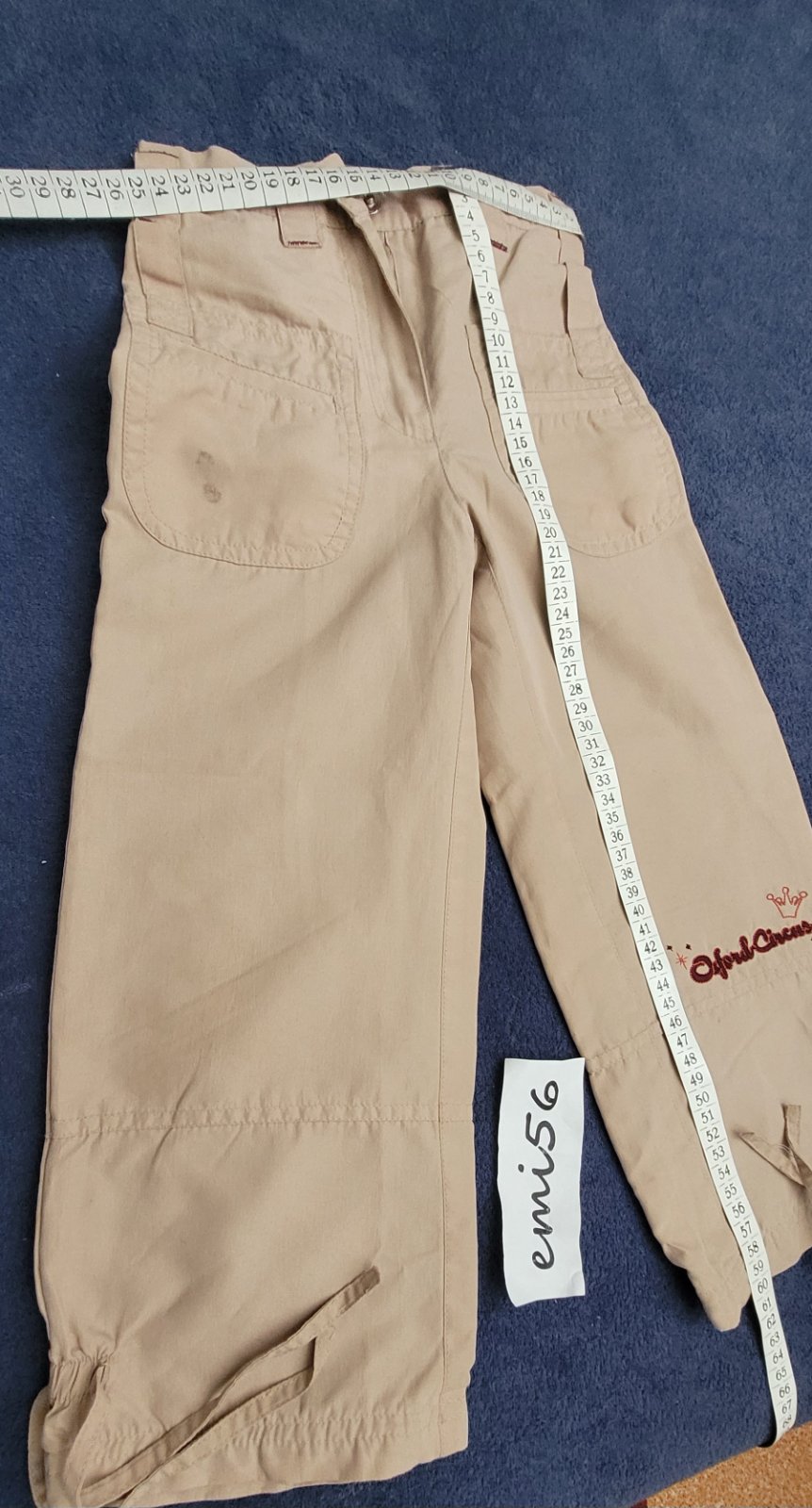 Veľ. 104, v pase je guma, s tenkou podšívkou, vpredu na vreckách malý fliačik – vid. Foto