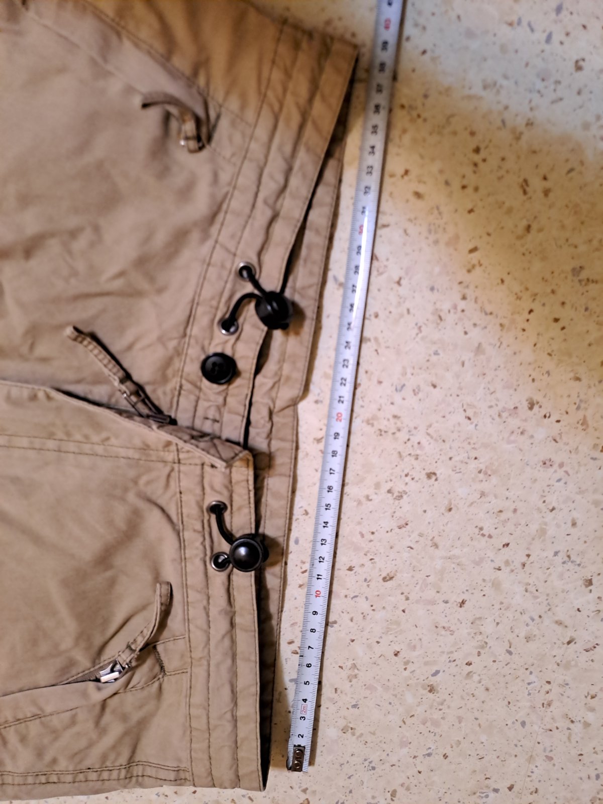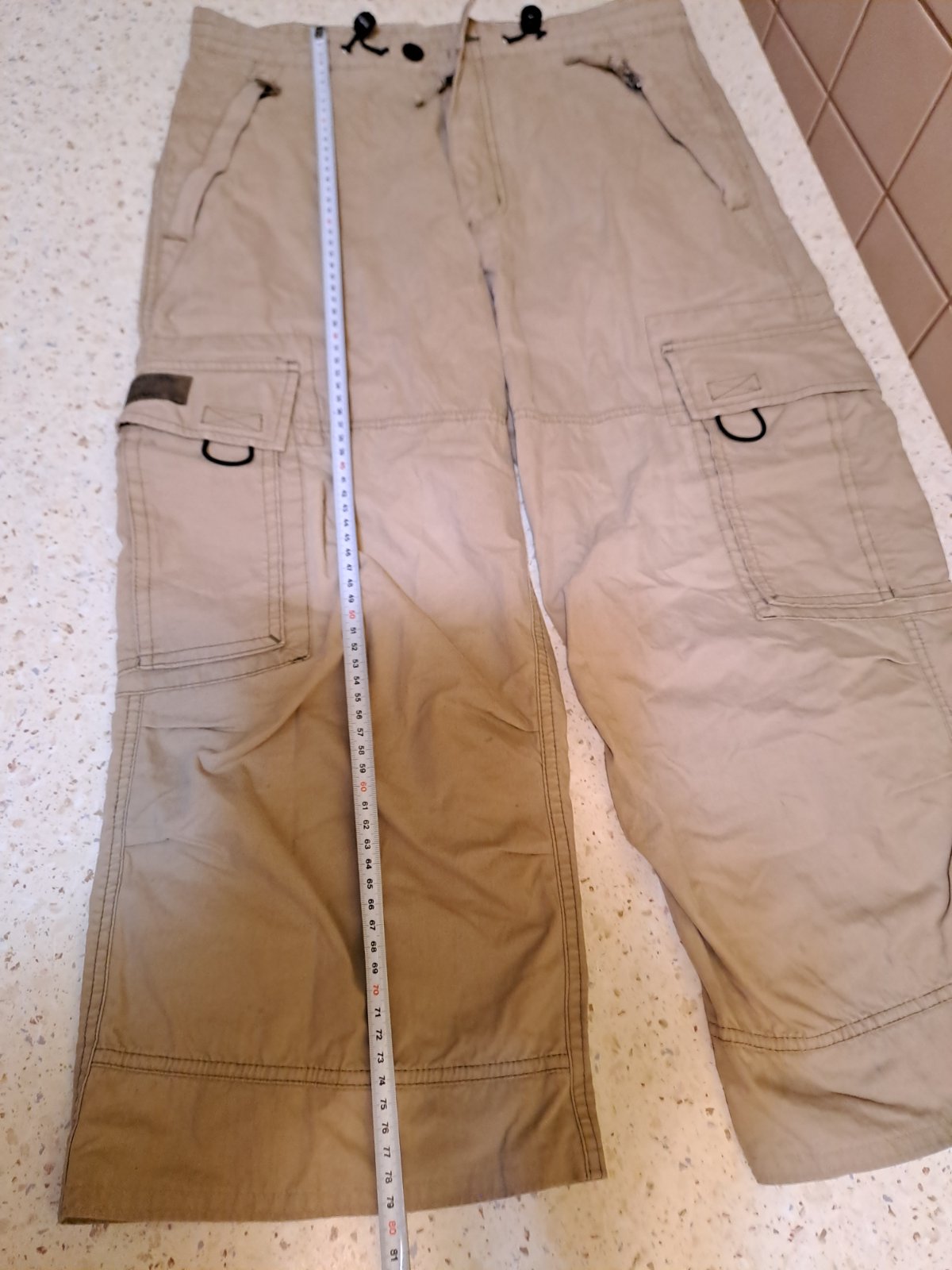 3/4 nohavice, materiál bavlna a polyamid/nylon. V zadnej časti nohavíc sú fľaky, pozri foto, zohľadnené na cene. Neviem či sedí veľkosť, rozmery sú na fotkách.
