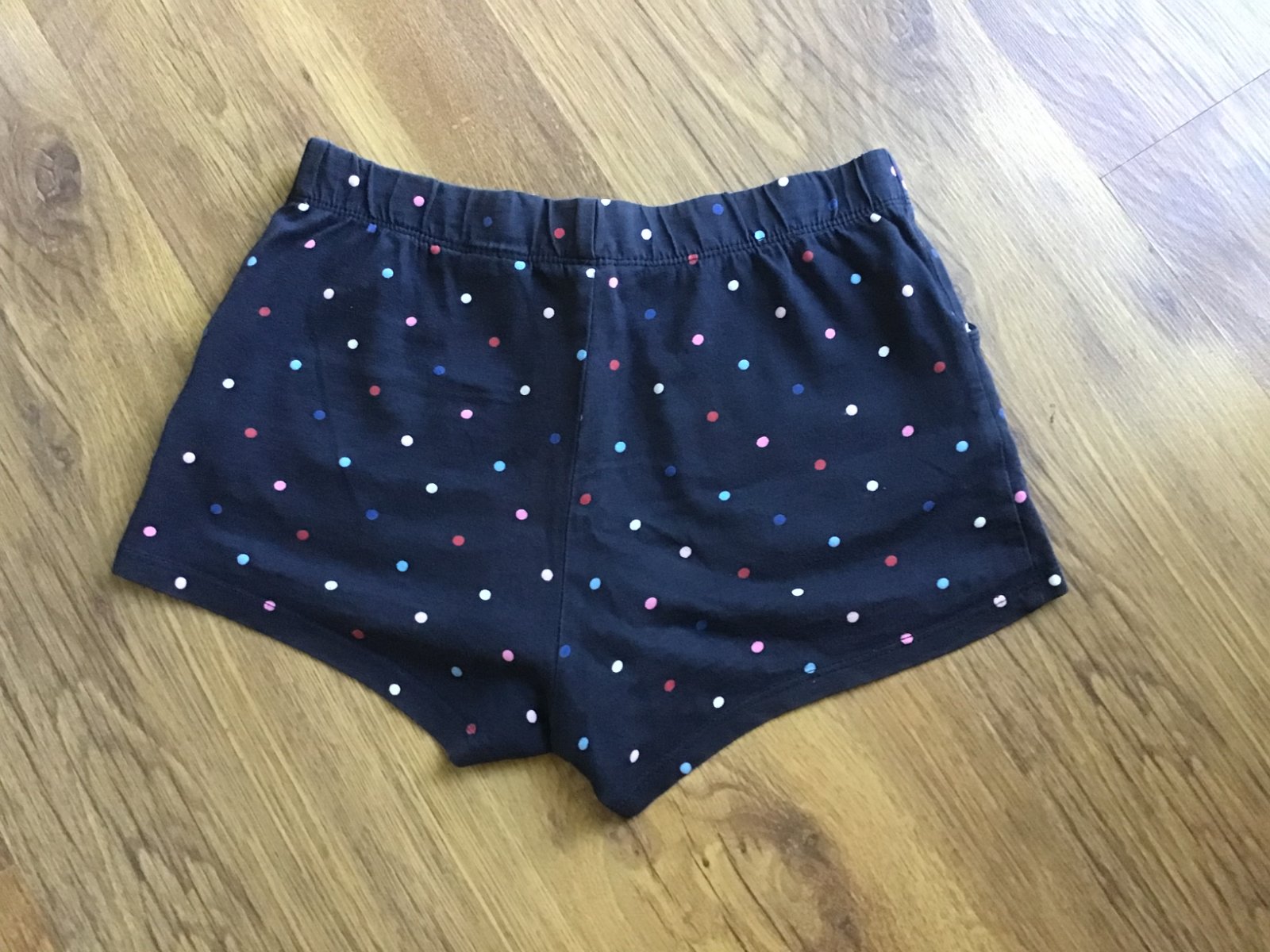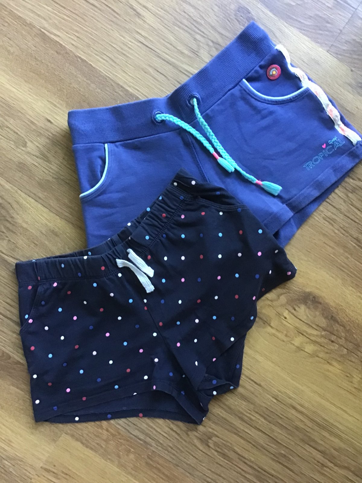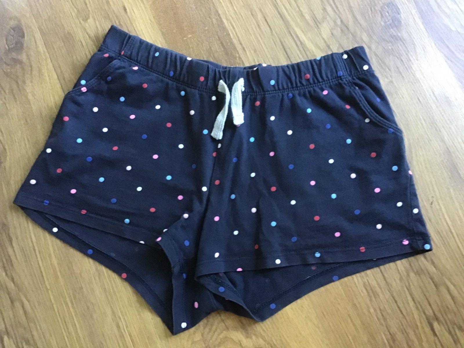1. Tmavomodre s bodkami H&M, vel.134, bez poskodenia, su tensie, maju mierne znamky prania na farbe.