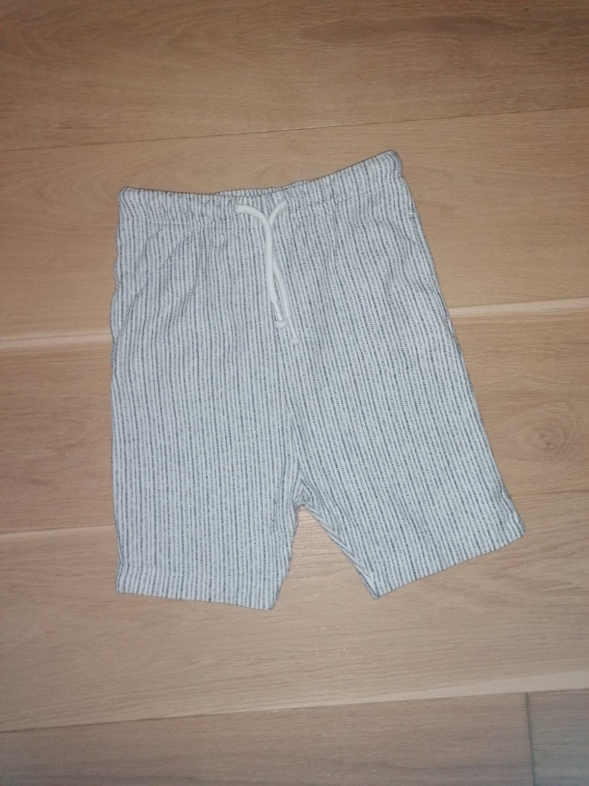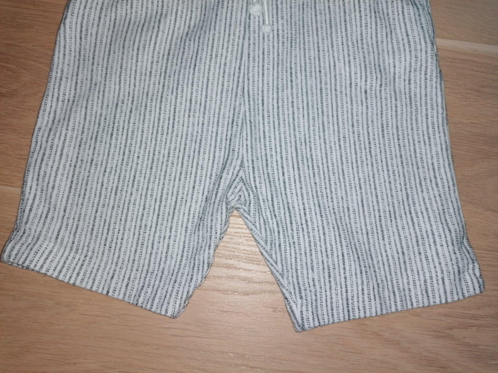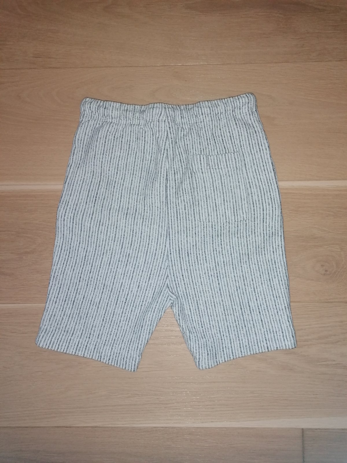 Kraťasy zn. Next veľ. 122, 100% bavlna, prírodná biela s tmavošedým pásikom, pás na gumu + šnúrky na stiahnutie, po bokoch dve vrecká, vzadu jedno.