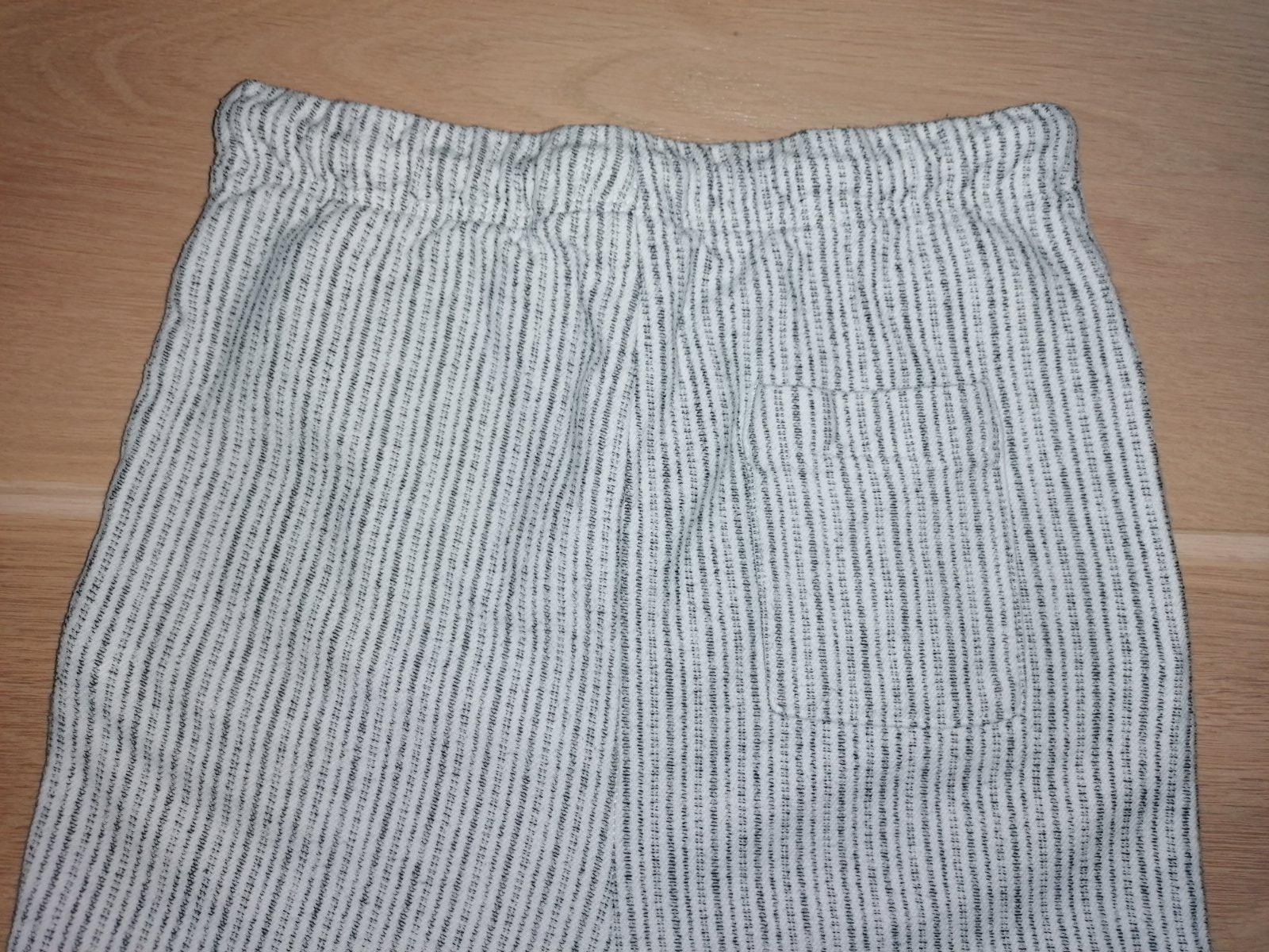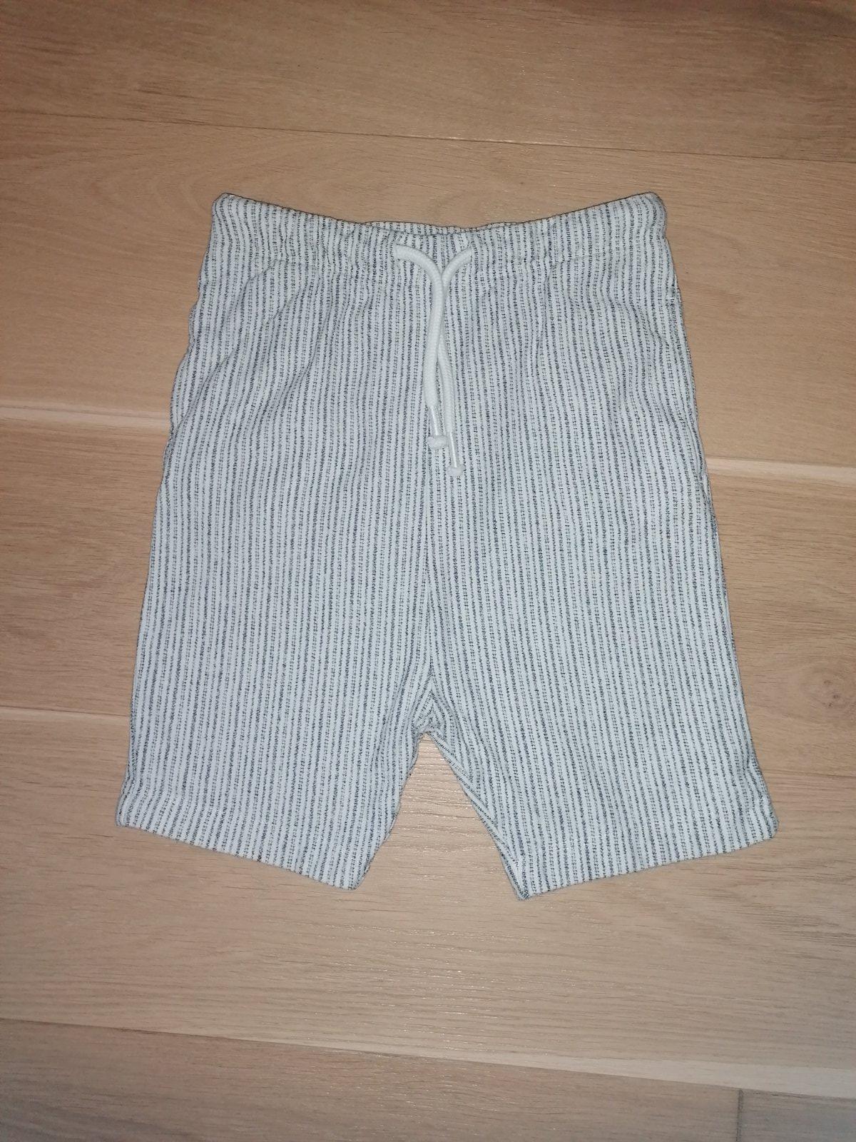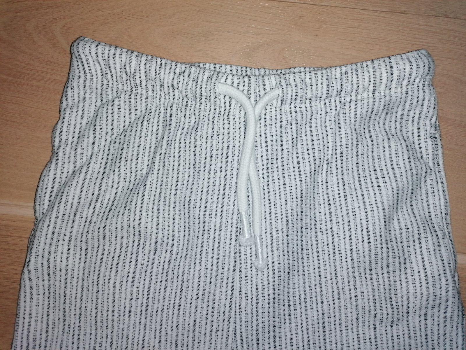 Kraťasy zn. Next veľ. 122, 100% bavlna, prírodná biela s tmavošedým pásikom, pás na gumu + šnúrky na stiahnutie, po bokoch dve vrecká, vzadu jedno.