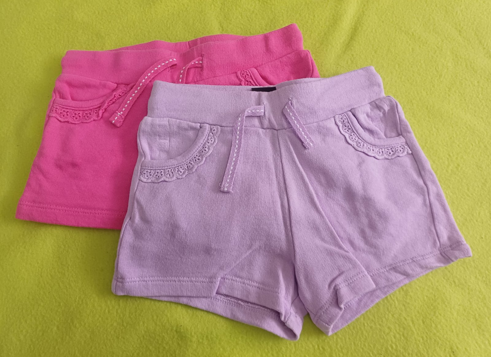 Šortky sú ružovej a fialovej farby, v páse majú gumičky.
