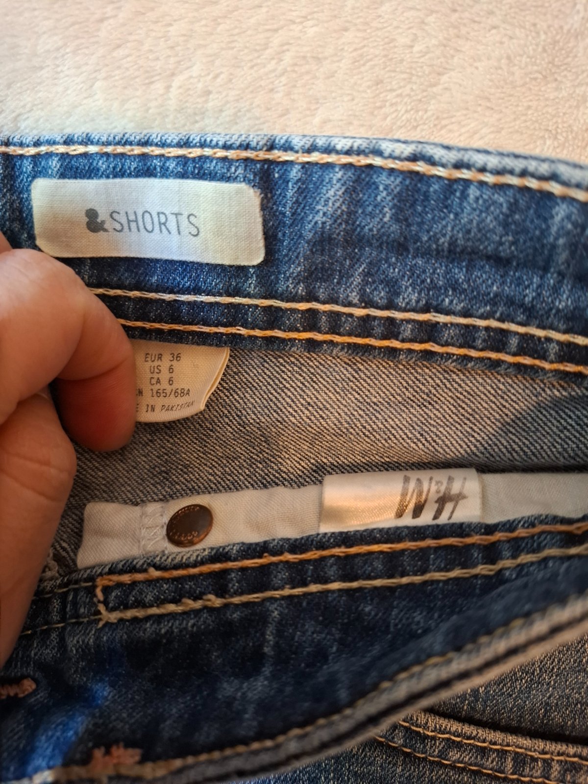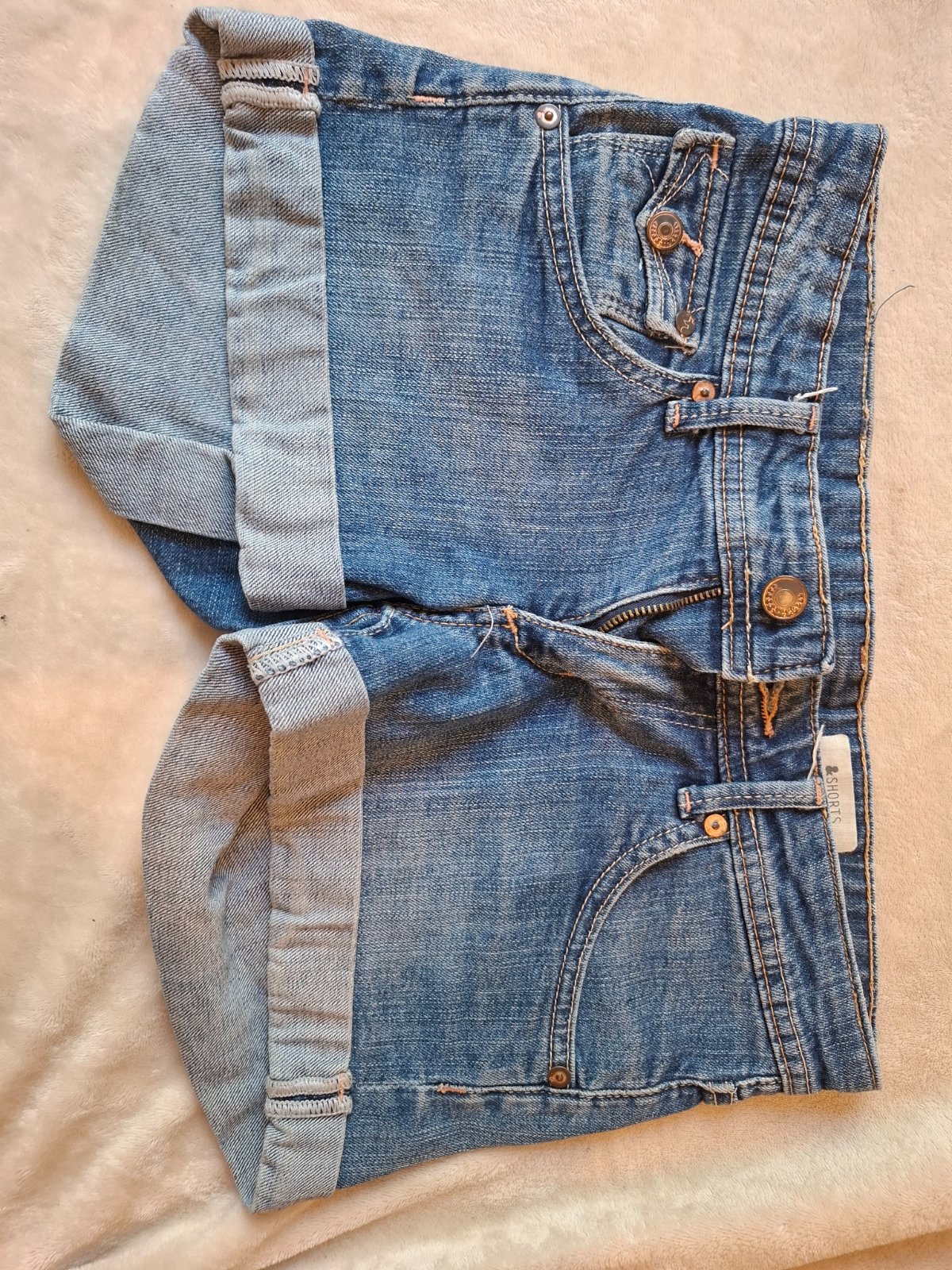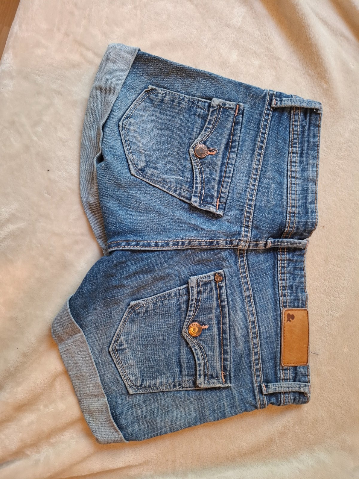 Pekné kraťasy z tenkej rifloviny, veľmi pohodlné. Veľkosť píše XS ale povedala by som skôr také M-ko. Pás 38,5cmx2, CD 67cm.