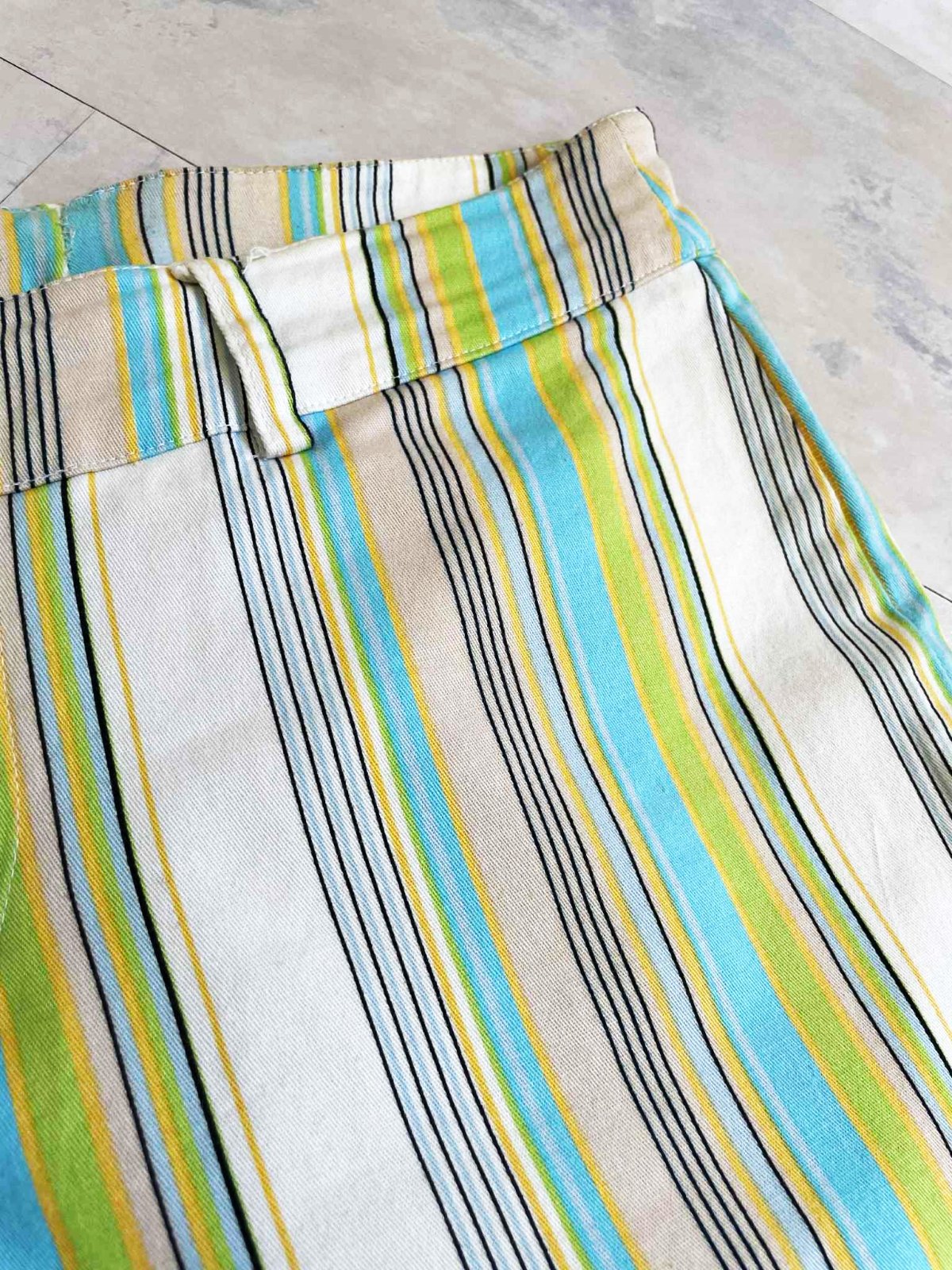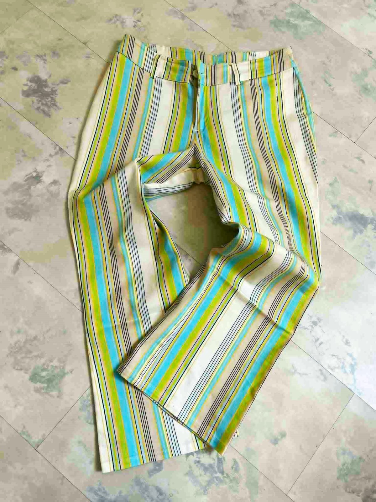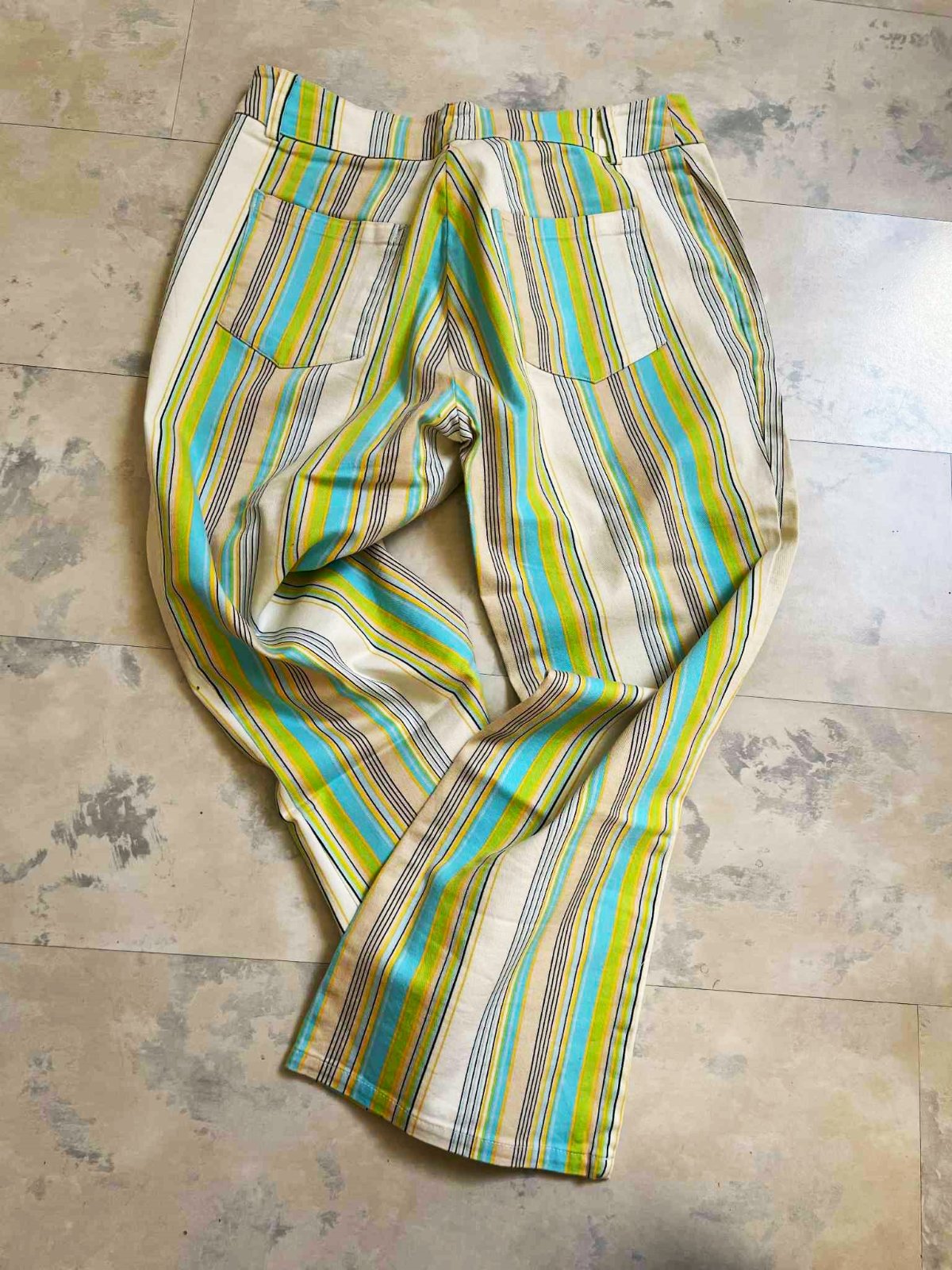 neznosené,kvalitné 3/4 nohaviceso strečom,dole rovné - jemne rozšírené,na spodku neobtiahnu nohu,veľmi pekné farby,prúžky krásne tvarujú a zoštíhľujú,top stav a kvalita,ako nové