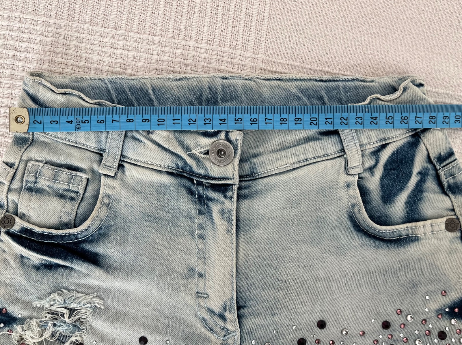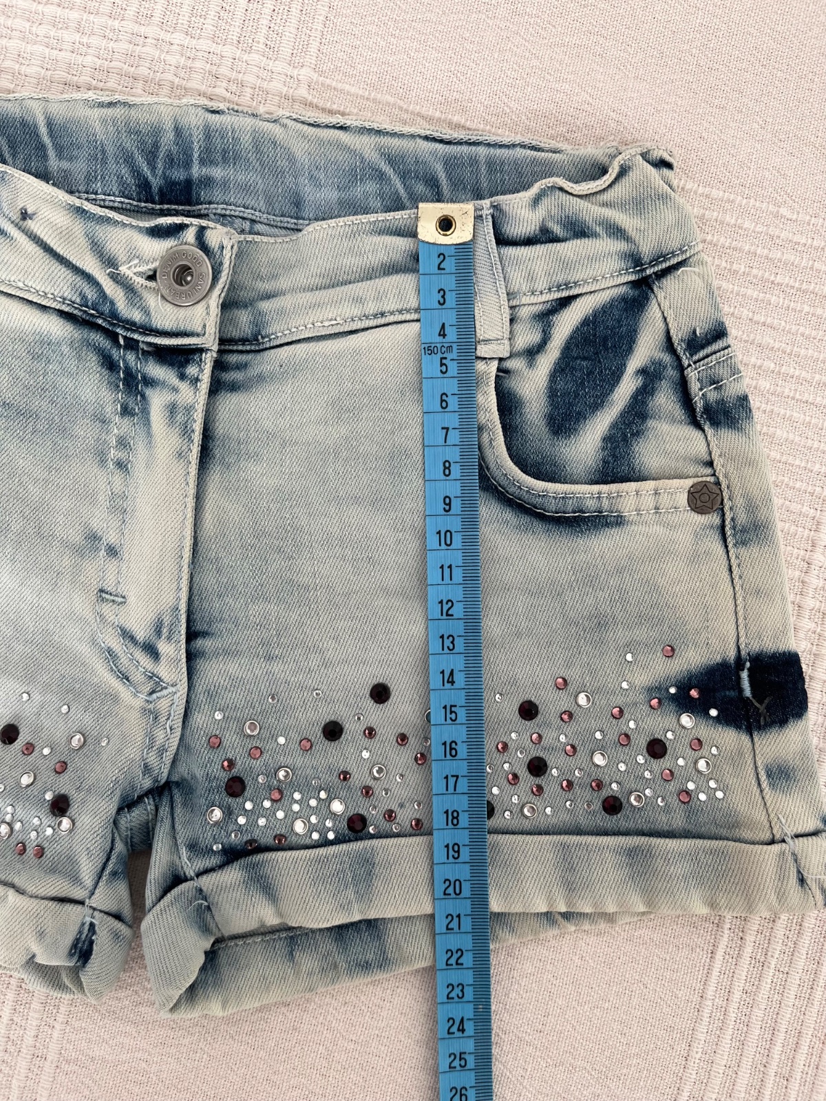 TOP STAV - Uzasne riflove kratasky zn.SANI, velkost 122, iba po mojej dcerke.Kamienky pevno drzia,neodlupuju sa.Pas je stahovaci.Super sadne aj spagetke.