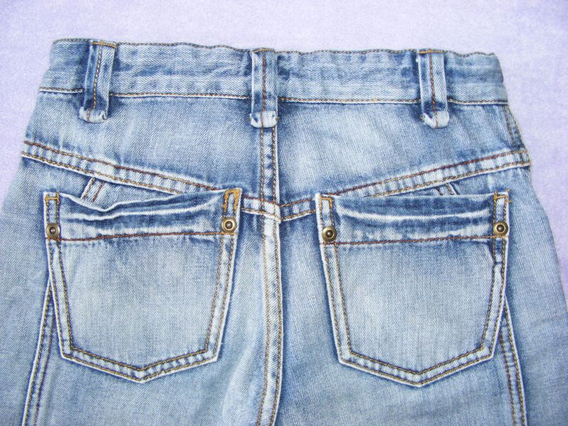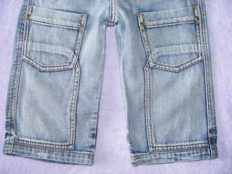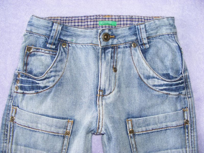 Rifľové bermudy zn. Benetton, zapínanie na zips a patent, v páse regulovateľná guma, funkčné vrecká.