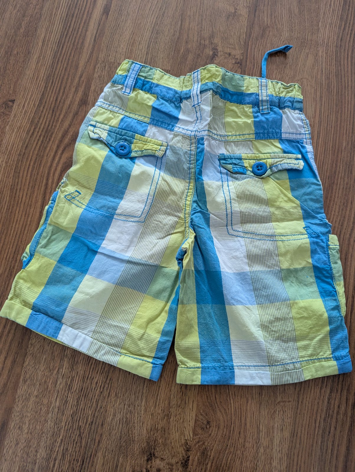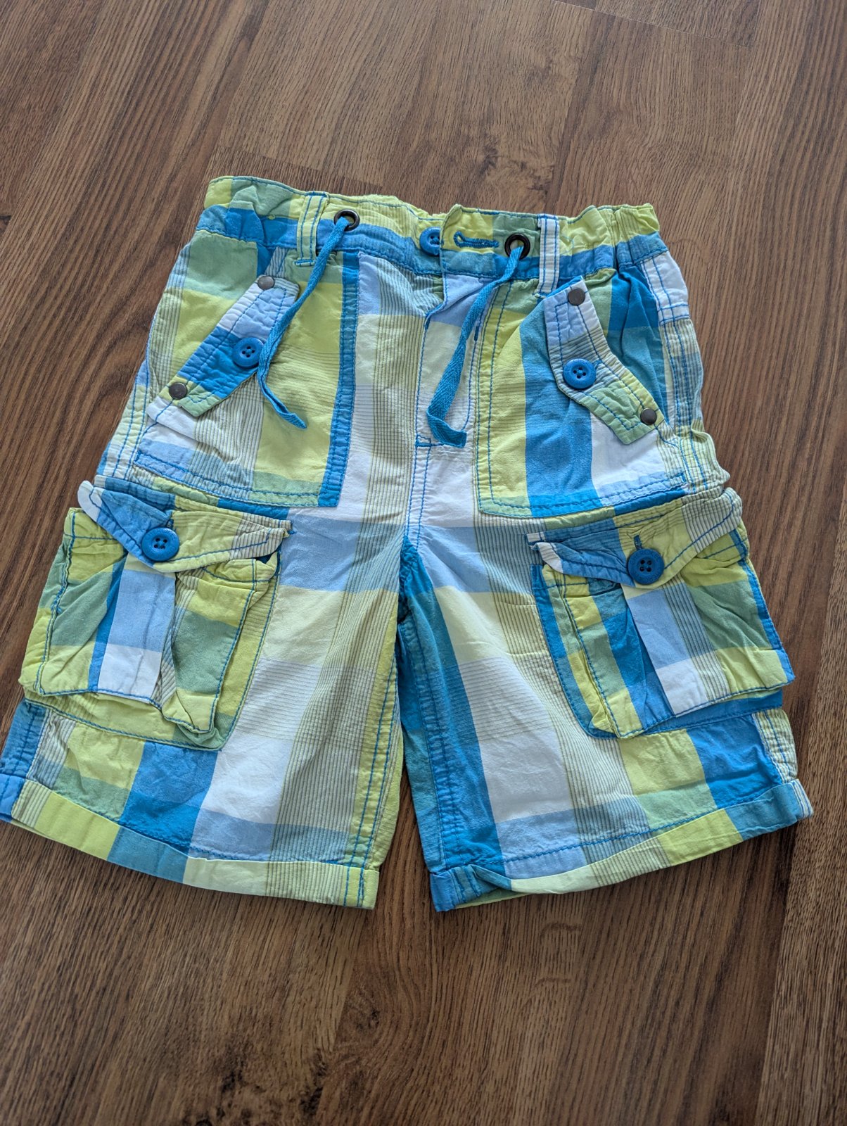 Krátke nohavice z ľahkého letného bavlneného materiálu, rýchlo vyschne na slniečku. Vonkajšie aj vnútorné vrecká, guma na prispôsobenie šírky v páse. Sú vo vynikajúcom stave, len na zadnom vrecku...