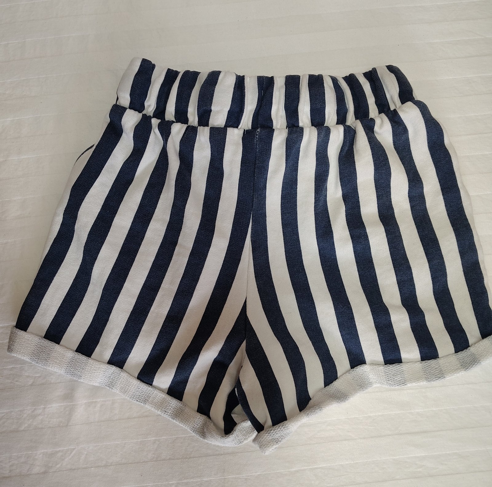 Dámske modro biele šortky pruhované šortky v námorníckom štýle, v páse na gumu, šnúrka na zaviazanie, vrecká, vhodné pre veľmi štíhlu postavu alebo staršie dievča.