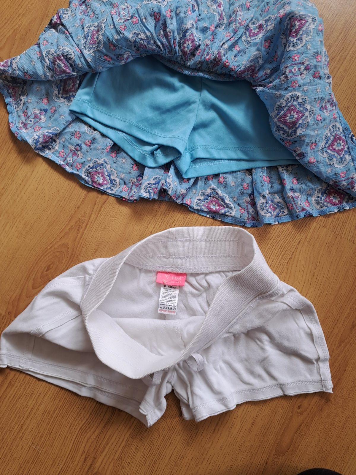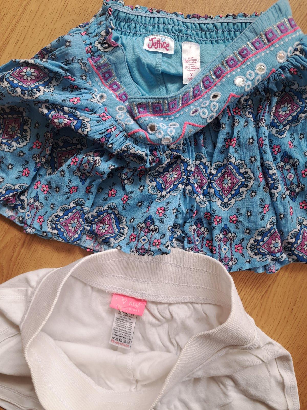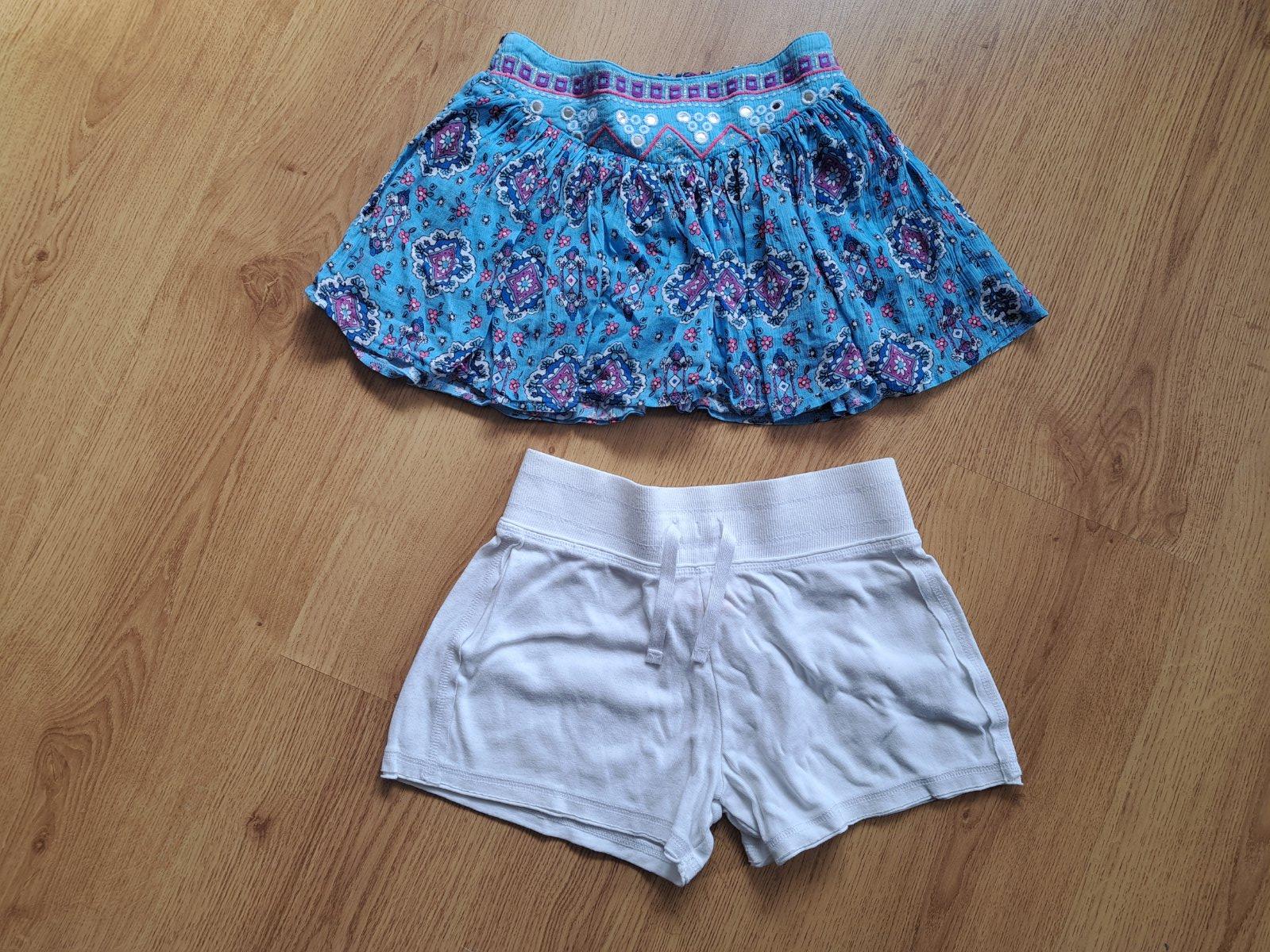 Biele nenosené, len opraté bavlnené kraťasky zn.Next a farebné vzdušné sukňové šortky zn.Justice a'la orientálna brušná tanečnica. Cena spolu