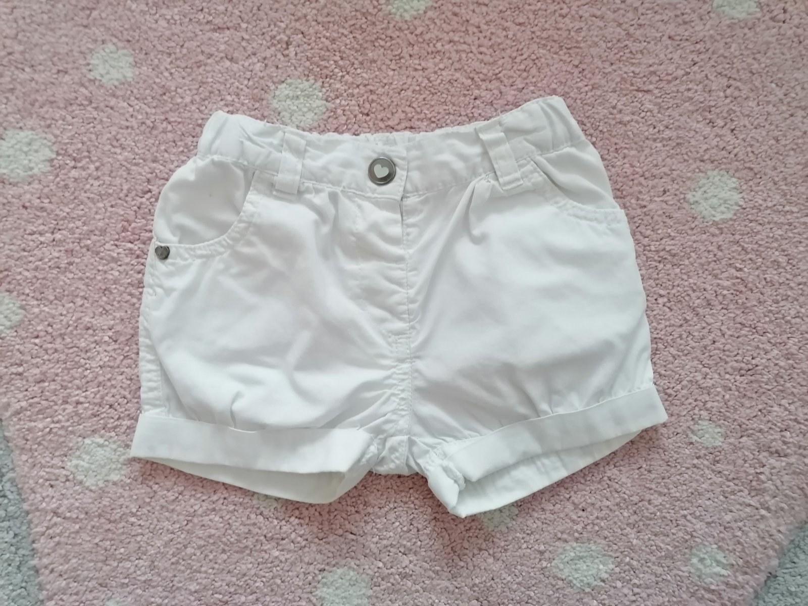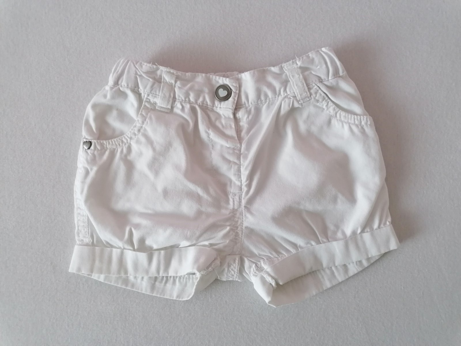 Biele ´elegantne´ letné kratasy, prijemny material, v páse nastavovacia gumicka. Velkost sedi na 74/80. Kratasy sa skvelo kombinuju napriklad s kvetinkovym bluzkovym body - kuk v inom inzerate.
