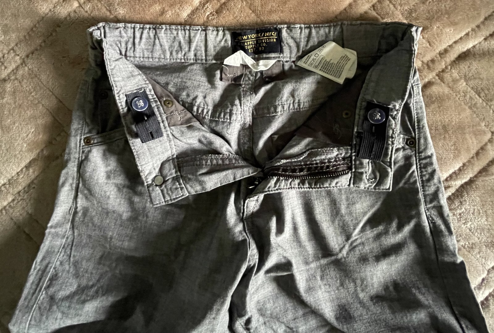 Chlapšenské krátke nohavice. (na 9-12 rokov). Zapínanie na gombík a zips. Rozmery: dĺžka 56 cm, spodná šírka nohavice 17 cm, šírka v páse 2x33 cm.