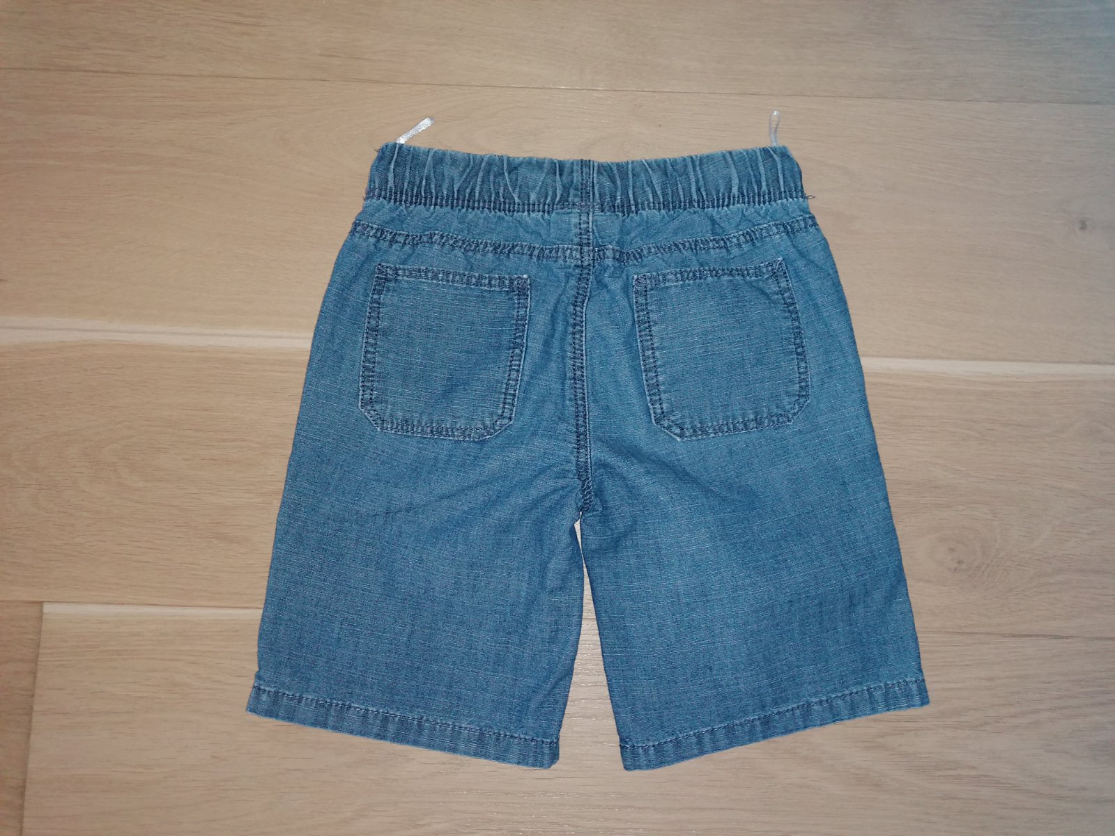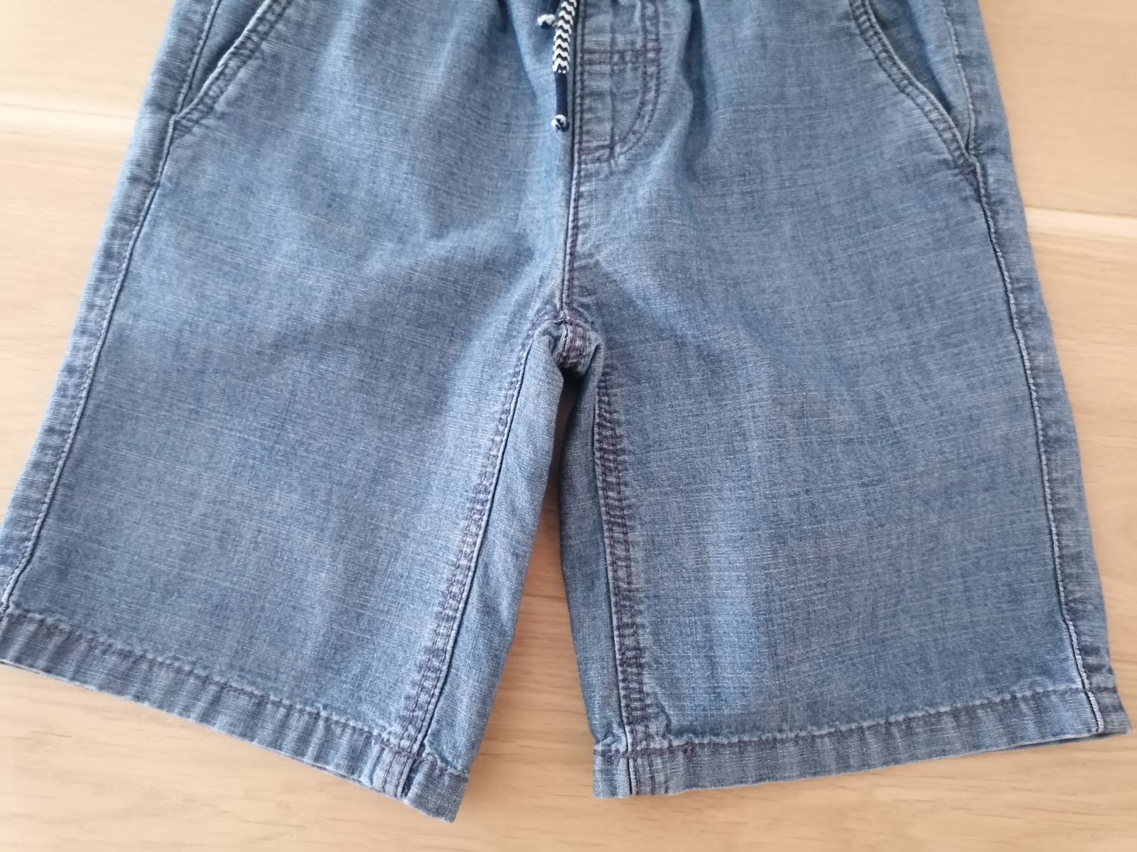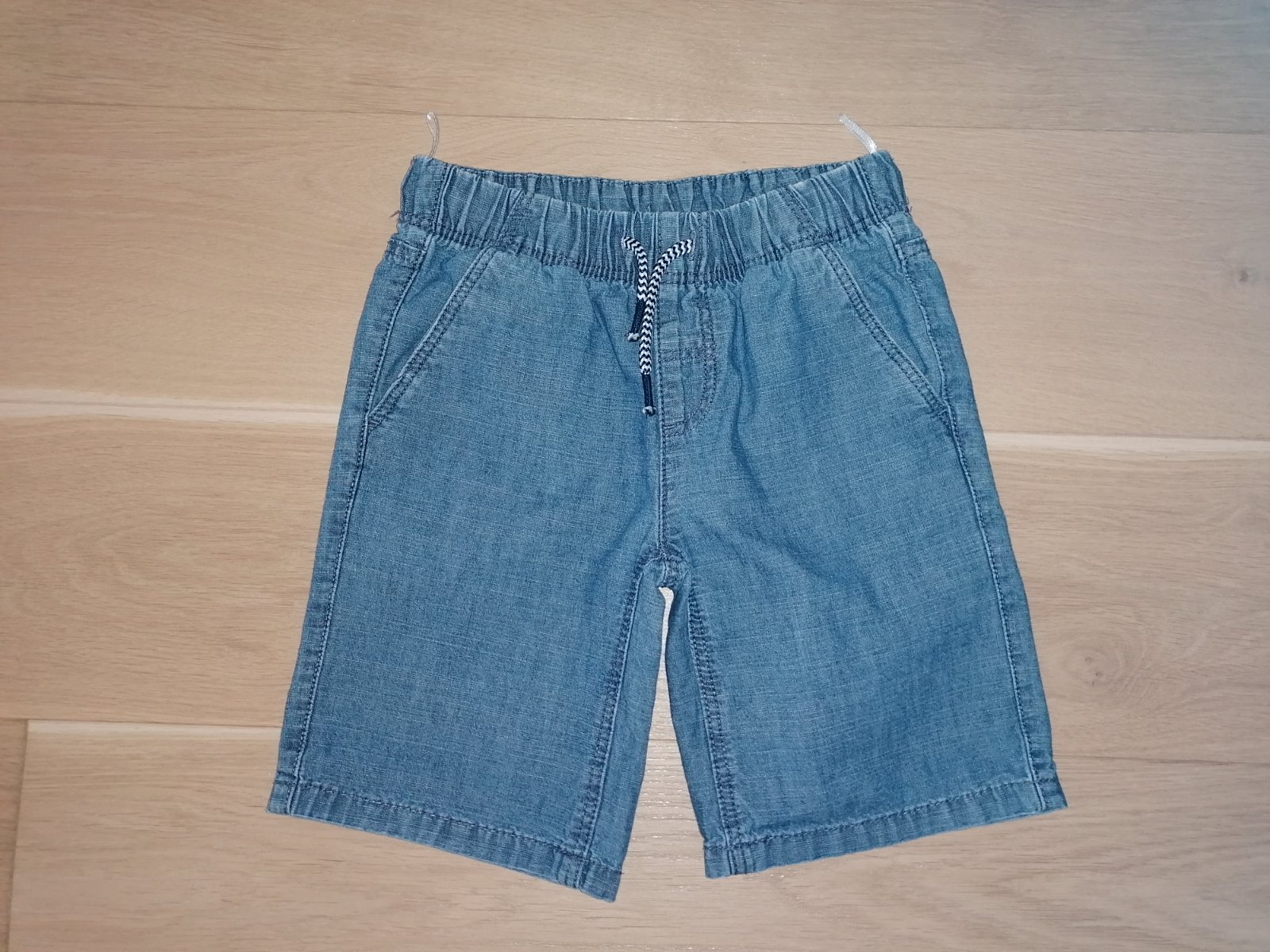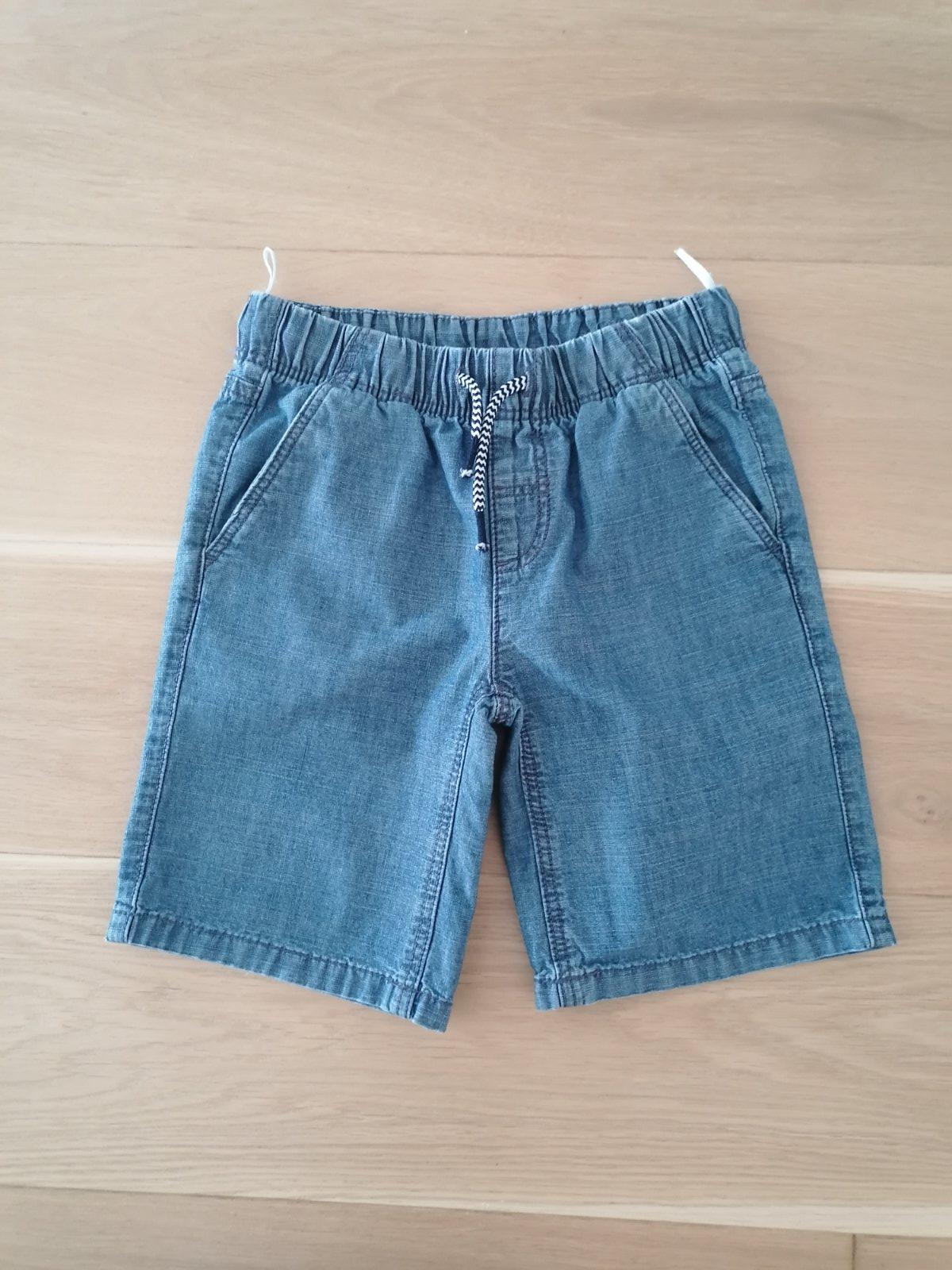 Kraťasy rifľového vzhľadu, tenšie, zn. C&A veľ. 122, 100% bavlna, pás na gumu + šnúrky na stiahnutie, vpredu aj vzadu vrecká.