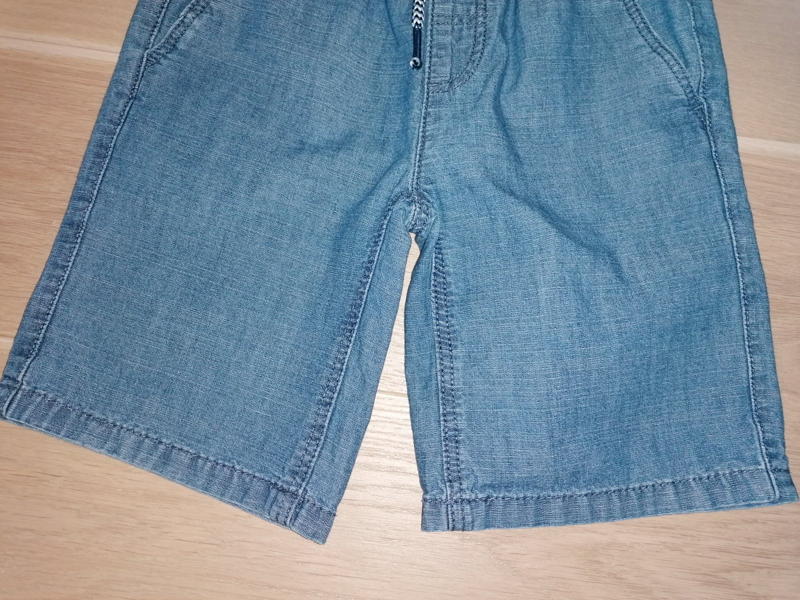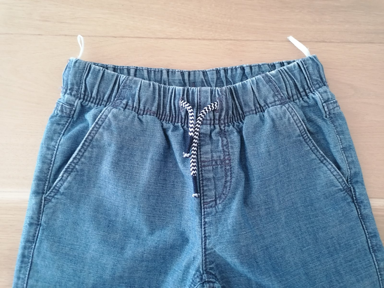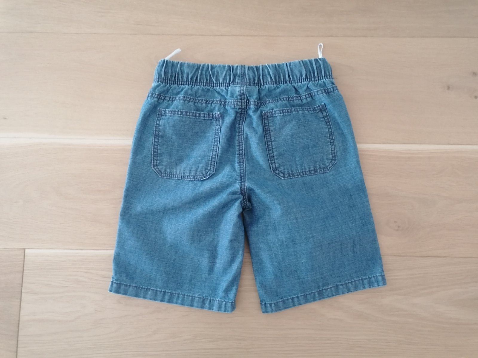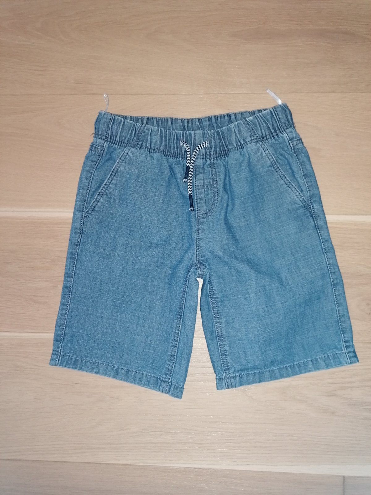 Kraťasy rifľového vzhľadu, tenšie, zn. C&A veľ. 122, 100% bavlna, pás na gumu + šnúrky na stiahnutie, vpredu aj vzadu vrecká.